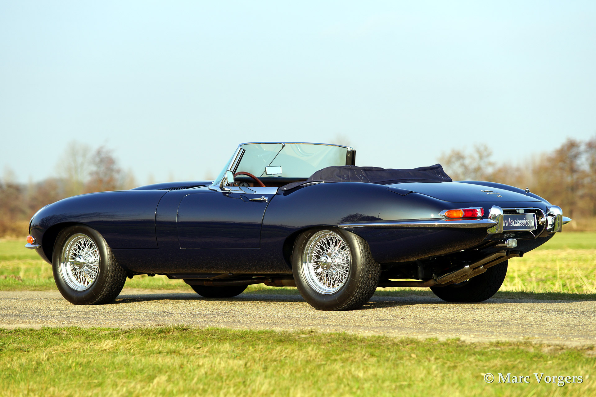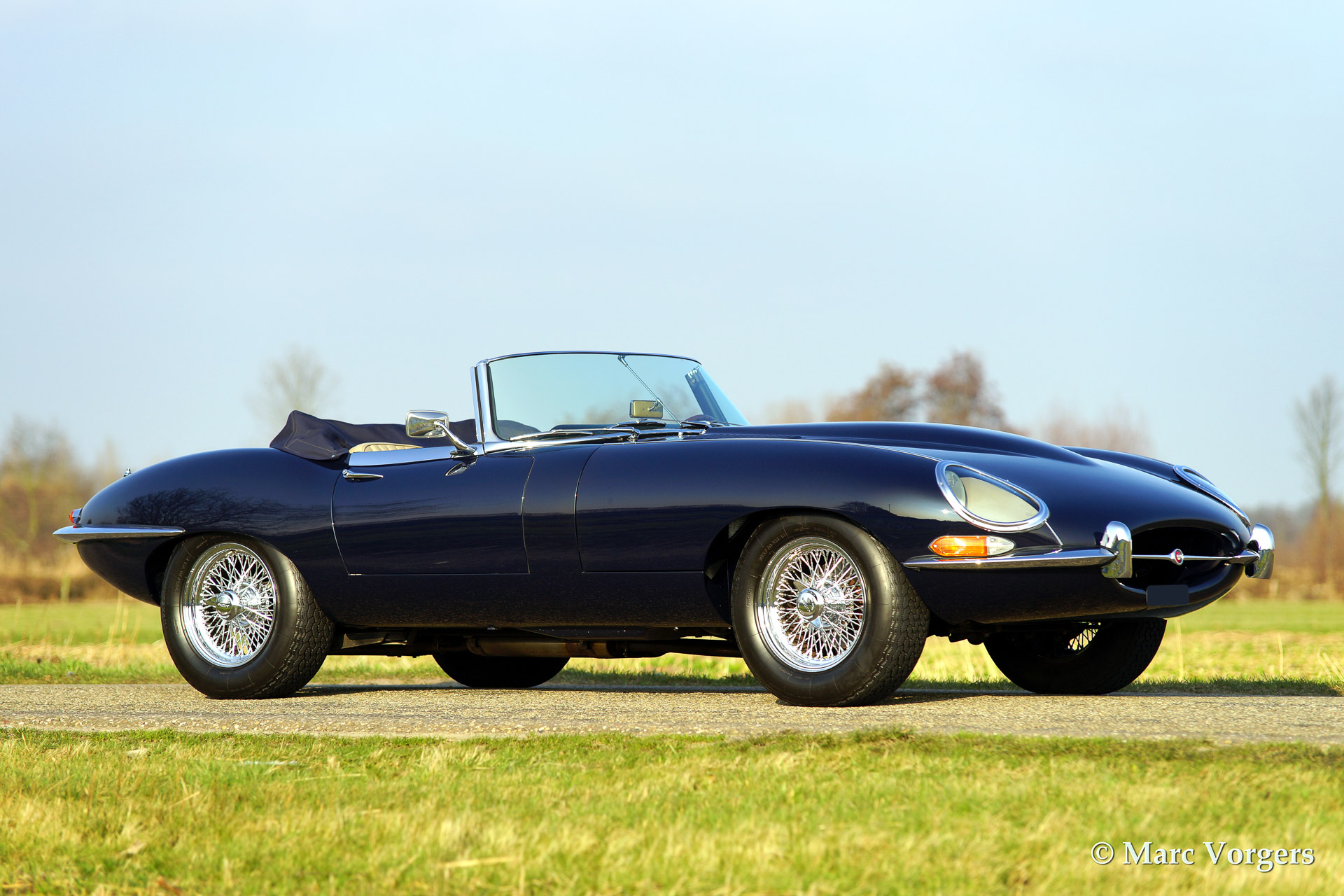 Jaguar E-type 4.2 Litre OTS (roadster) series 1, year 1965. Colour Royal blue with a tan (beige) leather interior. Blue mohair hood and hood cover. This magnificent E-Type was extensively restored in the years 2005/2006. The car features a 5-speed manual Getrag gearbox (modification), a modern type AC generator, electronic ignition, wide chrome wire wheels, power steering, wooden dashboard, Becker radio with satellite navigation and a steering wheel with wood rim.