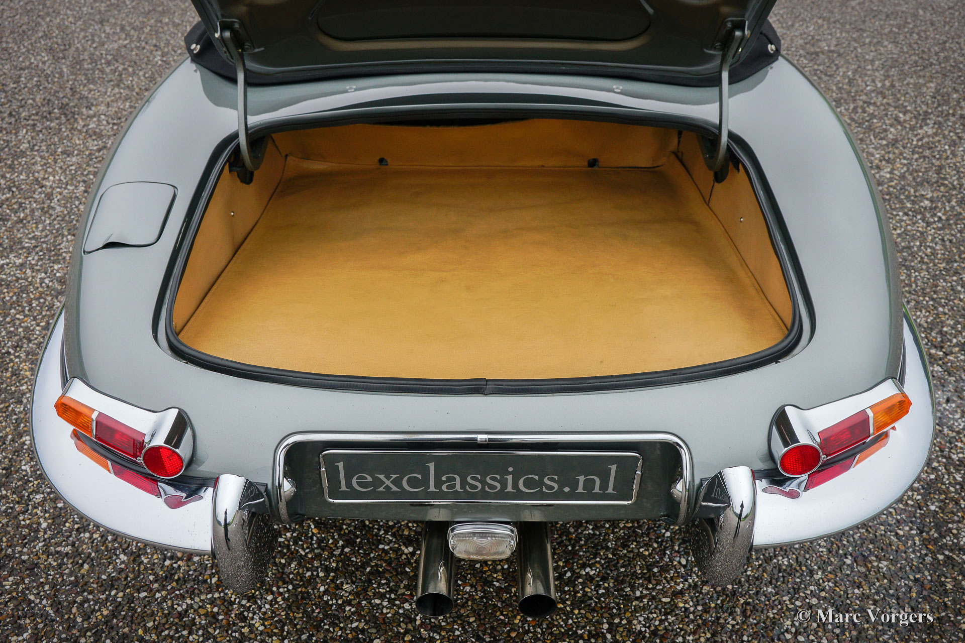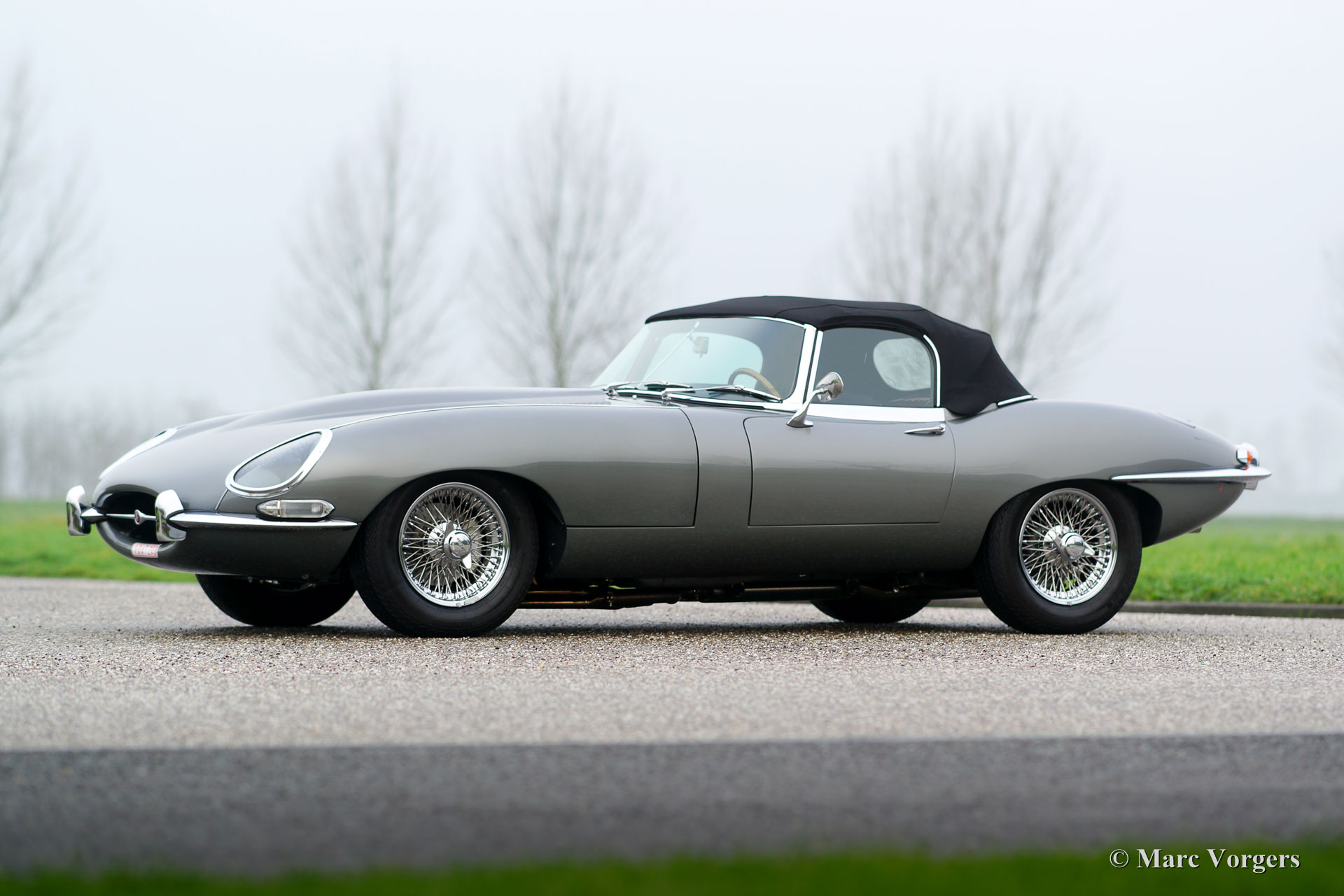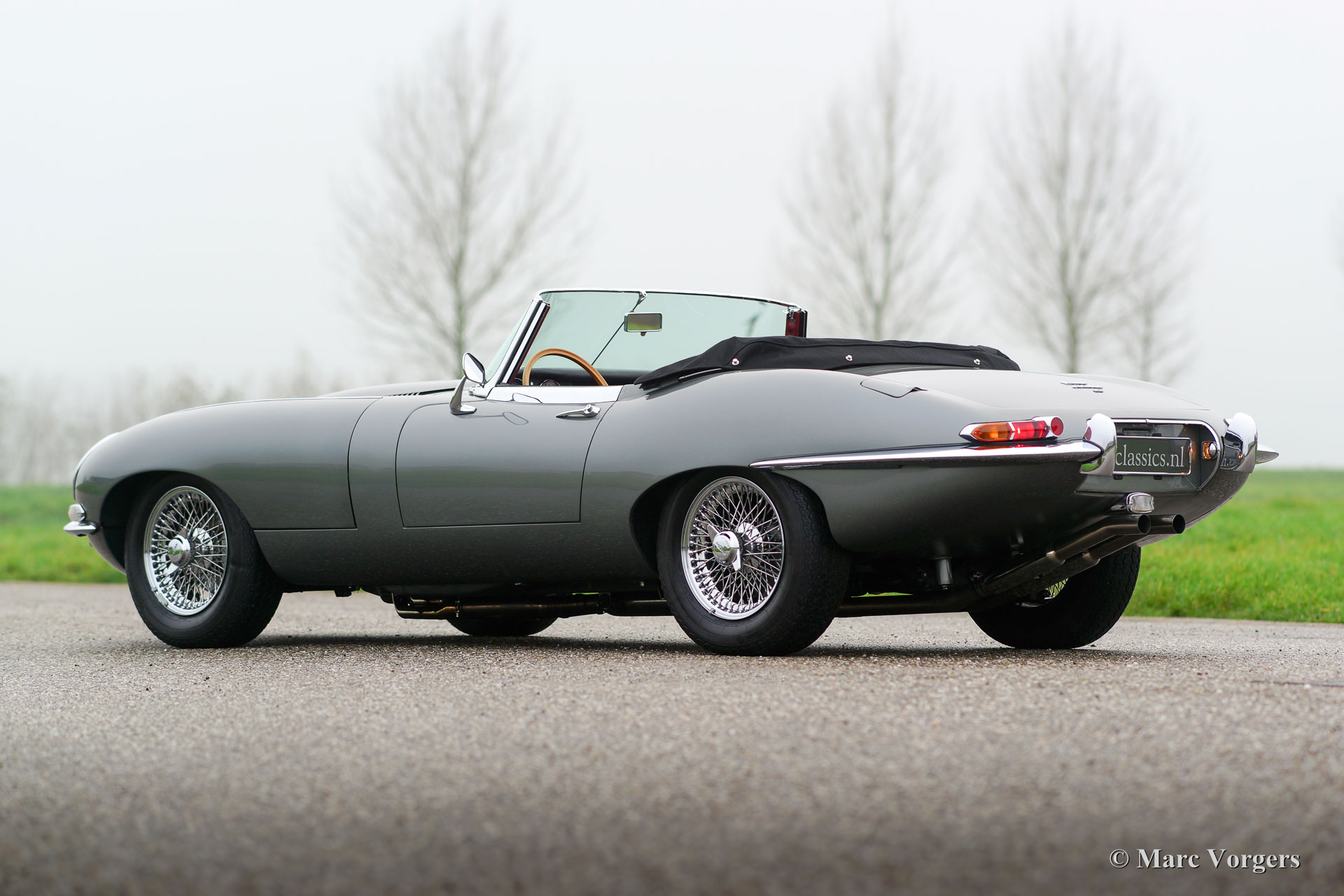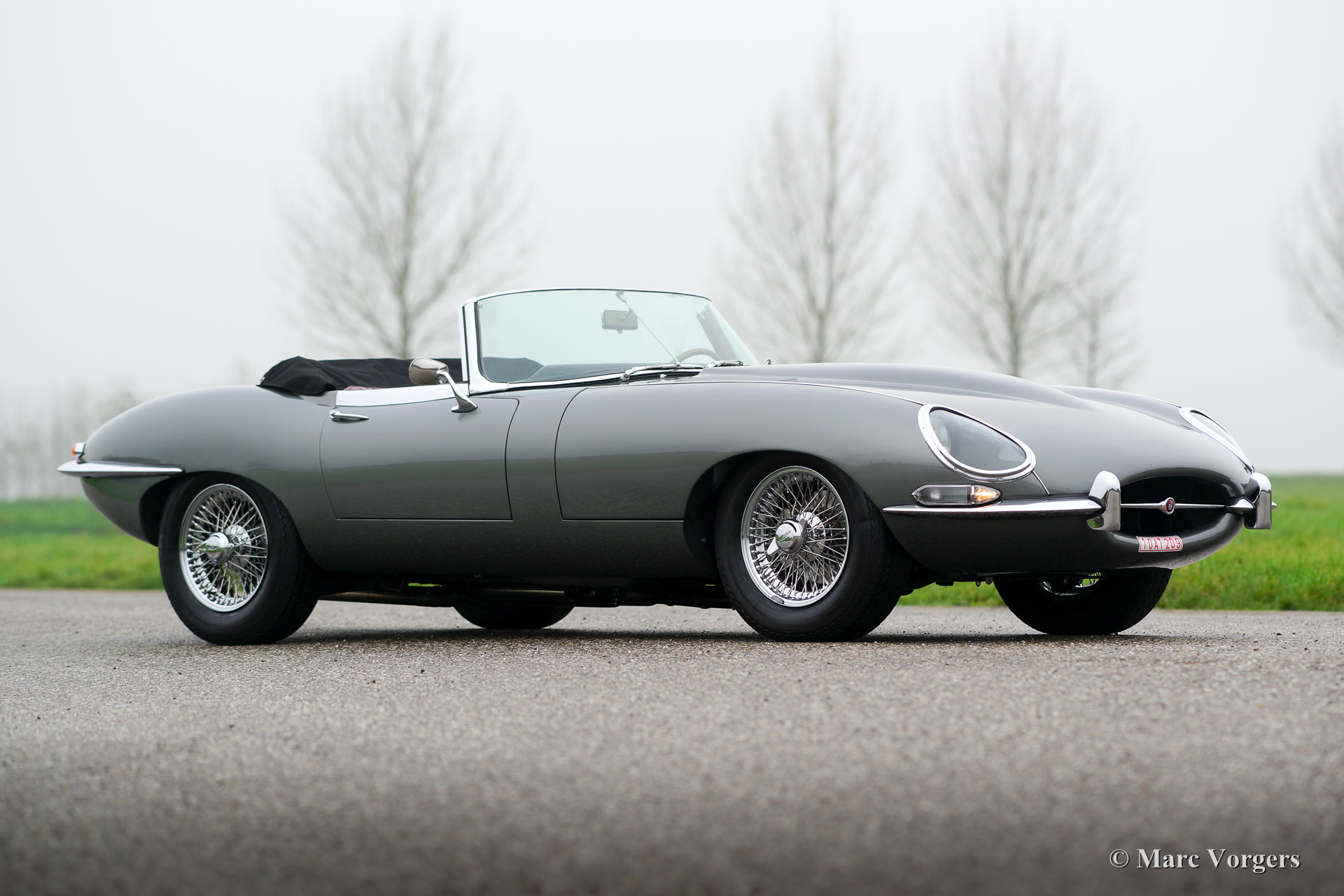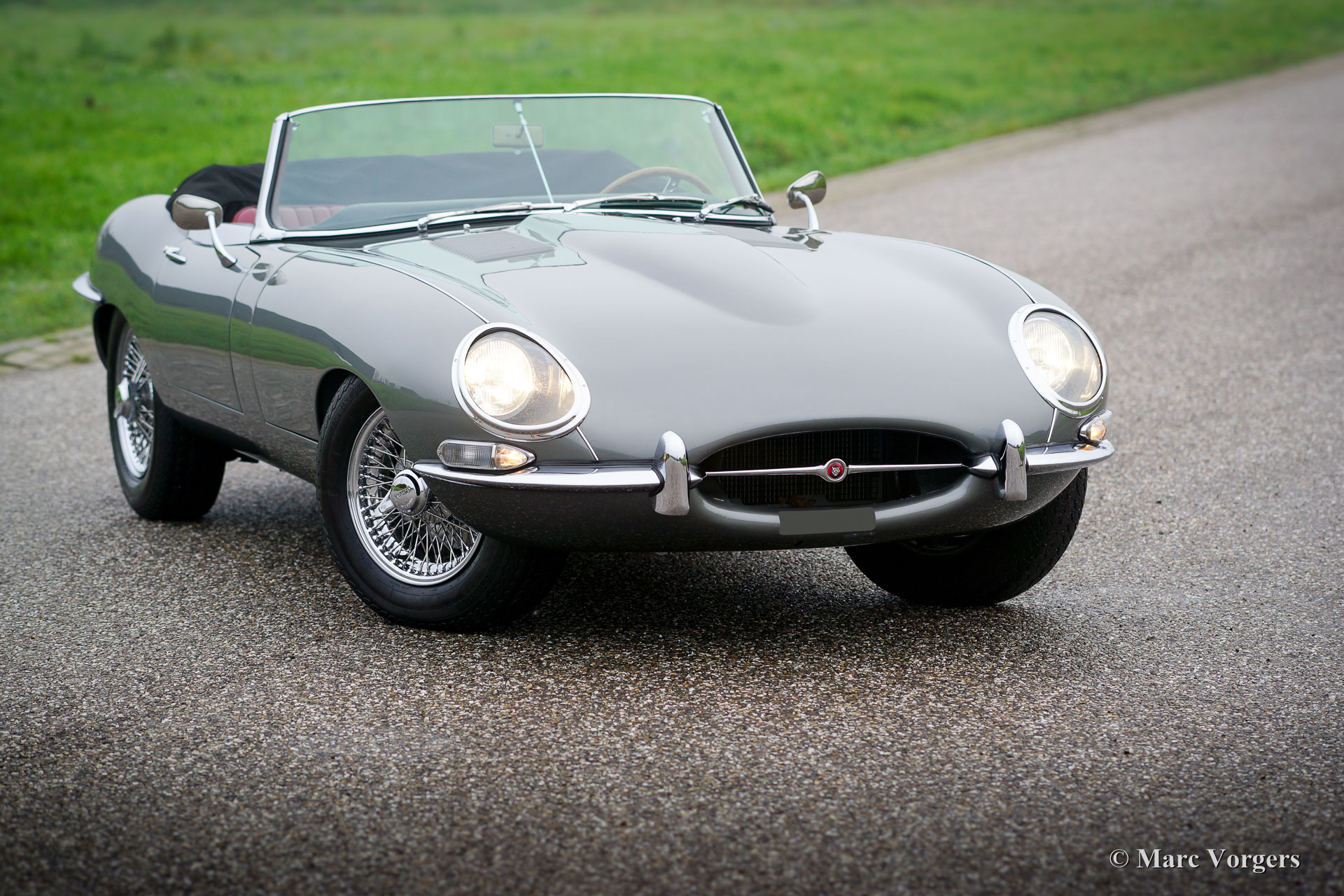 Jaguar E-Type 4.2 Liter OTS, Serie 1, Baujahr 1968. Farbe dunkelgrau metallic (Gun Metal Grey) kombiniert mit einer dunkelroten Lederausstattung und passendem Teppichboden. Schwarzes Mohair-Verdeck und Kapuze. Dieser gewaltige Jaguar E-Type 4.2 Liter OTS (Open Two Seater auch Roadster genannt) wurde in den USA neu verkauft. Im Jahr 2005 wurde das Automobil in die Niederlande importiert. Dann wurde das Auto ausgiebig und perfekt restauriert und zu einem hohen Standard überholt. Dieser E-Type ist in einem Top-Zustand! Die Karosserie wurde von Martin Robey restauriert und der Motor wurde von der renommierten niederländischen Firma van Giersbergen überholt. Eine Fotoreportage der Restaurierung ist ebenso vorhanden wie ein "Heritage" -Zertifikat. Das Auto erhielt einige wünschenswerte Modifikationen, ausgestattet mit: drei Weber-Doppelvergasern, einem ‘Big Bore‘-Edelstahlauspuff, einem Fünfgang-Getriebe, K & N-Sportluftfiltern, einem Sperrdifferenzial und einer 123-Zündung. Ein serienmäßiger E-Type ist ein kraftvolles und sehr schnelles Auto, die Modifikationen machten diesen Jaguar zu einer sehr spektakulären Fahrmaschine! Darüber hinaus ist das Auto ausgestattet mit verchromten Speichen Rädern, verchromten "knock-off" Radmuttern, einer Wechselstrom Lichtmaschine, Sitzheizung und einem schönen MotoLita-Lenkrad mit Holzkranz. Dies ist ein sehr beeindruckender Performer, mit einer hervorragenden Auspuffnote, in Top-Zustand!