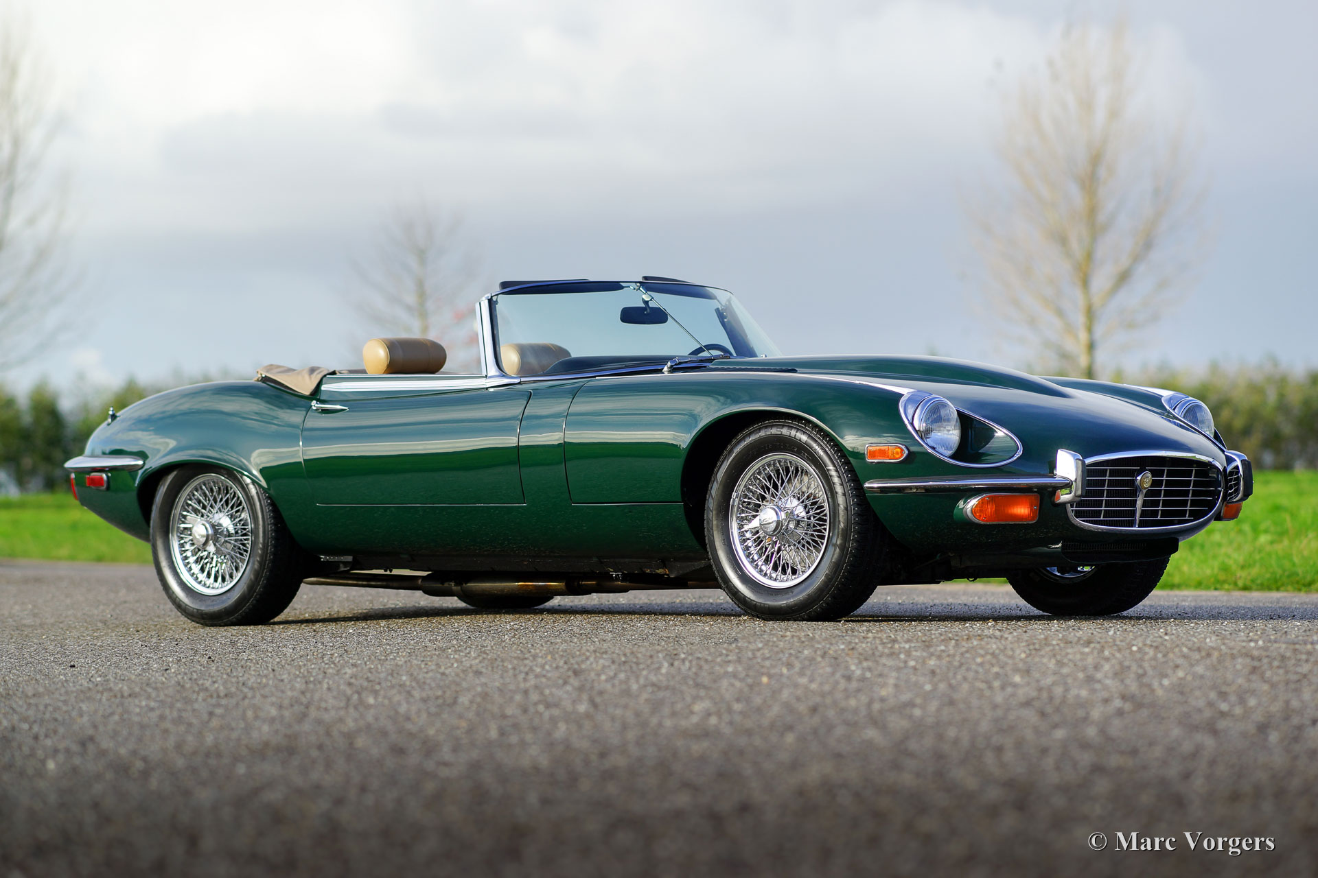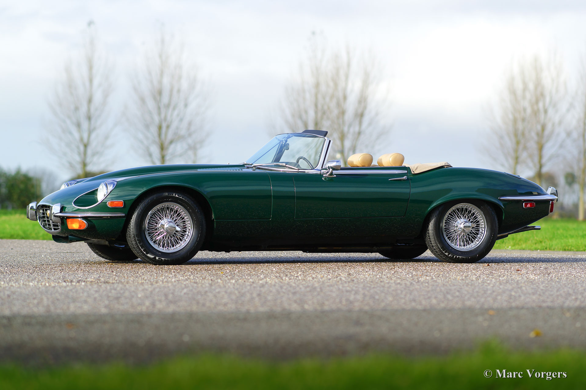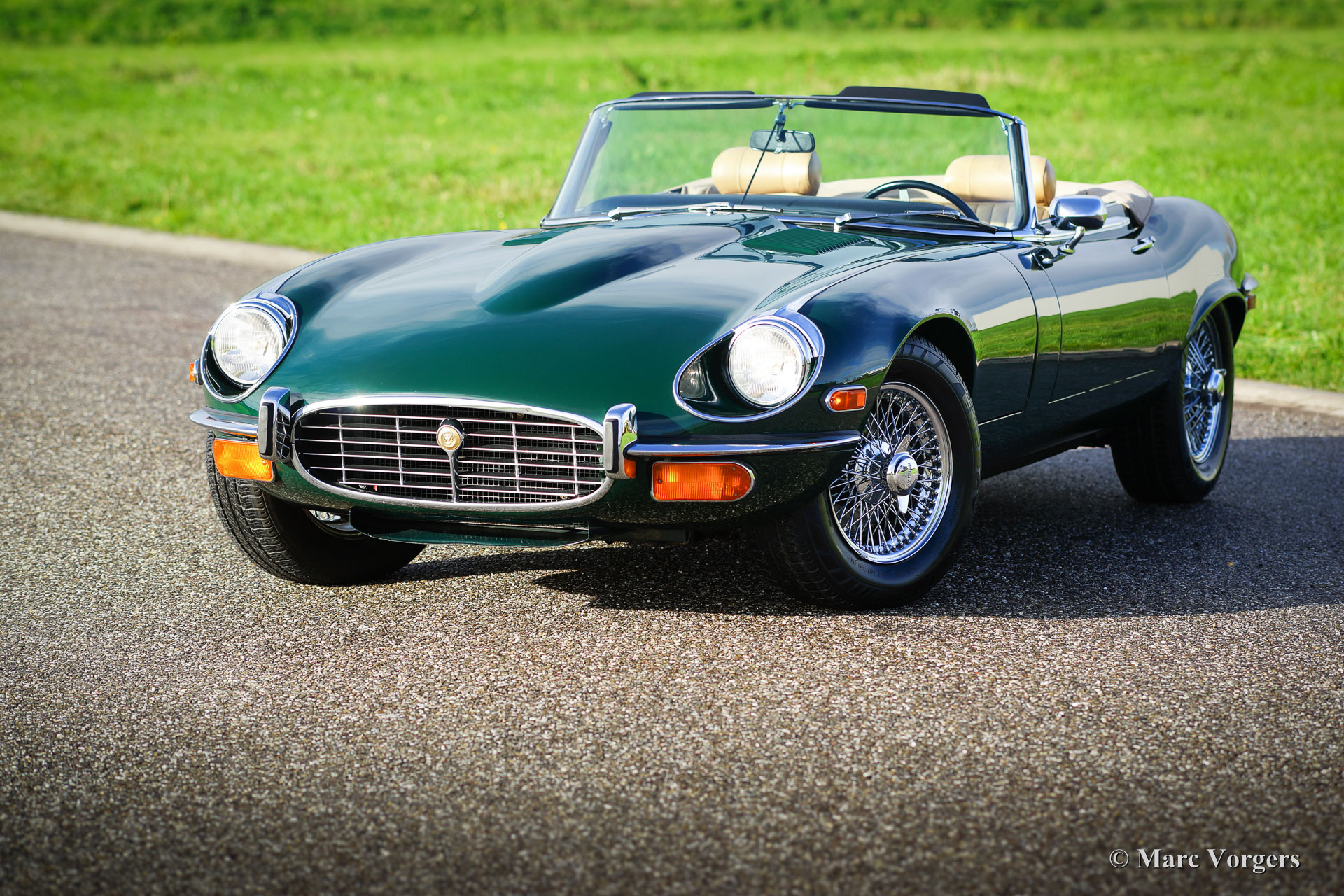 Jaguar E-Type V12 Serie 3 Roadster, Jahr 1973. Farbe British Racing Green mit einem beigefarbenen Lederinterieur und beigefarbenem Teppich. Dieser beeindruckende E-Type V12 Roadster wurde in den USA neu verkauft. Das Auto wurde im Jahr 2016 in die Niederlande importiert. Seitdem wird das Auto von Lex Classics gewartet. Das Auto wurde umfassend gewartet und alles ist auf dem neuesten Stand. Dieses super fahrende E-Type ist in sehr gutem bis exzellenten Zustand und das Auto zeigt alle originalen Details. Sehr wünschenswert ist das Vorhandensein eines manuell betätigten Getriebes, dieses Getriebe lässt Sie den leistungsstarken V12-Motor in vollen Zügen genießen! Das Automobil verfügt über Klimaanlage, Servolenkung, verchromte Speichenräder, Chrom ‘knock-off‘ Radmuttern und eine Periode korrektes British Leyland-Radio. Der letzte und sehr begehrte Vertreter der legendären Jaguar E-Type Serie!