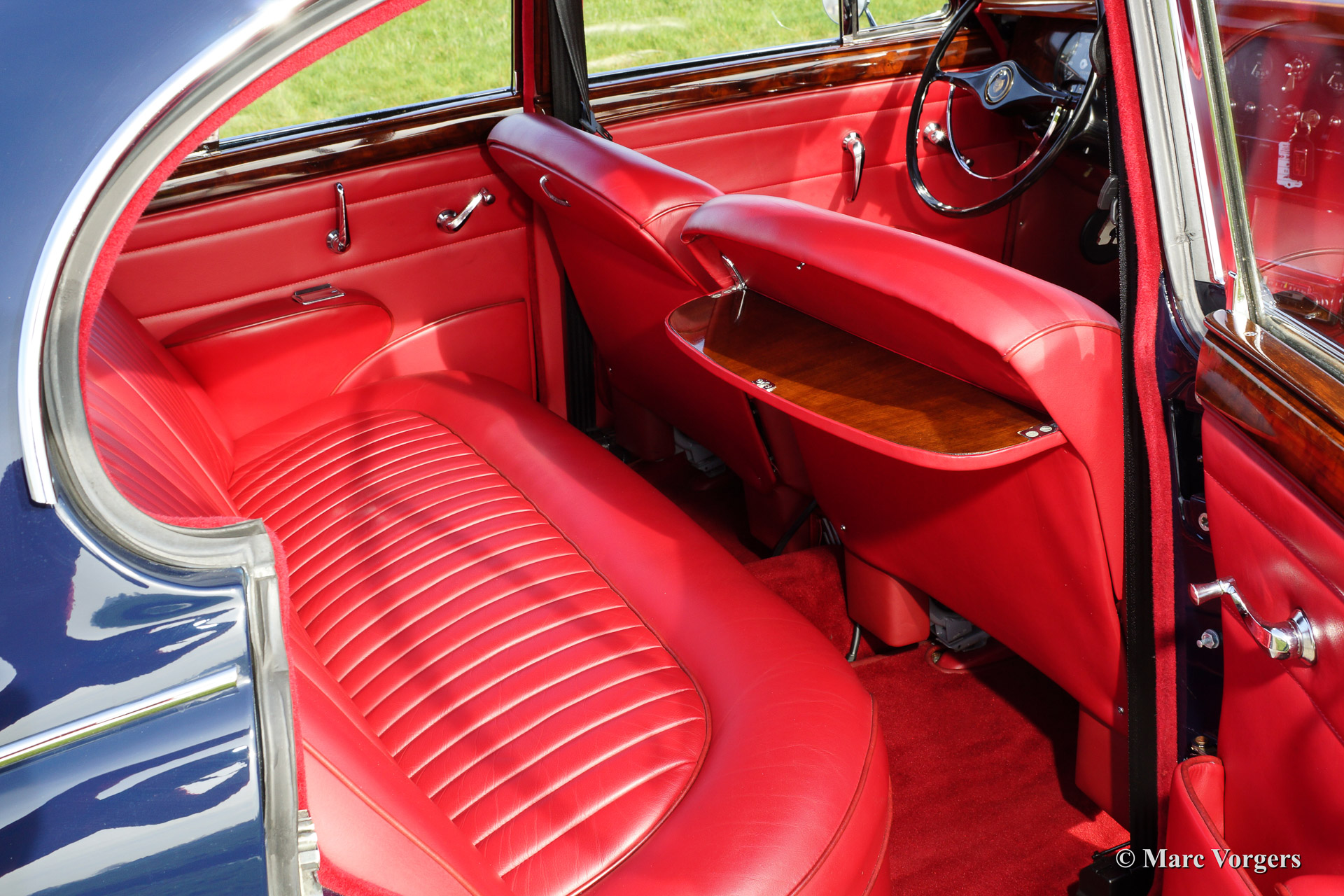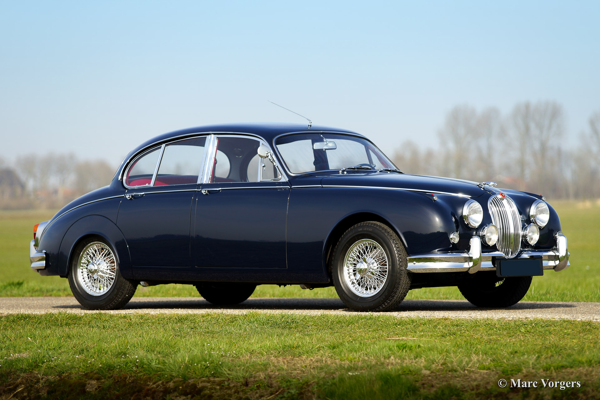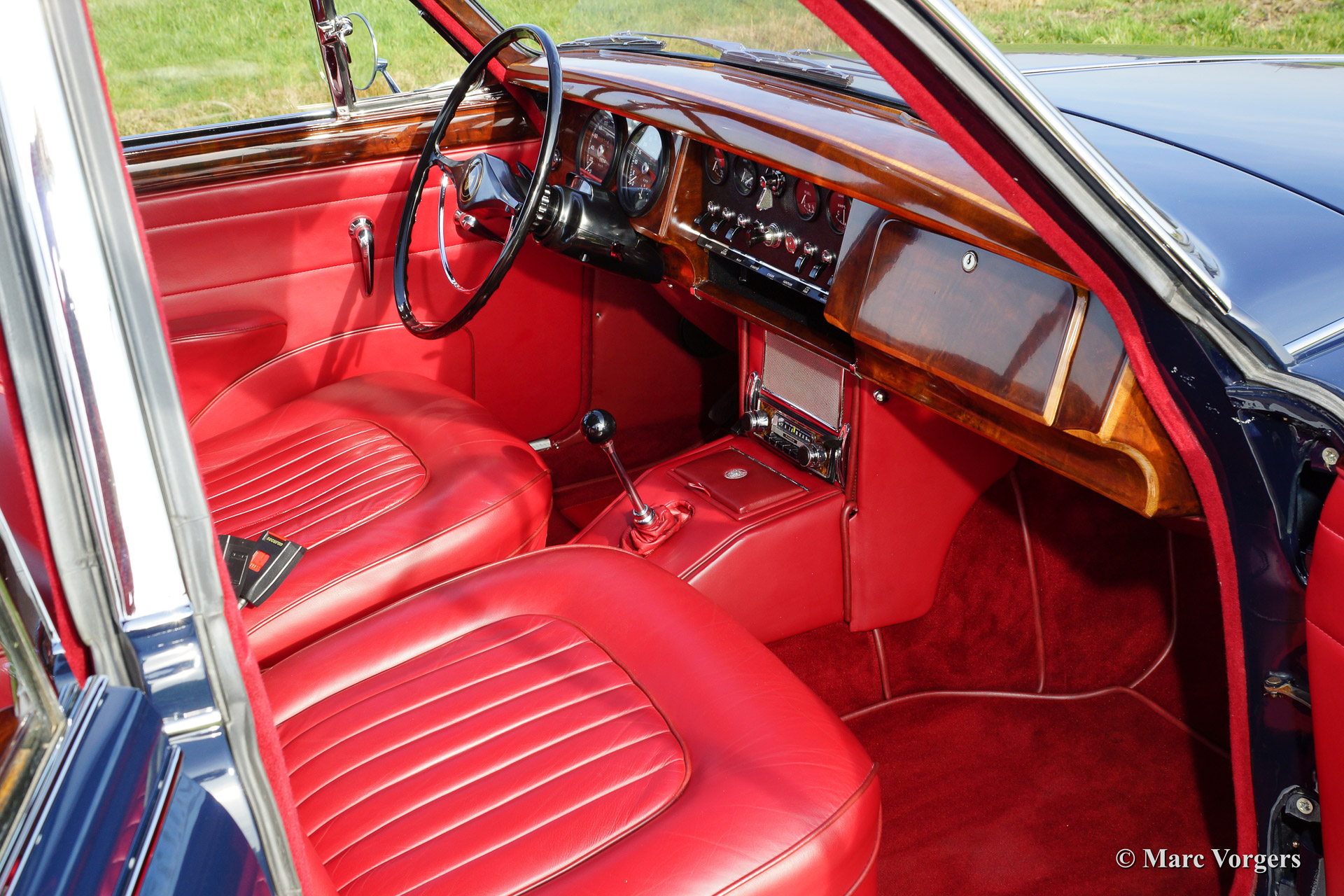 Jaguar Mk II 3.4 Litre, year 1967. Colour dark blue with a red leather interior and red carpet. This very beautiful Jaguar Mk II was fully and professionally restored by a renown Dutch restoration firm in recent years. This fine Mk II is in concours (show) condition! This magnificent Jaguar features a 4-speed manual gearbox with overdrive, chrome wire wheels, power steering, power brakes and tool box. This automobile was sold new in the Netherlands. A beauty and a delightful driver car.