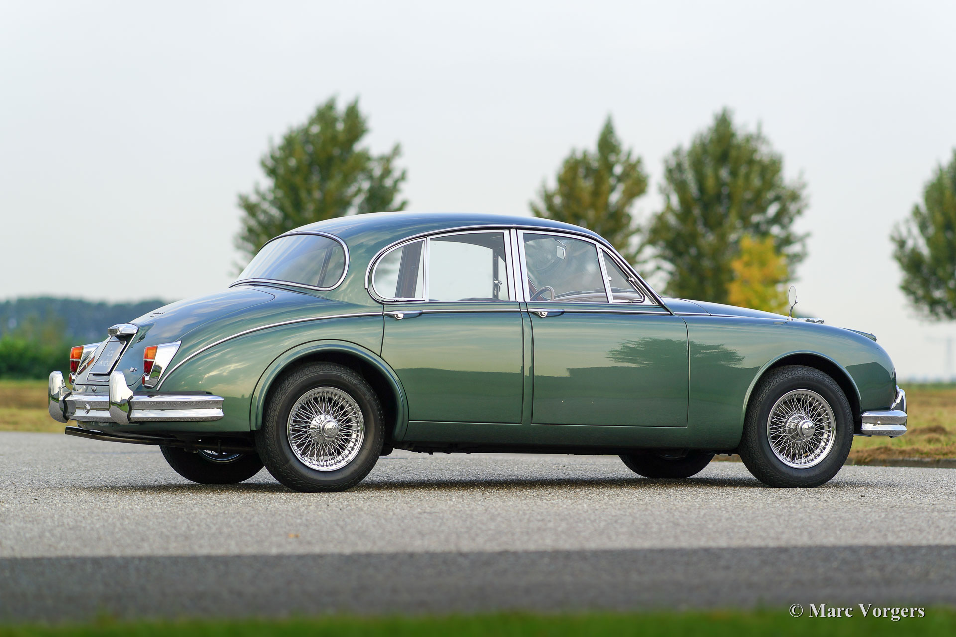 Jaguar Mk II 3.4 Liter, Jahr 1968. Farbe Grün metallic (Opalescent Green) mit grünem Leder (Suede Green) und passendem Teppich. Dieser wundervolle Jaguar Mk II wurde in der Vergangenheit ausgiebig und ‚‘body-off‘ restauriert in den Niederlanden. Der Körper zeigt perfekte Passform und der Lack ist wunderschön! Diese Jaguar Mk II ist in einem hervorragenden Zustand und das Auto fährt herrlich. Das Fahrerlebnis ist durch den prächtigen Motor und die Kombination eines manuellen 4-Gang-Getriebes und Overdrive von hohem Niveau. Darüber hinaus verfügt dieser stilvolle Jaguar über Chrom Speichen Räder mit ‘Knock Off‘ Radmuttern, zusätzlichen Leuchten vorne, Rückspiegeln an beiden Vorderkotflügeln, einem schönen Lenkrad mit Holzkranz und ein schönes Blaupunkt Oldtimer Radio mit Antenne.