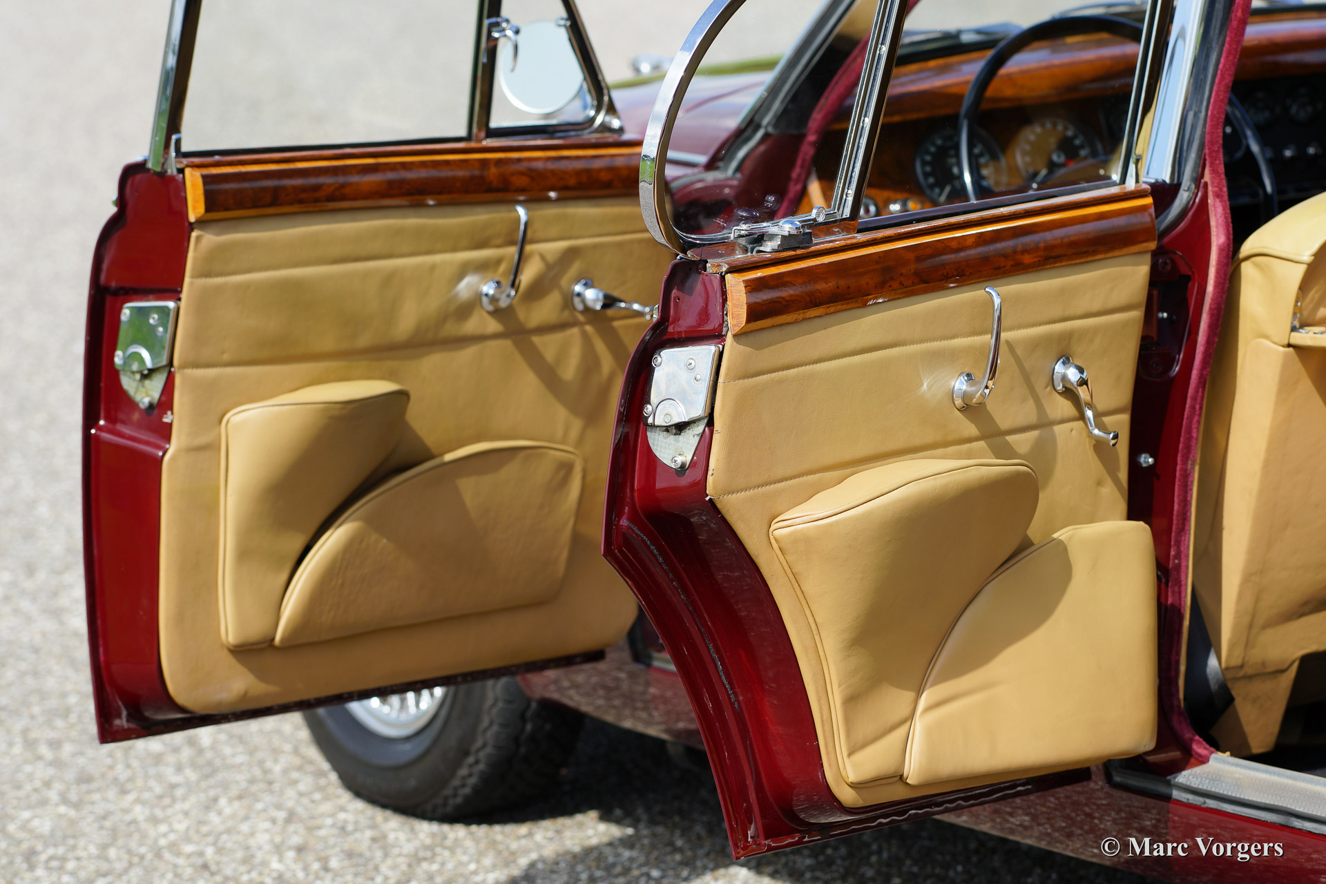 Jaguar Mk II 3.8 Litre, year 1960. Chassis number: 103488. Colour dark red with a tan (beige) leather interior. This stylish Jaguar Mk II was extensively restored in the past, the automobile is in excellent condition. This Mk II is the most sought after model: the 3.8 Litre with manual gearbox and overdrive! This very handsome Jaguar saloon drives magnificently. The car sports chrome wire wheels.