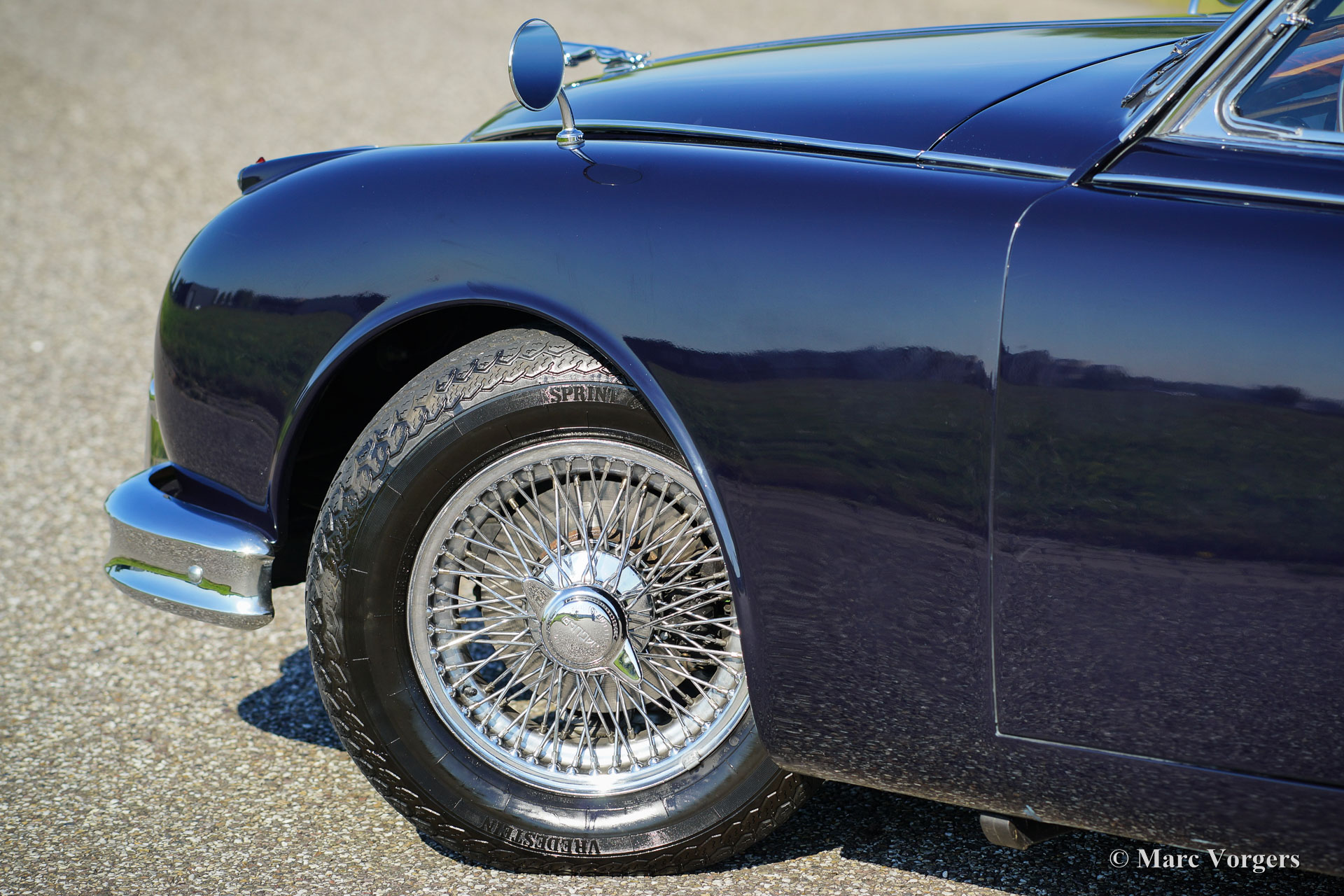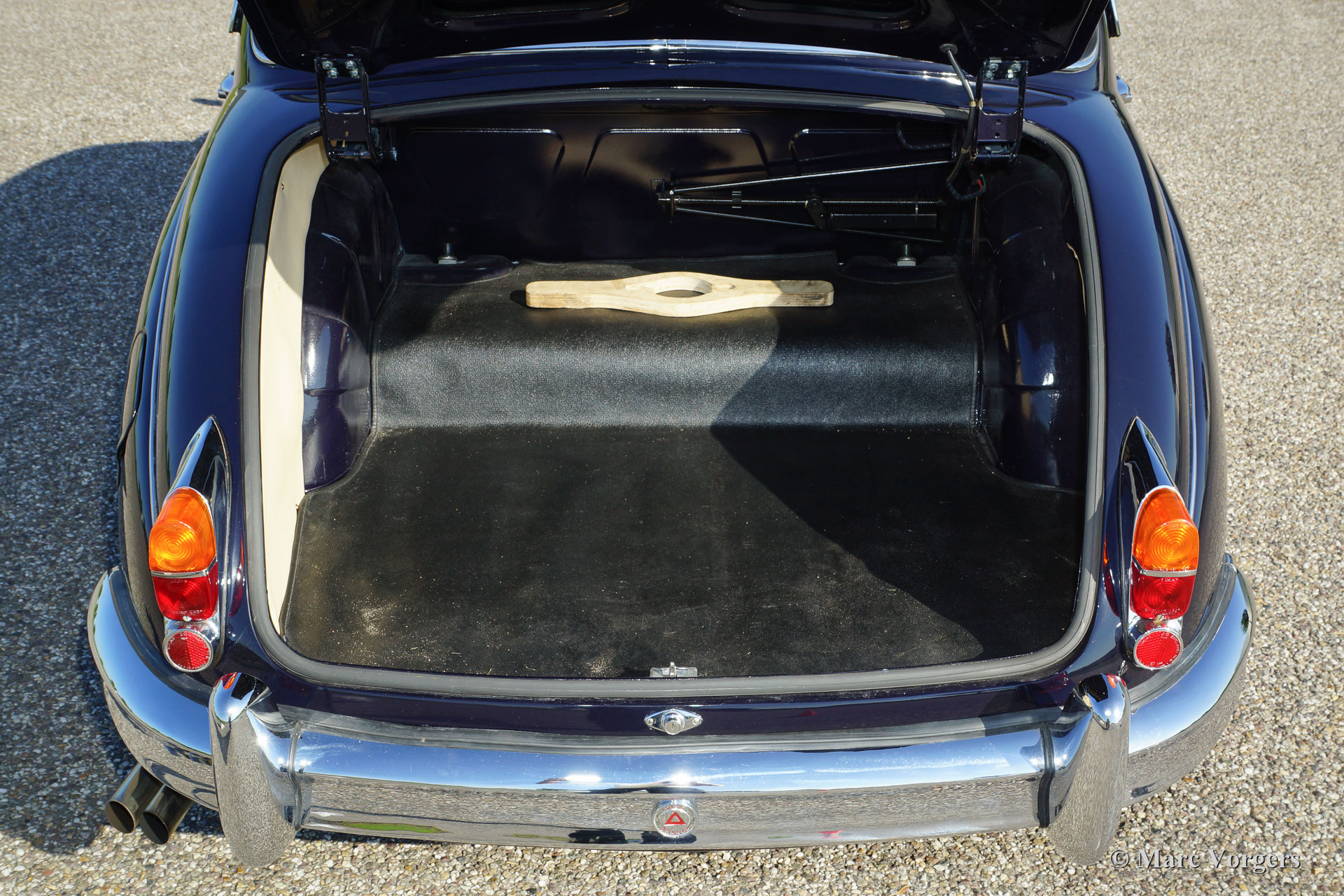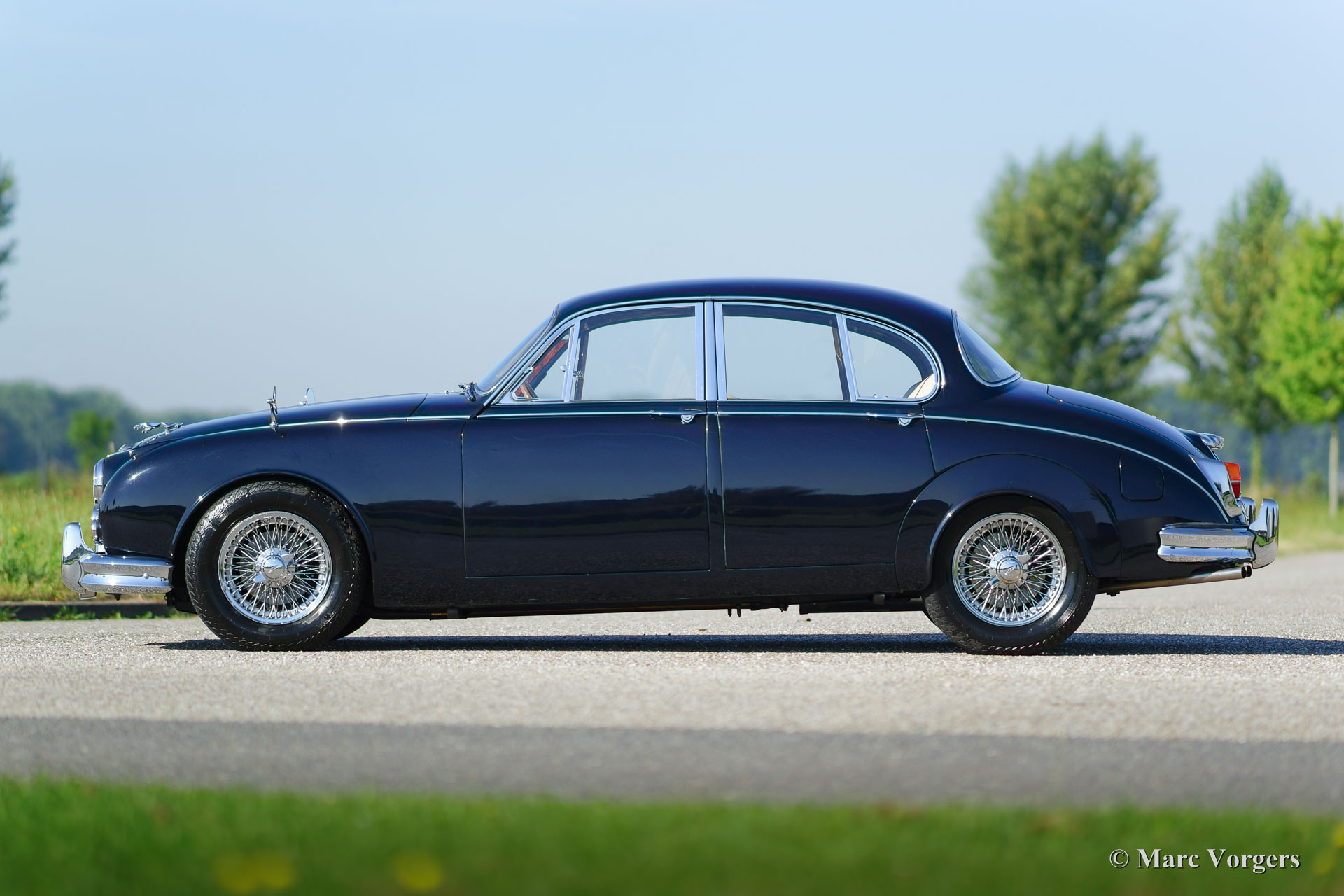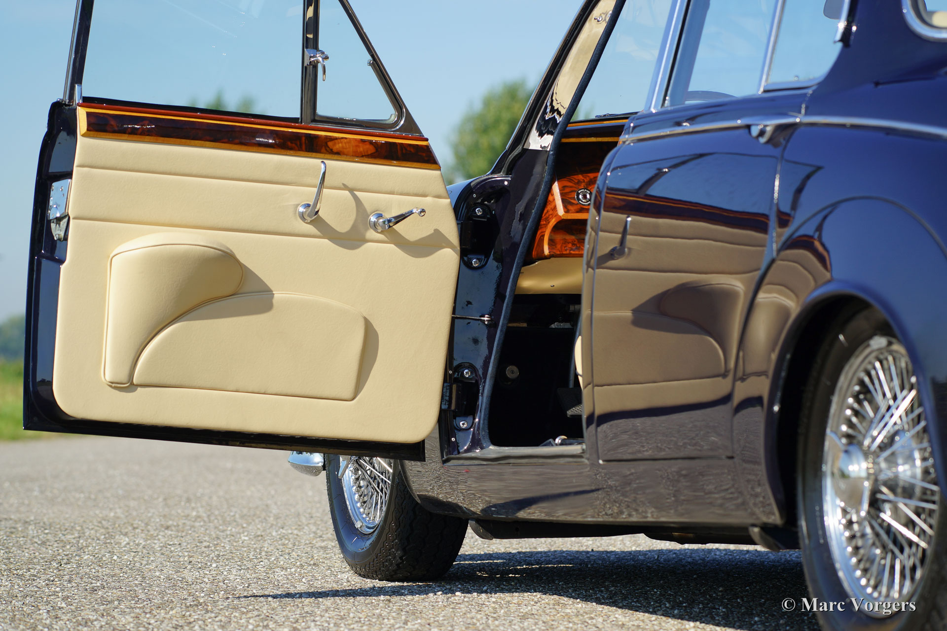 Jaguar Mk II 3.8 Liter, Jahr 1962. Farbe dunkelblau mit einem Magnolia (hellbeige) Leder-Interieur getrimmt mit dunkelblauen Paspelierung. Dieses schöne und stilvolle Jaguar Mk II wurde ausgiebig und ‘body-off‘ wieder hergestellt in den Niederlanden. Dokumentation der Restaurierung ist vorhanden. Die Karosserie zeigt perfekt passende Blechteile, hervorragende Lackierung und fantastische Chrom-Details; Diesen Jaguar ist in einem hervorragenden Top-Zustand! Der Jaguar ist ab Werk versehen von seltener Optionen wie die stärkste 3,8 Liter-Motor kombiniert mit dem manuellen Vierganggetriebe und Overdrive; ein sehr wünschenswertes Paket!