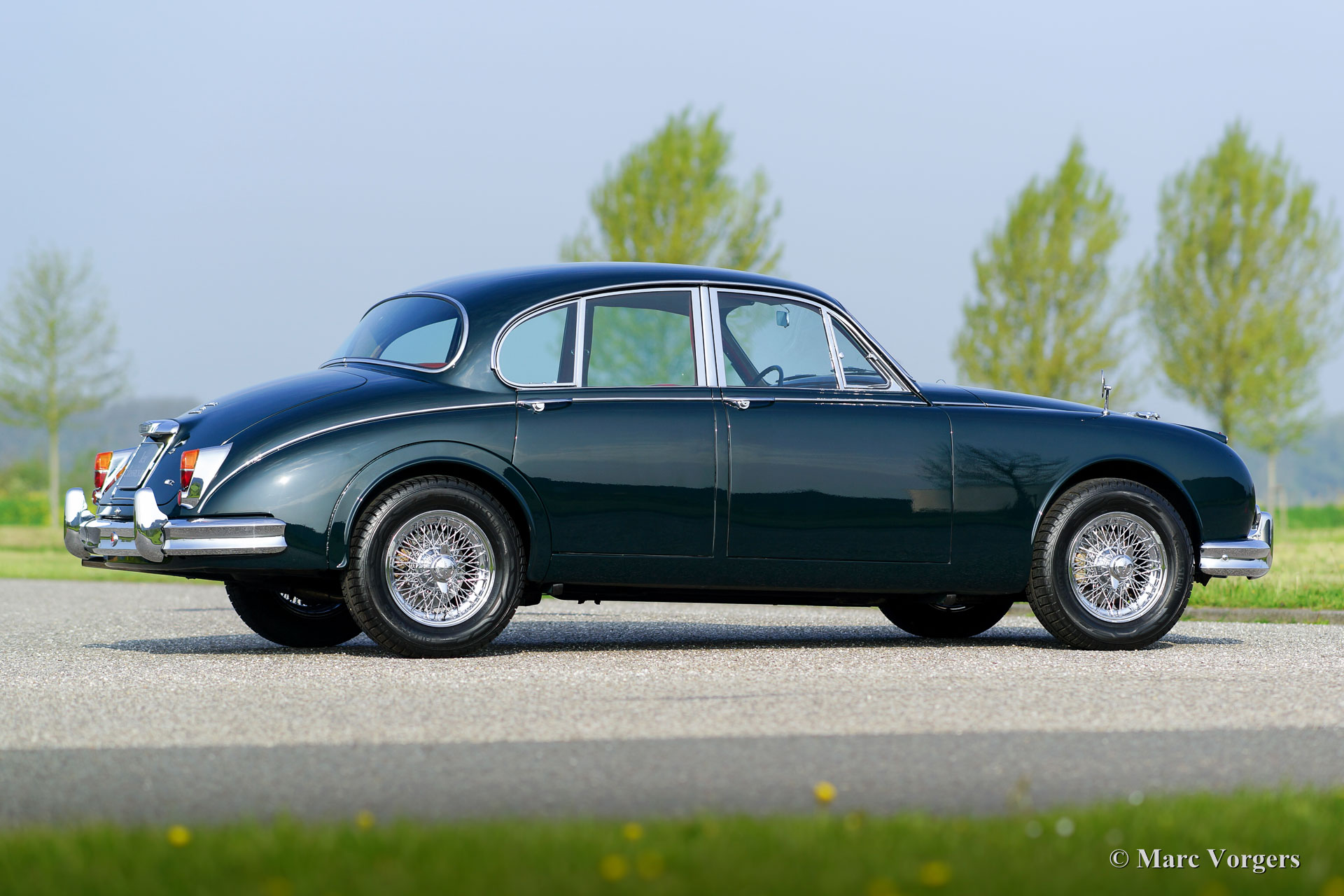 Jaguar Mk II 3.8 Liter, Jahr 1968. Farbe British Racing Green mit einem roten Leder Interieur und roten Teppich. Dieser prächtige Jaguar Mk II wurde ausgiebig und ‘body-off‘ wiederhergestellt in den Niederlanden, der Jaguar ist in einem hervorragenden TOP-Zustand! Der 3,8-Liter-Motor liefert viel Kraft und vereint sich wunderbar mit dem Automatikgetriebe. Das Auto verfügt über Chrom-Draht-Räder, Chrom ‘Knock-off‘ Radmuttern, zusätzliche Strahllampen an der Vorderseite und zwei Flügel montierte Rückspiegel. Dies ist ein stilvolles und perfekt fahrendes Jaguar Mk II in Super Zustand!
