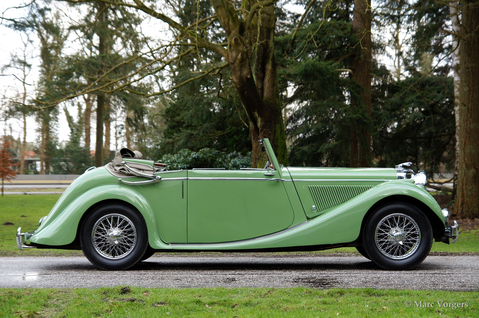 Jaguar Mk IV 3.5 Litre Drop Head Coupe, year 1947. Colour light green with a suede green leather interior and dark green carpet. Beige mohair convertible top.