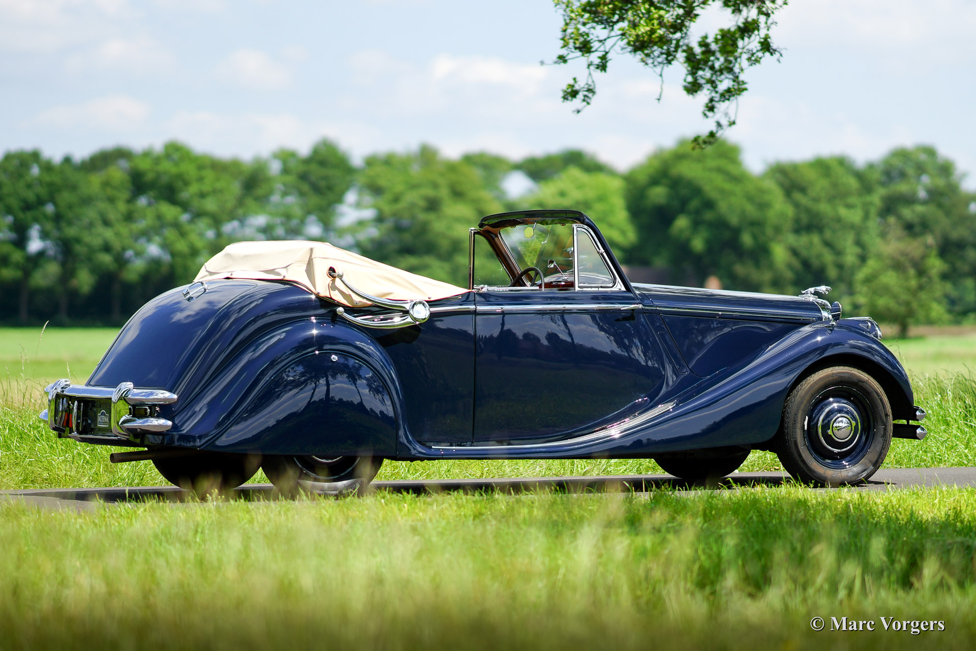 Jaguar Mk V 3,5 Liter Drop Head Coupe (DHC), Jahr 1950. Farbe dunkelblau mit einem Cognacbraune Lederausstattung und passenden Teppich. Beige Mohair Verdeck und Abdeckung. Dieses fantastische Jaguar Mk V DHC ist in einem hervorragenden Zustand, concours! Das Auto wurde weitgehend restauriert von einer niederländischen Restaurierung Firma. Das Auto kommt gut dokumentiert. Dies ist eine beeindruckende Mk V, wunderschön restauriert und versehen von wunderschönen klassischen Details.