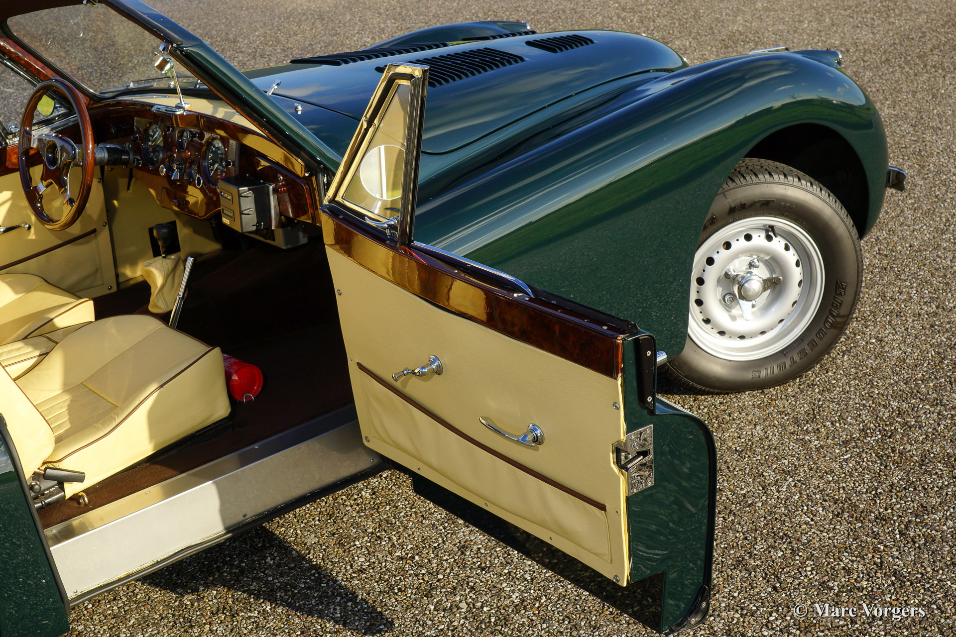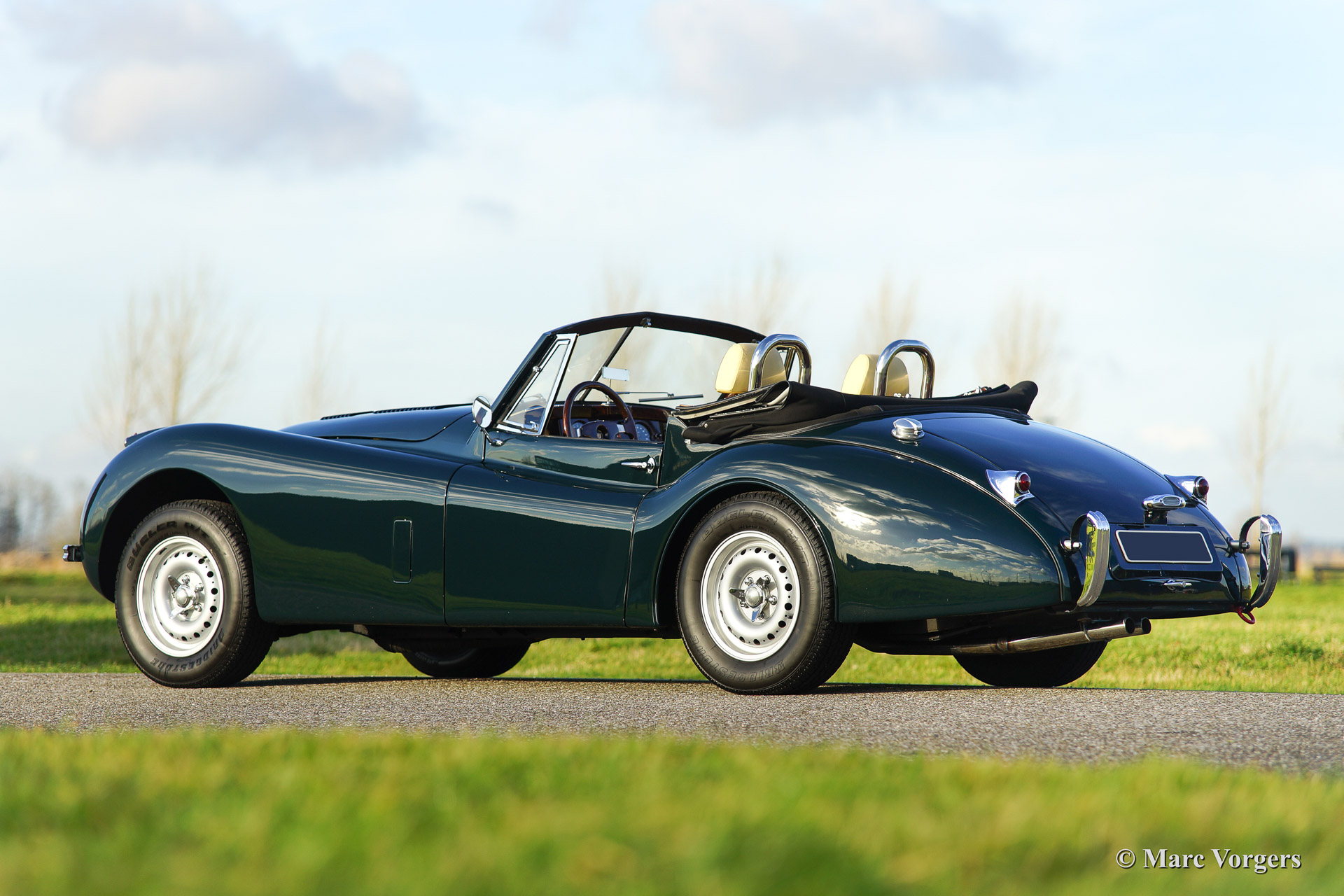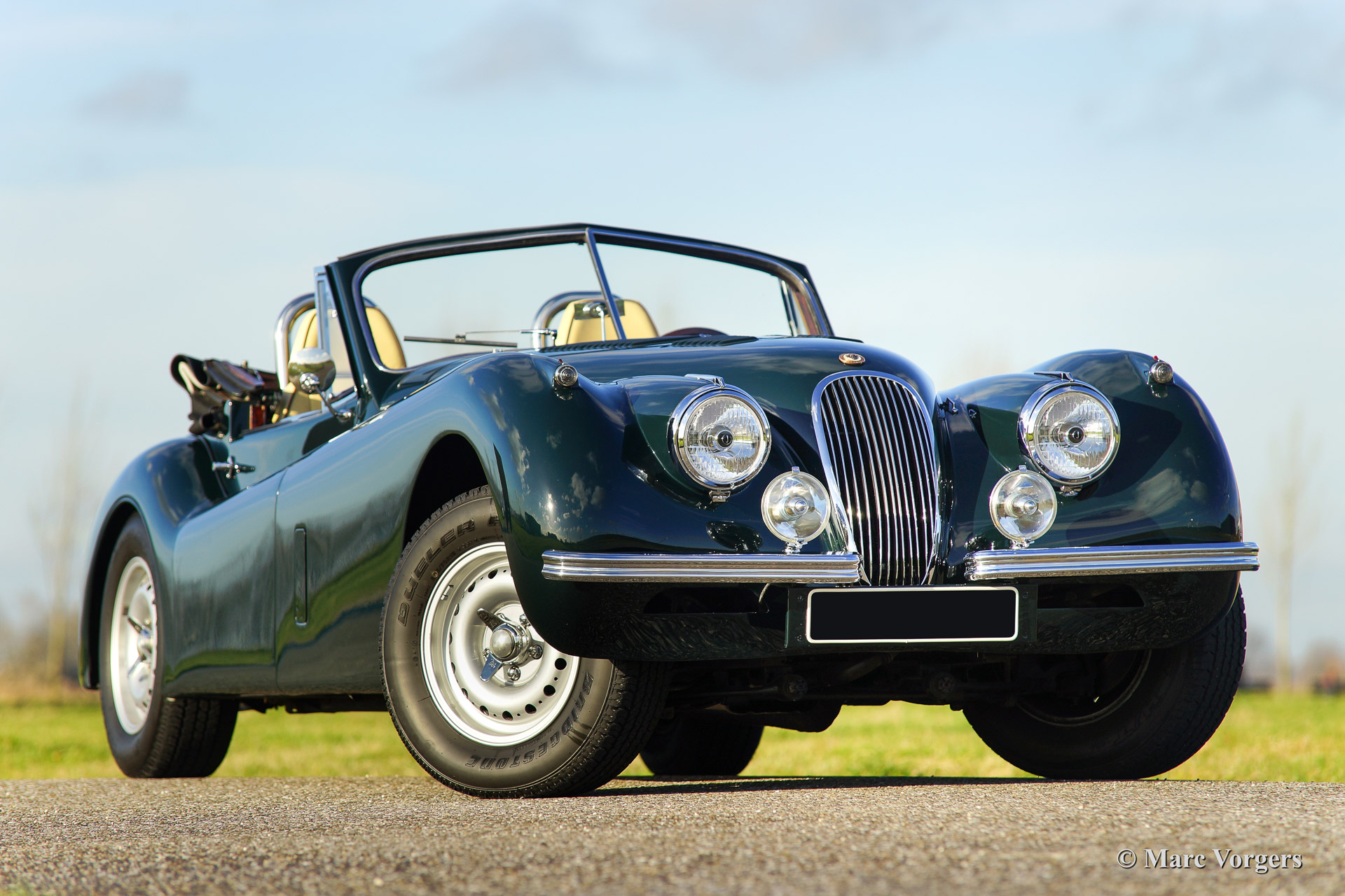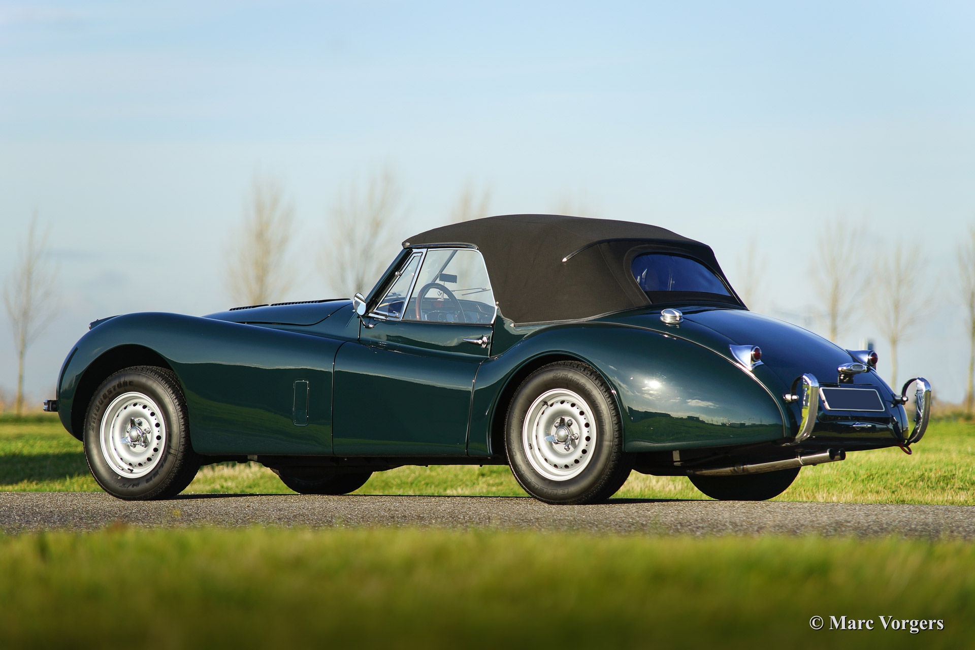 Jaguar XK 120 Drophead Coupe (DHC), year 1954. Chassis number: 678302, engine number: NAI242-8 and 7365-8. Colour British Racing Green with a beige leather interior trimmed with brown piping. Brown carpet. Black mohair soft top. This car was originally sold new in the Netherlands, the old linen registration 'paper' is still present. This fabulous Jaguar XK 120 was extensively restored in the year 2004. The automobile is in superb (excellent+) condition! Additionally some modifications were carried out to improve safety and reliability. Improvements: 'S' cylinderhead, 'fast road' camshafts, more precise XK 150 steering, Getrag 5-speed manual gearbox, special rollbars, special leather seats, 4-point safety harnesses, GTI rally twin, a louvered bonnet for improved cooling, 123 electronic ignition, 2 inch 'sand-cast' carburettors, Dunlop alloy wheels, additional driving lamps at front and a special steering wheel. This masculine XK 120 drives fantastic!