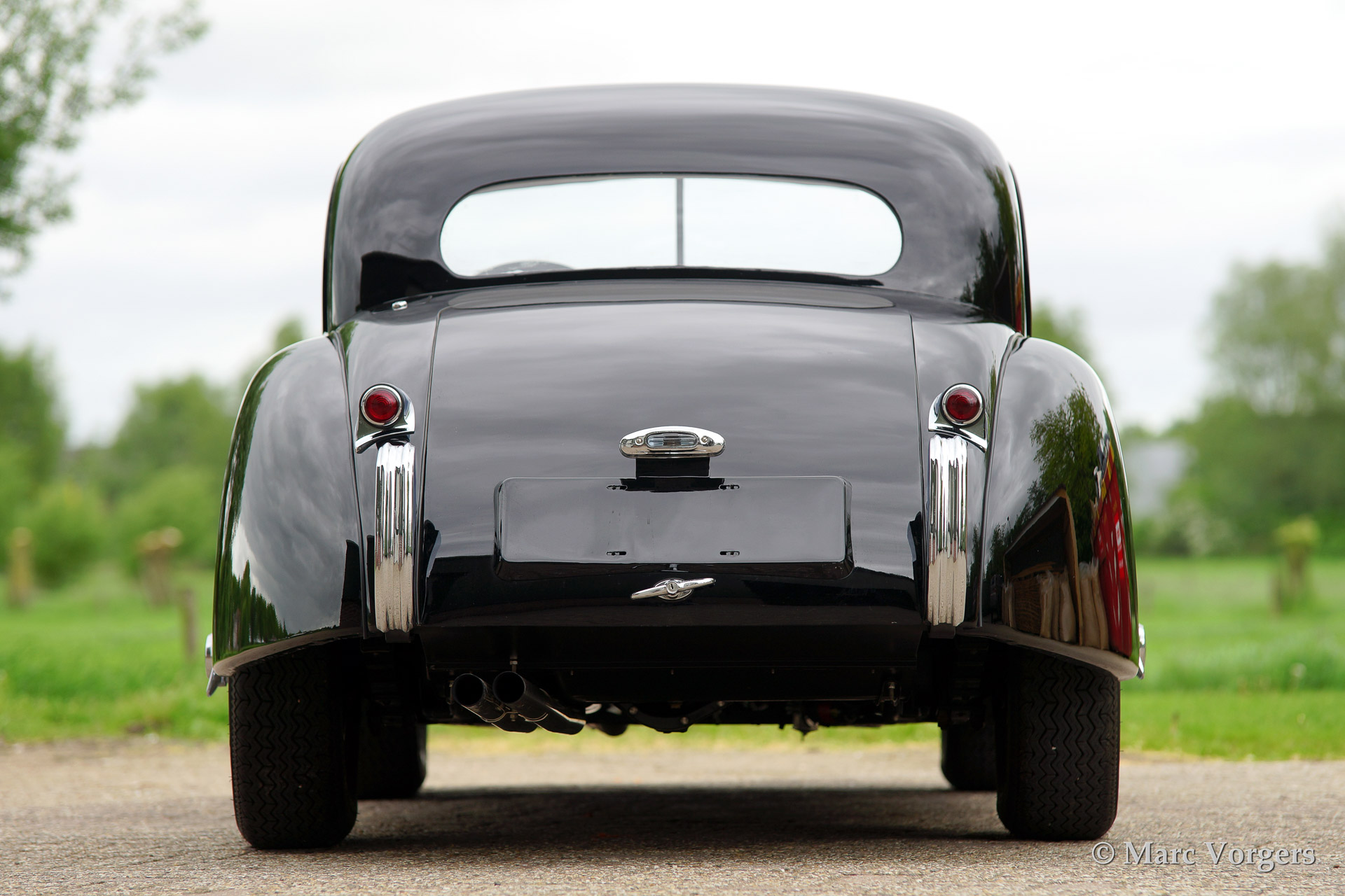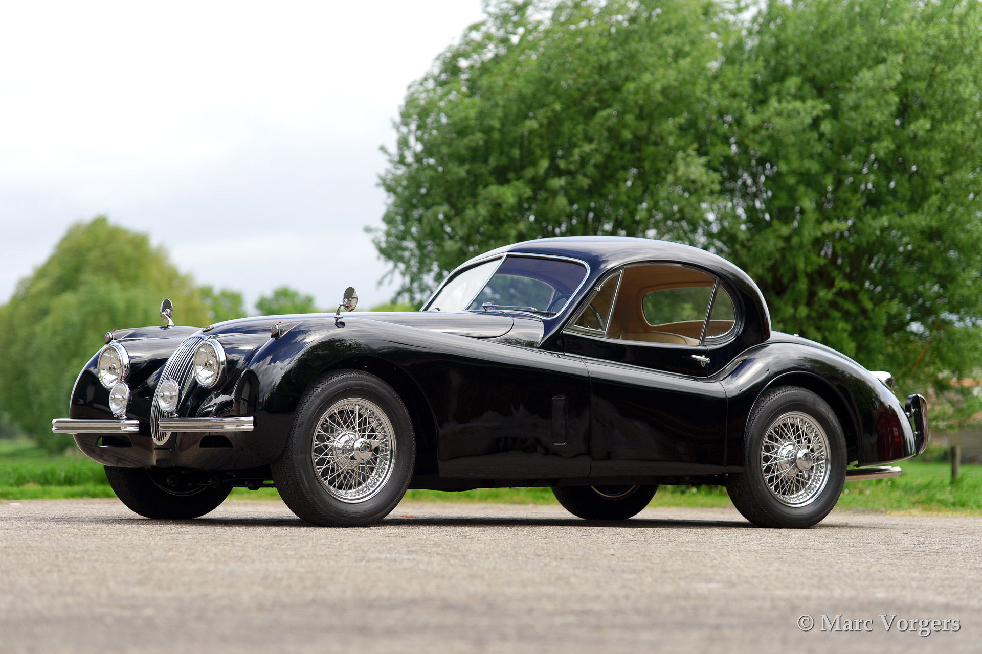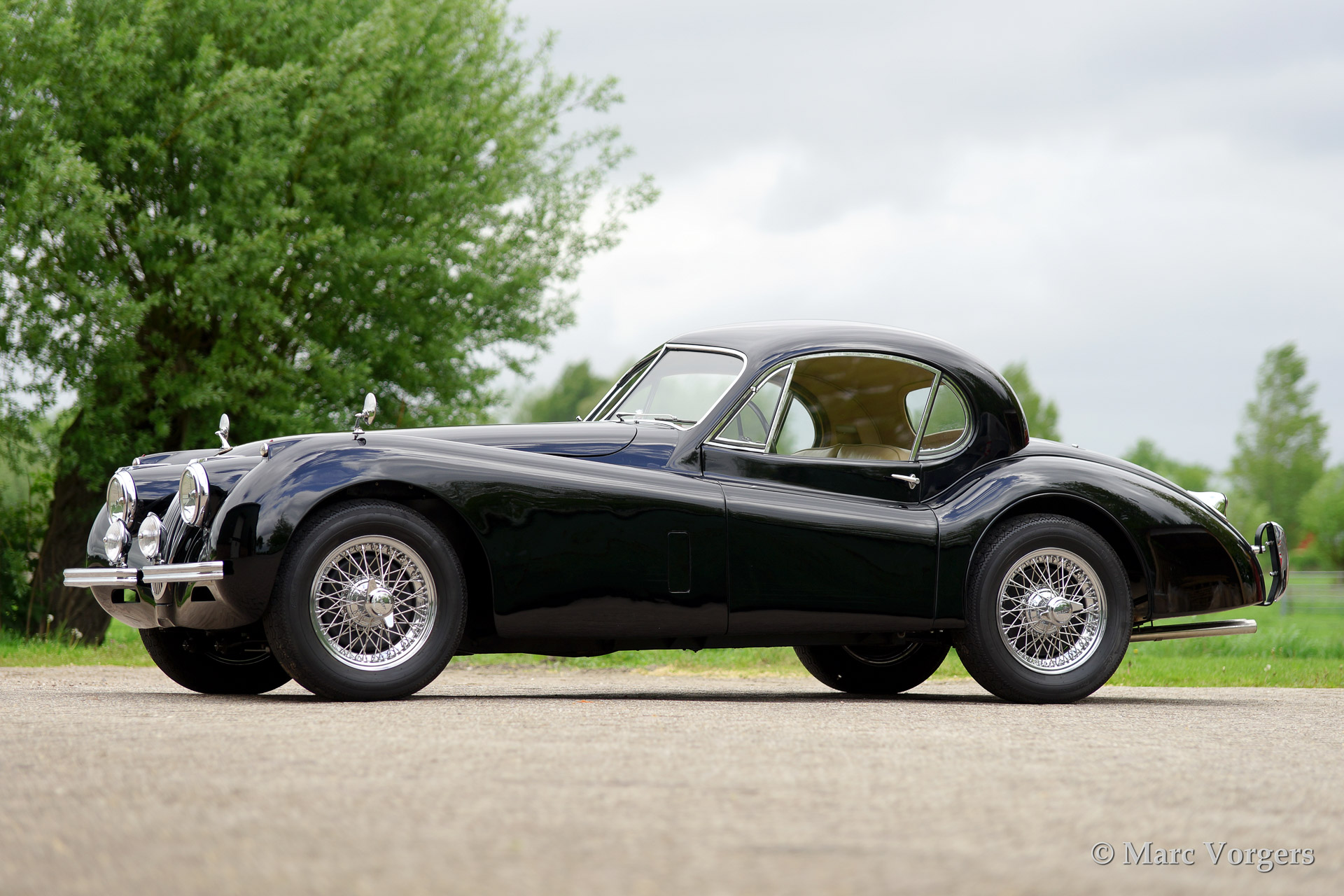 Jaguar XK 120 Fixed Head Coupe (FHC), year 1954. Colour black with a beige interior. The car features a manual 4-speed gearbox, 16 inch chrome wire wheels, additional driving lamps at front and the beautiful classic 'tripod' headlamps.