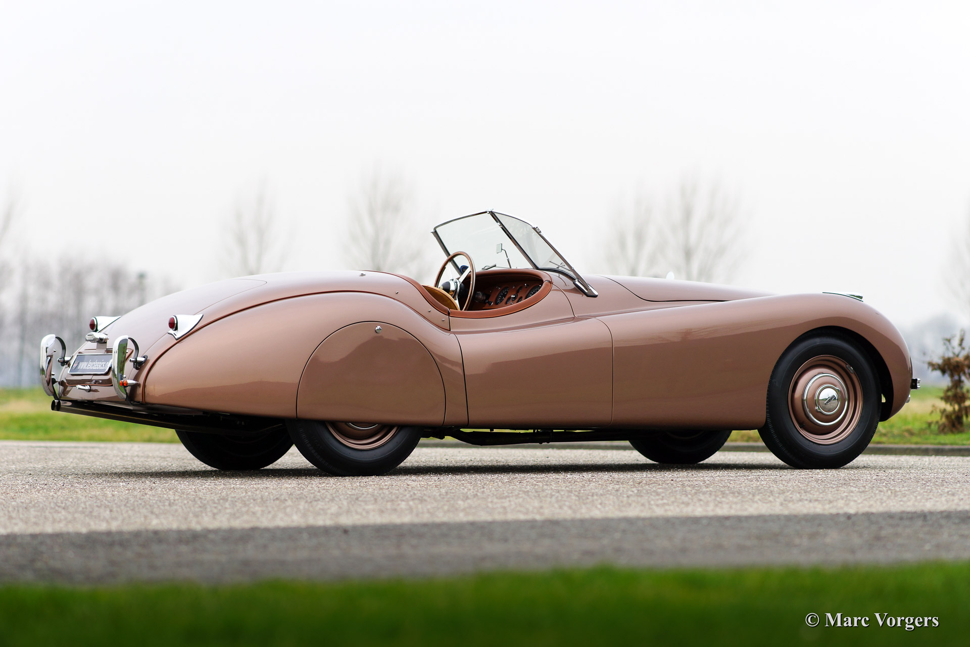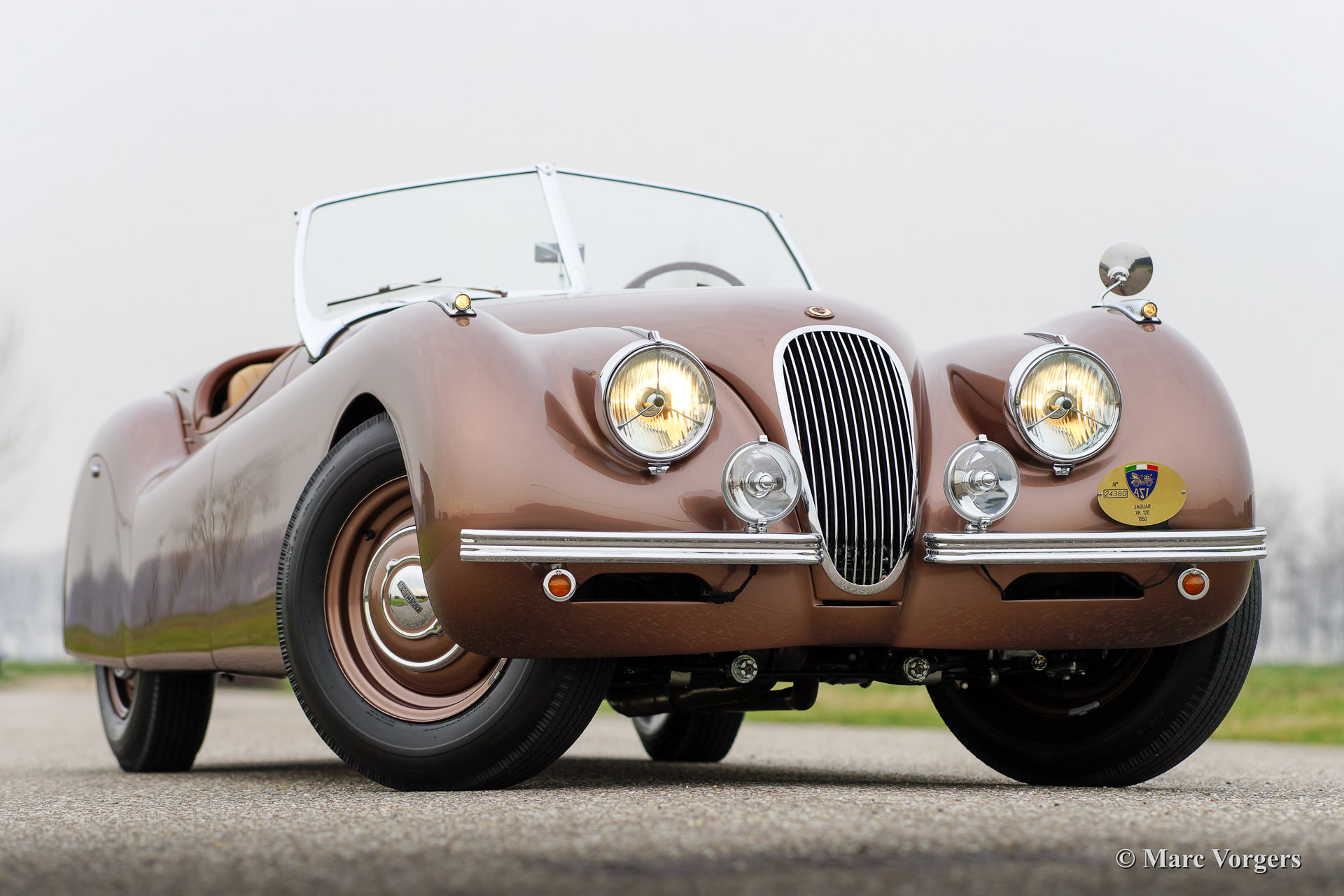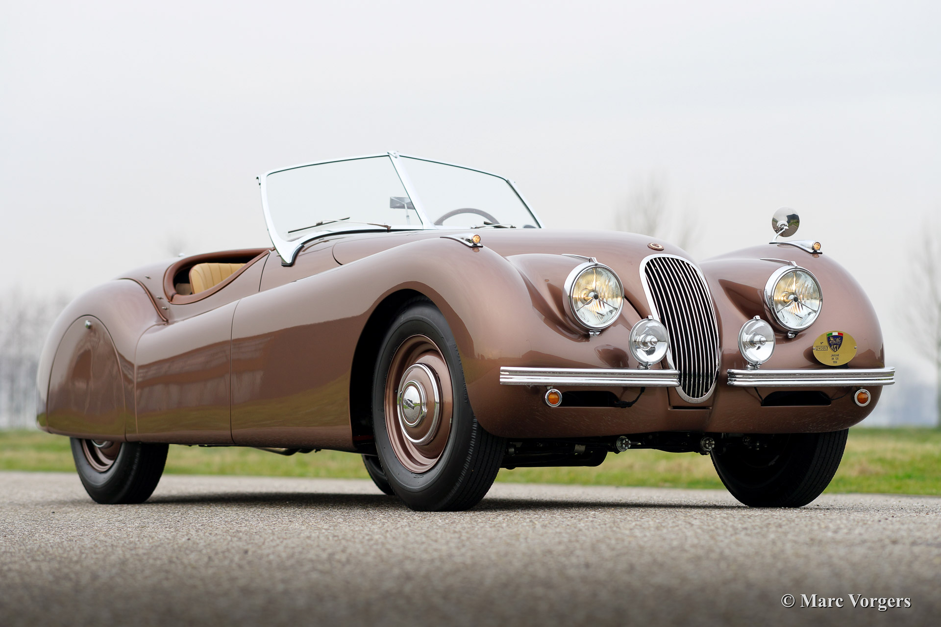 Jaguar XK 120 OTS (Open Two Seater / Roadster), Jahr 1950. Fahrgestellnummer 670.612, Motornummer W 1351-8. Farbe Bronze mit einem beige Lederausstattung. Diese frühe Jaguar XK 120 mit Stahl Körper ist vor ein paar Jahren aufwendig und perfekt ‚body off‘ restauriert worden. Das Auto ist in Top-Zustand, concours! Ein Heritage Zertifikat ist vorhanden; dies ist ein "matching numbers" Auto. Dieser XK 120 zeigt fantastische ursprünglichen Details wie die lackierte Stahlfelgen und den "spats" über die Hinterräder. Weiter ist das Auto ausgestattet mit zusätzlicher Lampen auf der Vorderseite und ein schönes 4-Speichen-Lenkrad mit Holzkranz. Die seltenen poliertem Metall-Lampen auf den vorderen Kotflügeln findet man nur an die seltene XK 120 Autos mit Aluminium Körper und an die ersten XK 120 Modelle mit Stahl Karosserie. Diese wunderschone Jaguar XK 120 Roadster hat in die Jahre 2009, 2011 und 2012 teilgenommen in der Mille Miglia Storiche und in der Gran Premio Nuvolari. Dies in den Händen des vorigen Eigners, ein bekannter italienischen Geschäftsmann. Dieser feine Jaguar kommt ausgezeichnet dokumentiert. Dieses Auto ist eine perfekte Investition und das Auto bringt den neuen eigner die Möglichkeit einen Startplatz in der berühmten italienischen Mille Miglia zu erhalten.