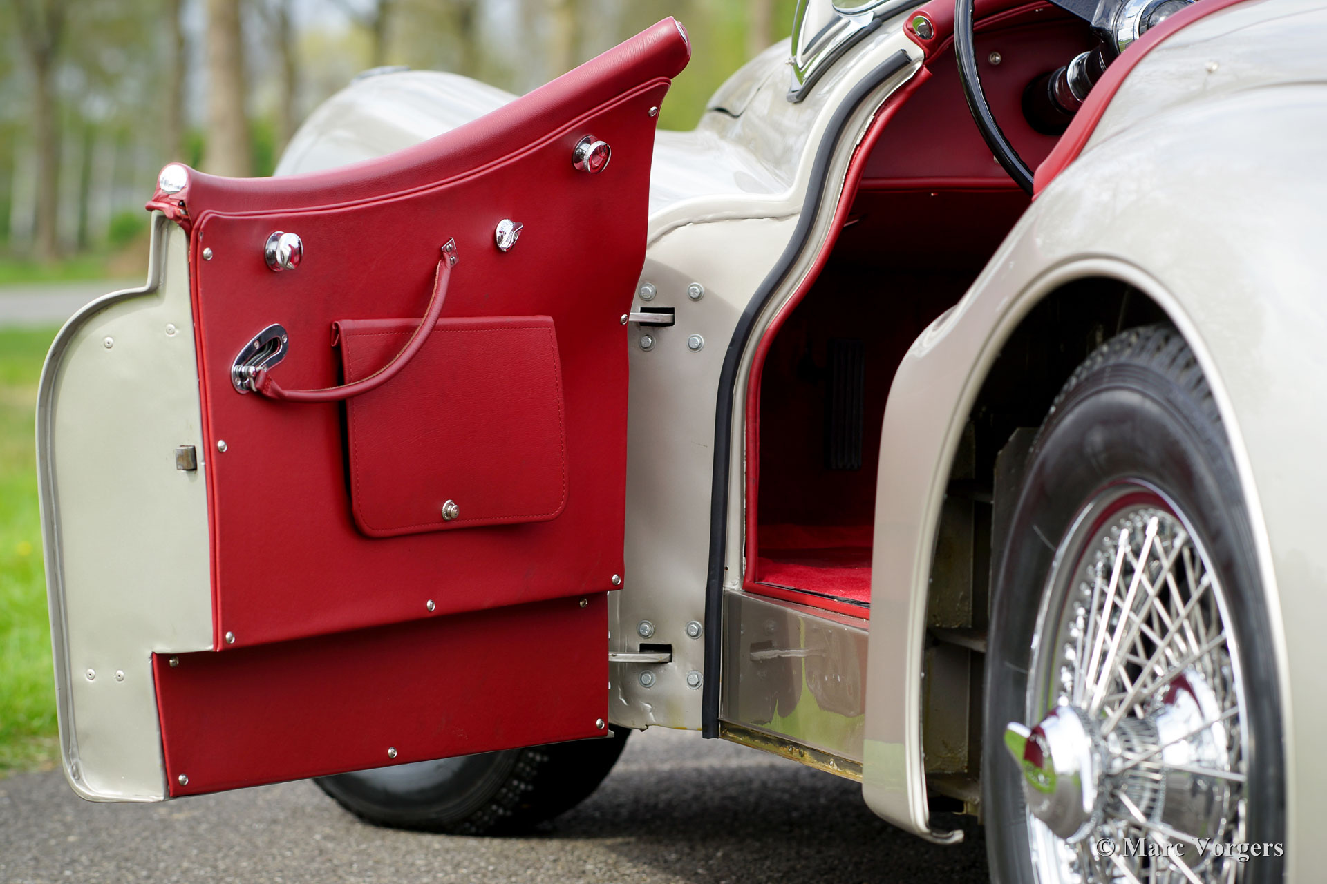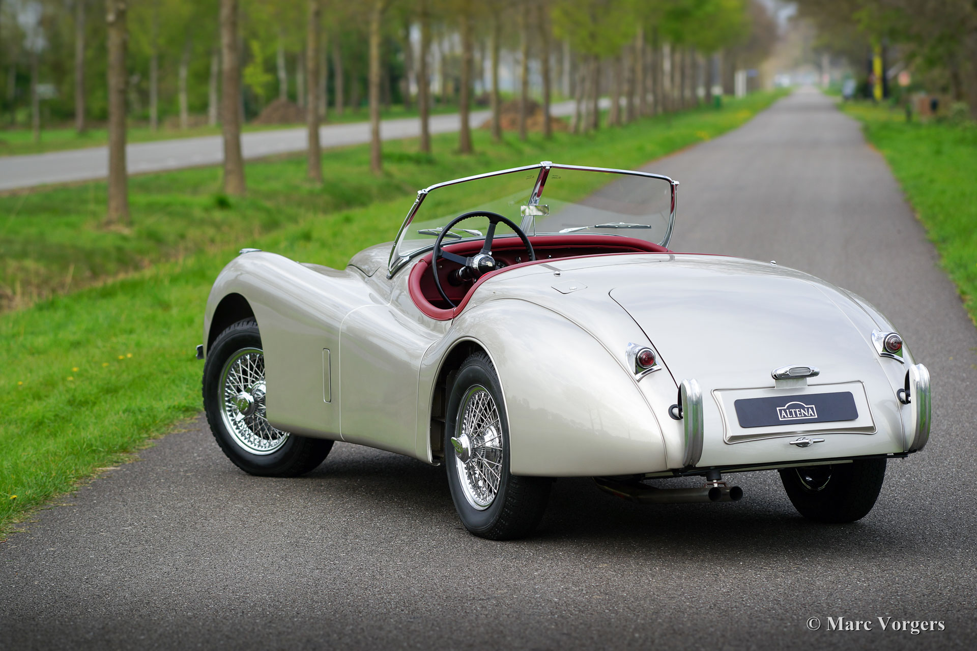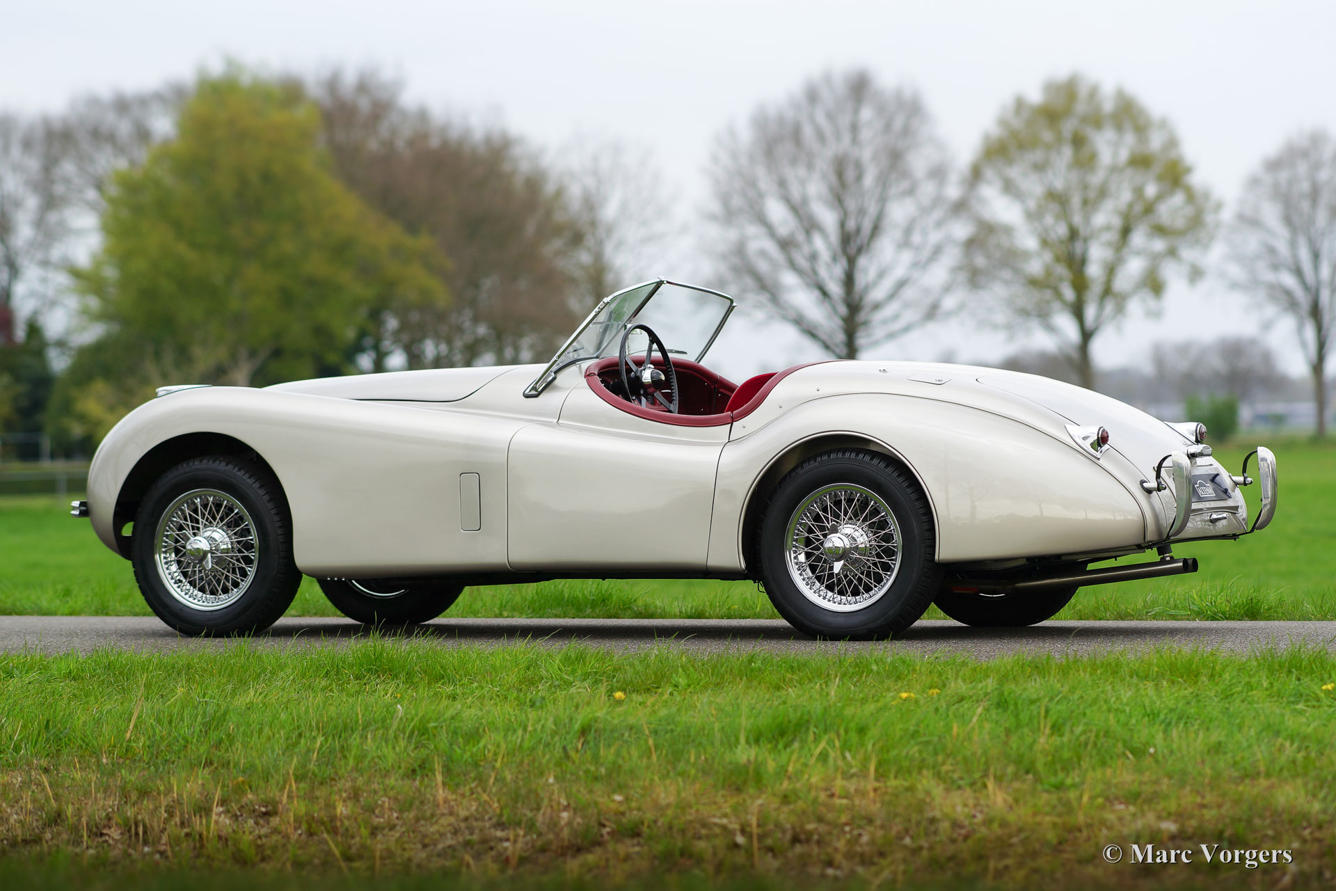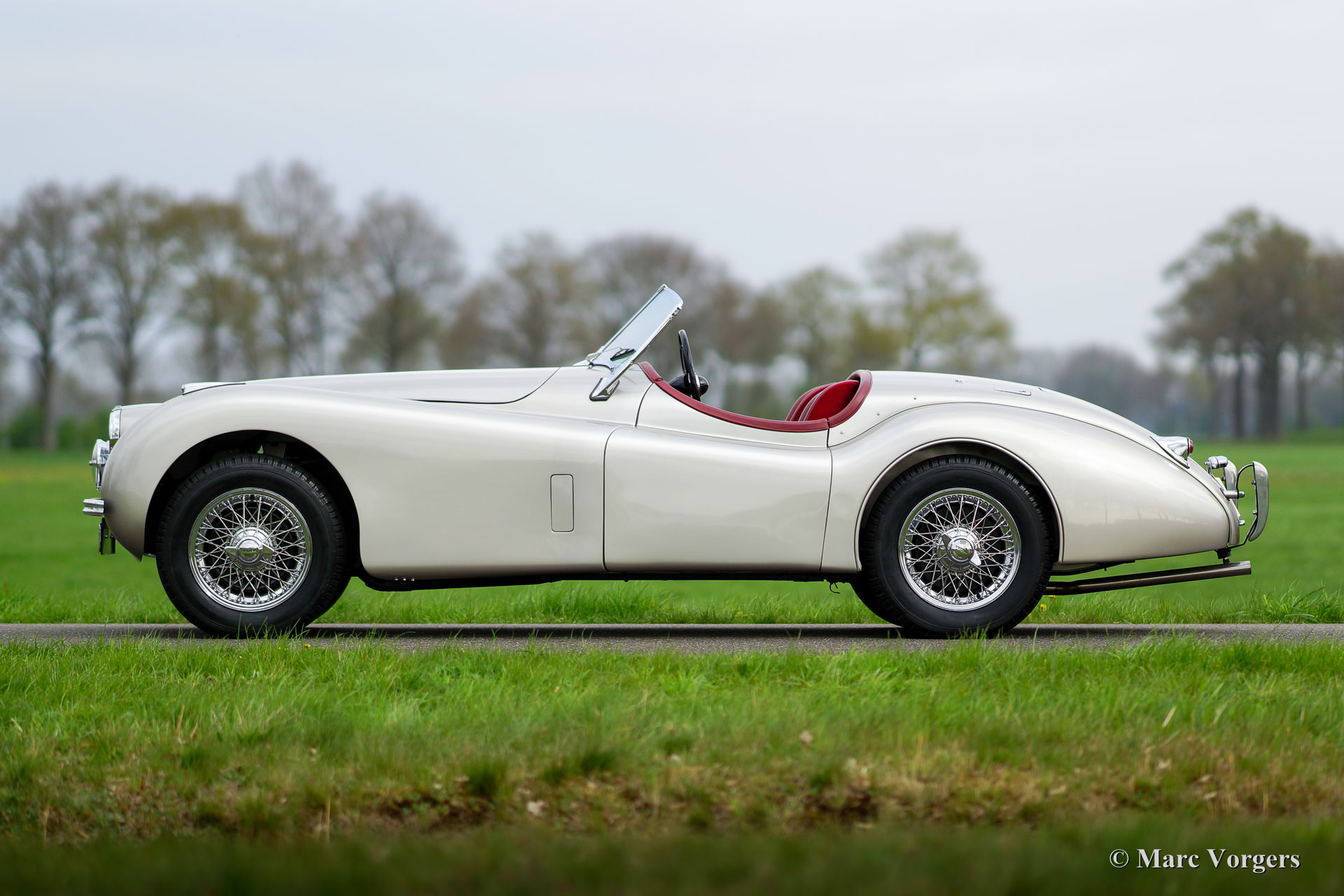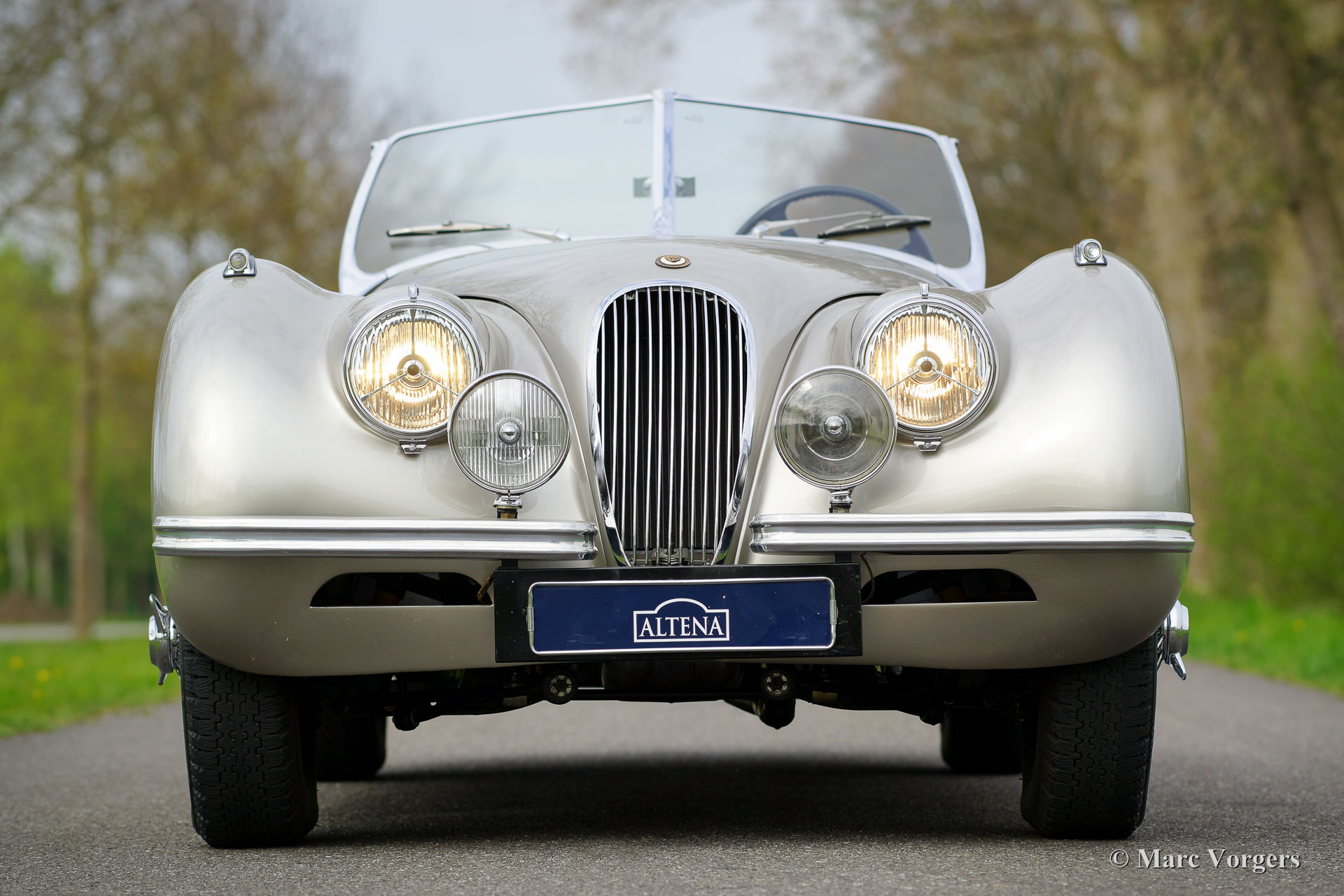 Jaguar XK 120 OTS, Jahr 1950. Farbe silber-metallic mit einem roten Leder-Interieur und roten Teppich. Schwarzes Verdeck und Verdeck Abdeckung. Dieses fabelhafte Jaguar XK 120 ‘Open Two Seater‘ (OTS, auch 'Roadster' genannt) wurde neu verkauft in den USA. Im Jahr 1990 wurde das Auto in die Niederlande importiert. Jahre später begann eine umfangreiche ‘body-off‘ Restaurierung; die Arbeit wurde im Jahr 2012 komplettiert. Eine umfangreiche Fotoreportage von der Wiederherstellung ist vorhanden ist sowie die Rechnungen. Seit Abschluss der Restaurierung hat dieser schöne Jaguar XK 120 nur etwa 900 Meilen gefahren. Das Auto ist ausgestattet mit Jaguar-Schalensitze, die perfekten Halt geben und die mehr Bein Raum geben für größere Fahrer. Dieser Jaguar XK 120 OTS ist in einem hervorragenden Top-Zustand!