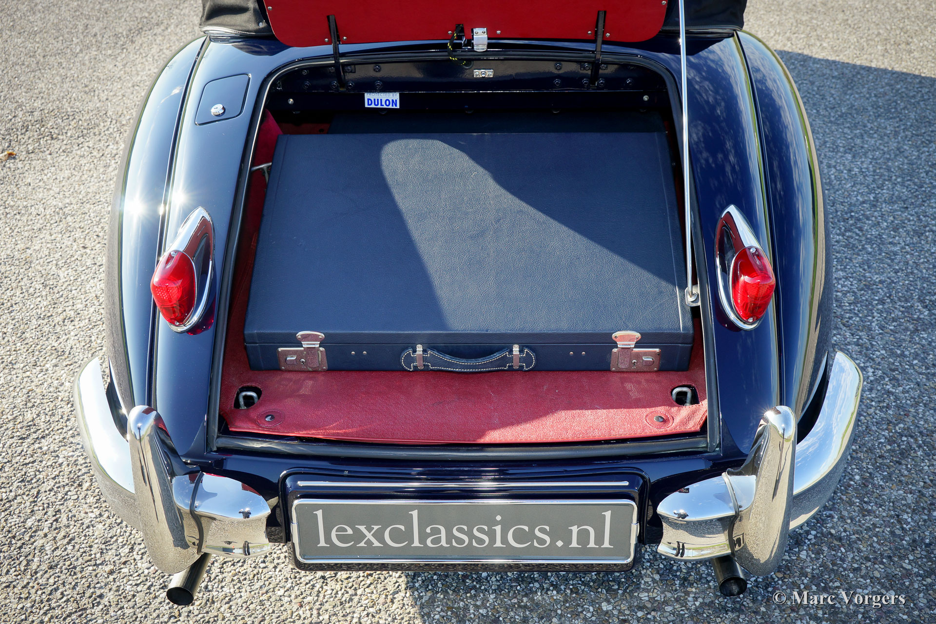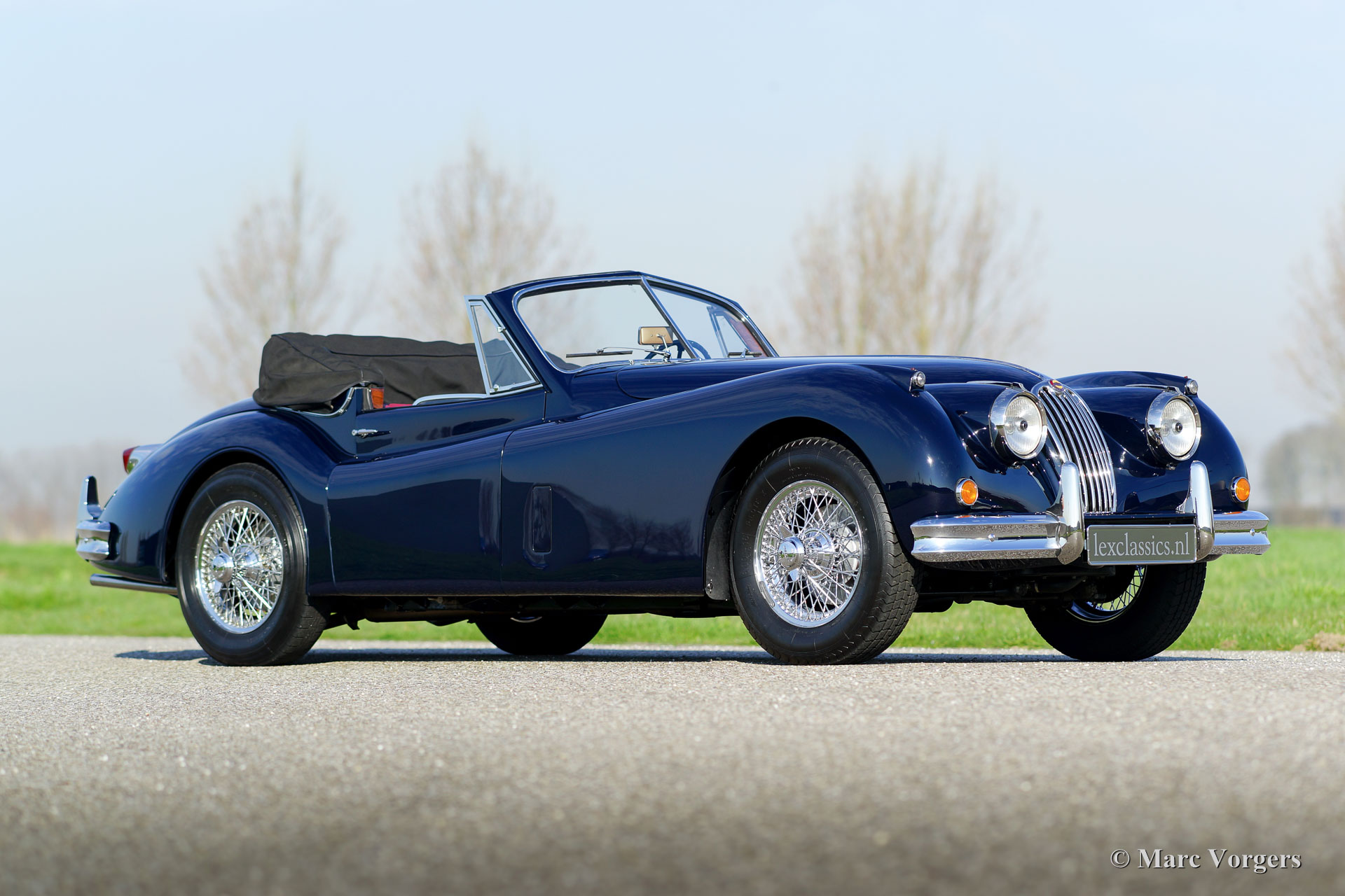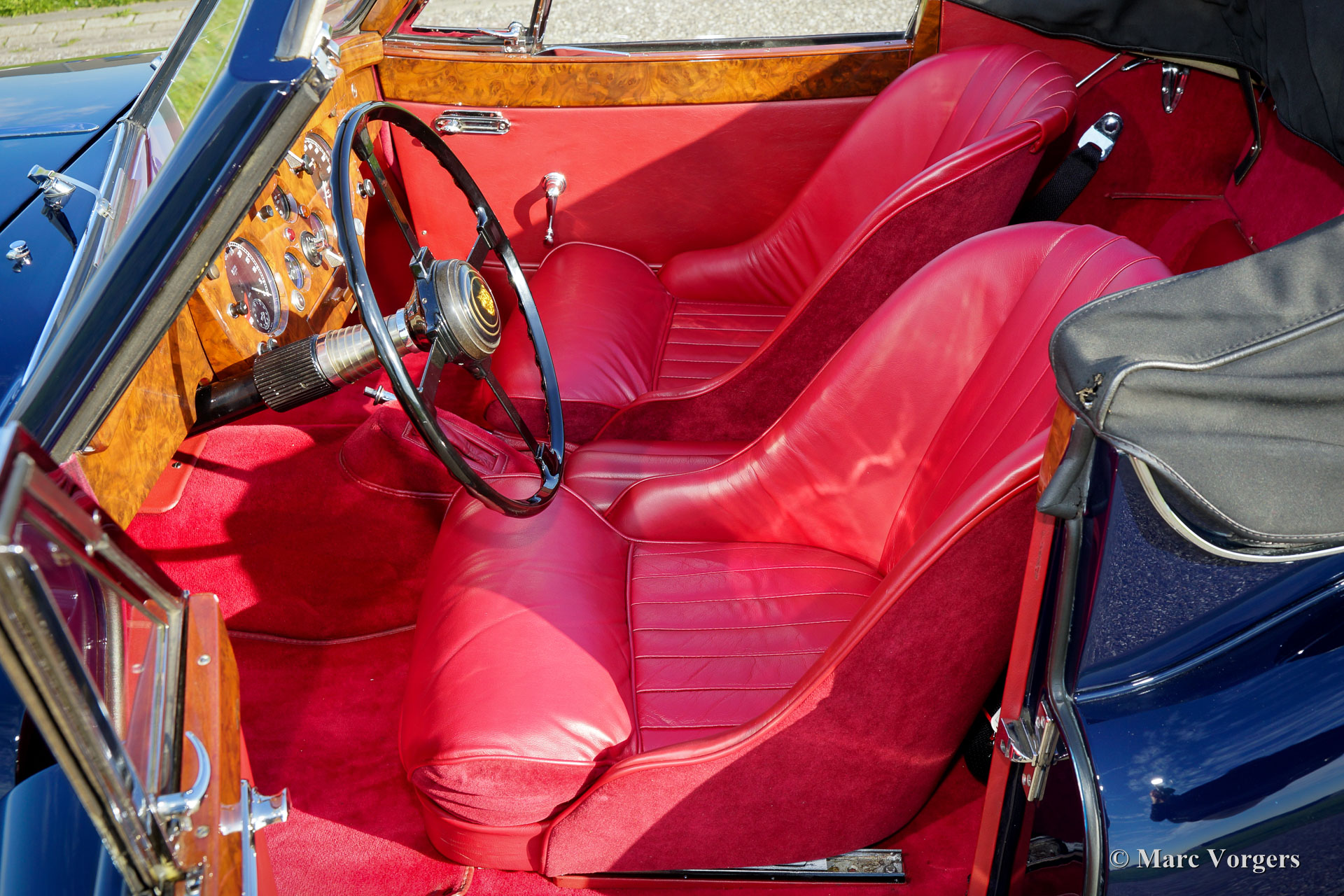 Jaguar XK 140 DHC, Jahr 1956. Farbe Pacific Blue mit einem roten Leder Interieur und eine schwarze Mohair Kapuze. Dieses wundervolle Jaguar XK 140 Drop Head Coupé (DHC) wurde ausgiebig und wunderschön in Großbritannien restauriert. Das Auto ist in einem TOP-Zustand! Fotos der Restauration sind vorhanden. Der Innenraum verfügt über fantastische klassische Schalensitze, die seitliche Unterstützung und mehr Platz für die Beine hinzufügen. Ein ‘Heritage‘ Zertifikat ist vorhanden; Die Motor- und Fahrgestellnummern passen wie die Farben. Das Getriebe wurde gegen eine Fünfgang-Getrag-Einheit ausgetauscht. Darüber hinaus verfügt dieser wunderschöne Jaguar XK 140 über Chrom-Drahträder mit Chrom ‘knock off‘ Radmuttern, Scheibenbremsen rundum, 123 elektronische Zündung und Jaguar-Scheinwerfer mit dem 'J'-Logo auf dem Glas. Insgesamt wurden nur 2.310 Linkslenker von den XK 140 DHC gebaut. Dies ist ein perfekt fahrendes Top-Exemplar.