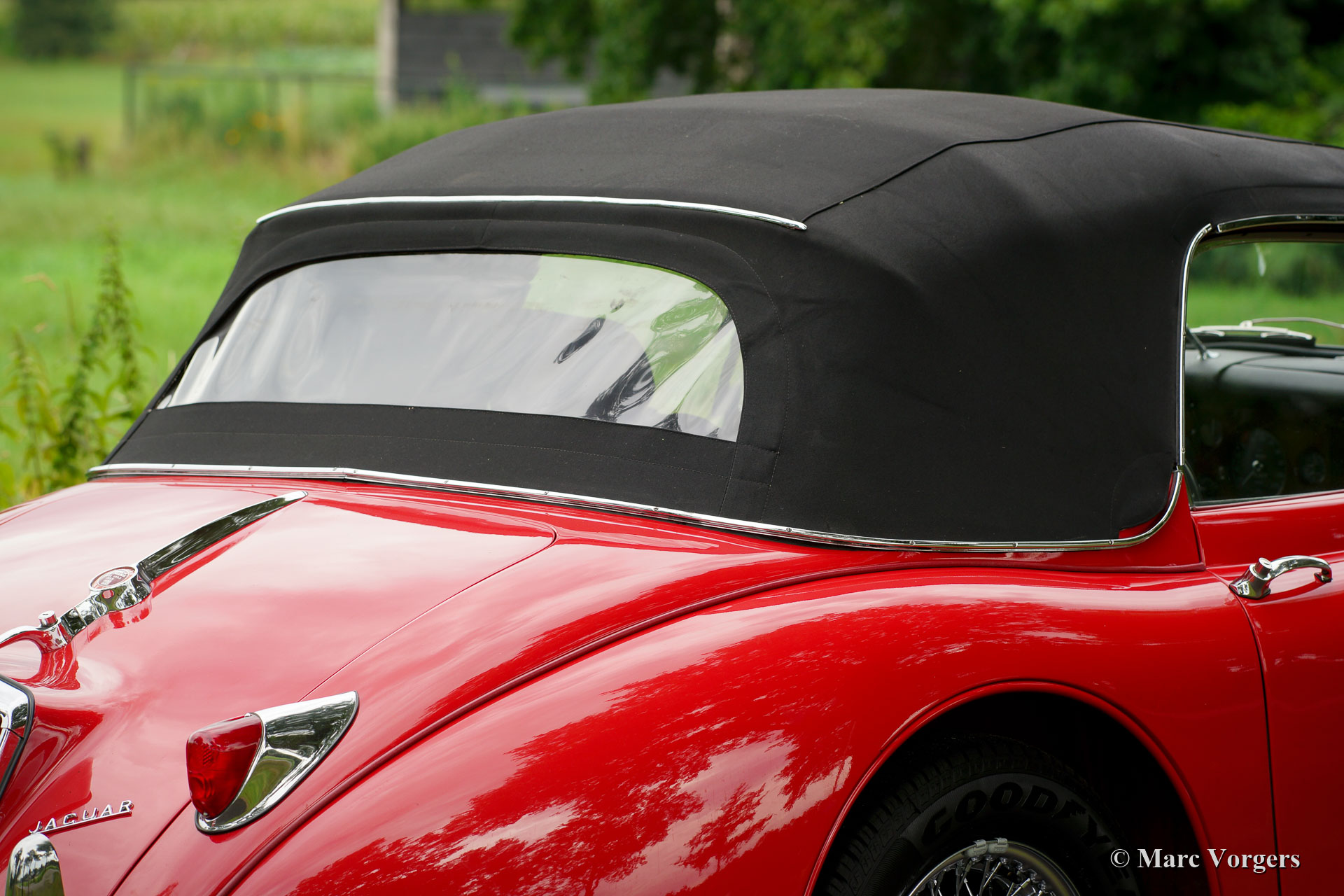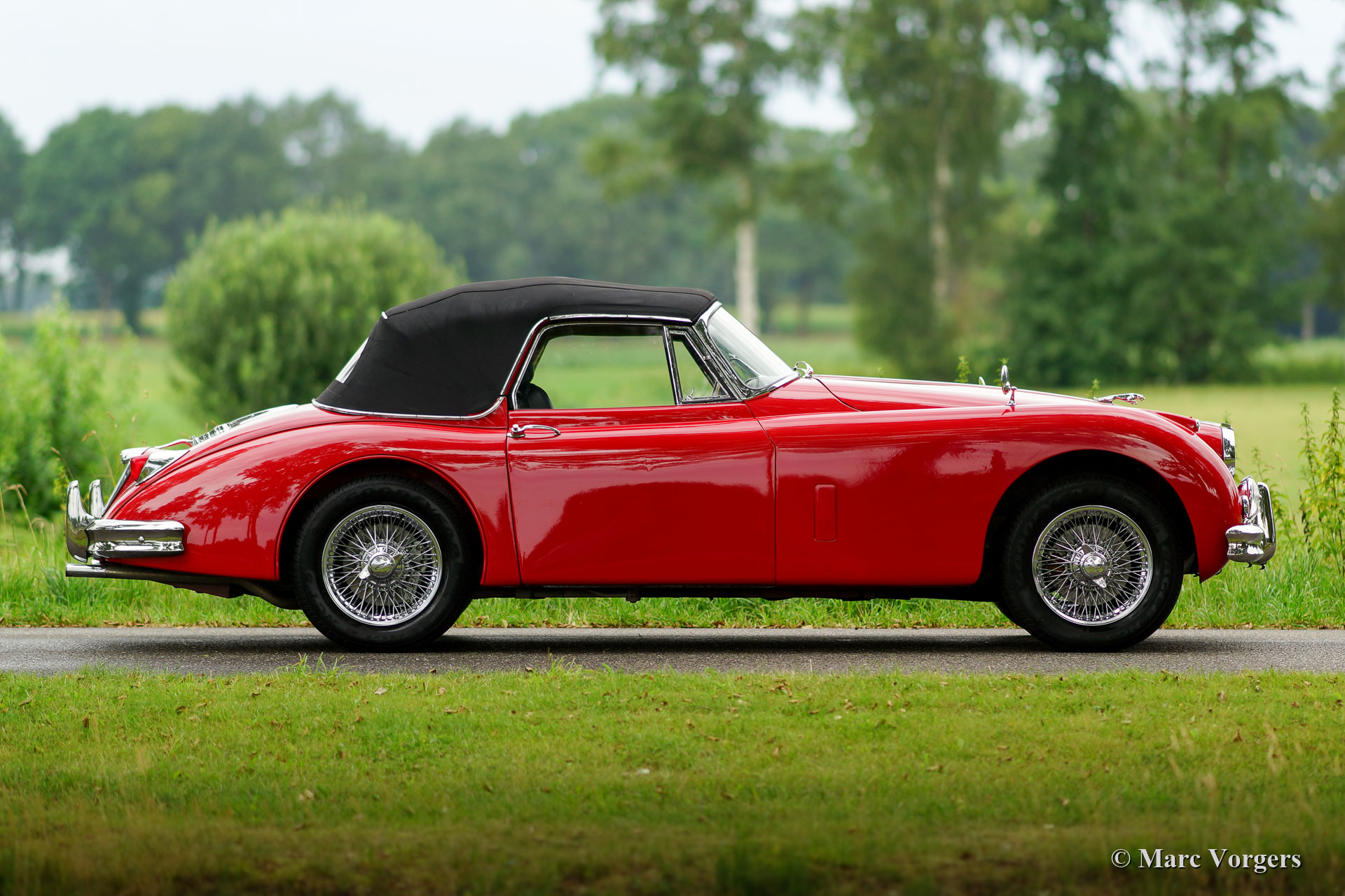 Jaguar XK 150 3,4 Liter DHC, Jahr 1958. Farbe rot kombiniert mit einer schwarzen Lederausstattung und schwarzem Teppich. Schwarzes Mohair-Verdeck und Verdeck-Abdeckung. Dieses großartige Jaguar XK 150 Drop Head Coupé (DHC) wurde Ende der 1990er Jahre in den Niederlanden umfassend restauriert und überholt. Eine vollständige Wiederherstellungsdatei ist vorhanden. Dieser fantastische Jaguar XK 150 DHC ist in sehr gutem bis ausgezeichneten Zustand; Das Auto fährt perfekt! Das Auto verfügt über Chrom-Speichenräder, spezielle Komfortsitze mit Kopfstützen, eine Armaturenbrett-Mittelverkleidung aus Holz, ein MotoLita-Sportlenkrad mit Holzkranz und zusätzliche Lucas SFT576-Nebelscheinwerfer vorne. Das Auto wird komplett mit einem FIVA-Ausweis geliefert. Ein fantastisches Fahrerauto!