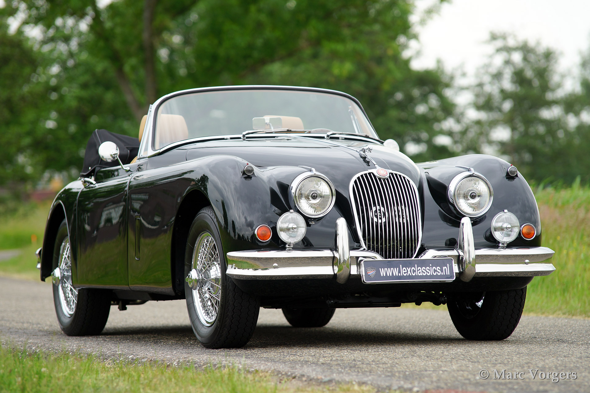 Jaguar XK 150 3.4 Litre DHC (Drophead Coupe), year 1961. Colour British Racing Green with a beige leather interior. Black mohair hood and hood cover. This beautiful Jaguar XK Drophead Coupe was extensively and professionally restored. This car features a bespoke interior with additional stowage space between the seats and special comfort seats.