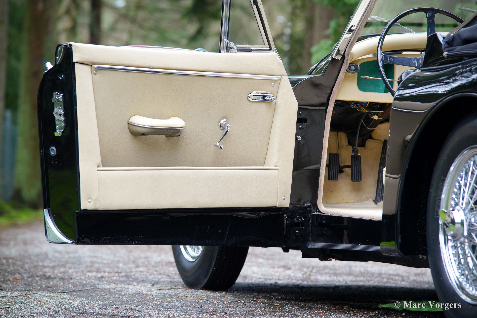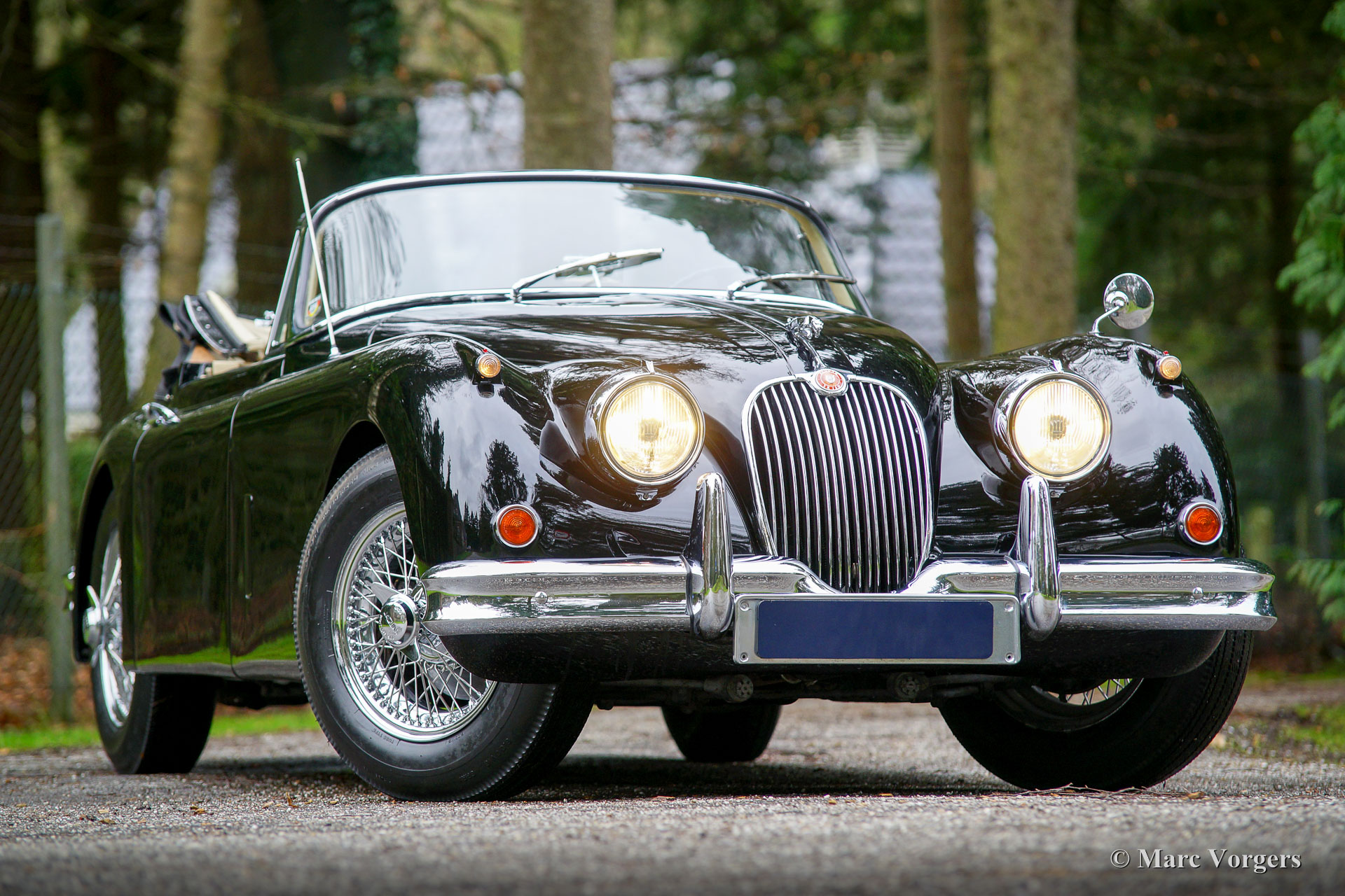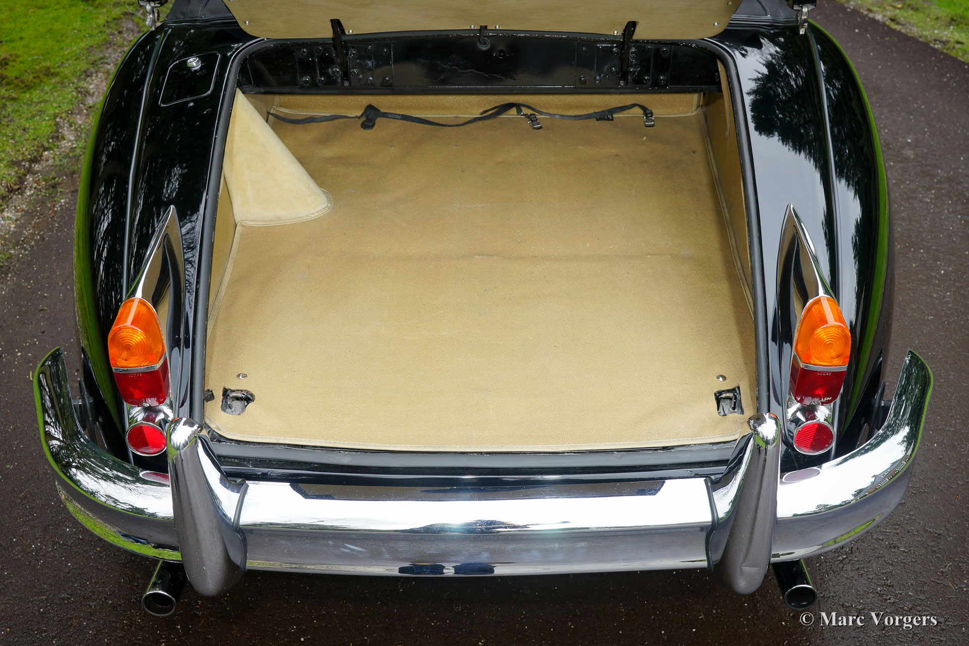 Jaguar XK 150 3.8 Liter DHC, Jahr 1960. Farbe schwarz mit einer blassen beigen Lederausstattung und einer schwarzen Kapuze. Diese wundervolle Jaguar XK 150 Drop Head Coupe (DHC) wurde in den späteren neunziger Jahren ‚‘body-off‘ wiederhergestellt in Deutschland. Das Auto wurde in die Niederlande importiert im Jahr 2015. Anschließend wurde das Auto teilweise abgebaut und der Körper wurde bis auf das blanke Metall von dem Lack entfernt. Dann wurde ein hochwertiges neues Lacksystem angewendet. Der schwarze Lack zeigt sich wie Glas und sie kombiniert prächtig mit den hervorragenden Chrom-Teile. Das Auto ist in einem hervorragenden Zustand. Der 3.8 Liter XK-Motor ist Zeit korrekt und es liefert eine großartige Menge an Drehmoment. Die Kraftübertragung auf die Hinterräder erfolgt über ein Getrag 5-Gang-Schaltgetriebe. Das ursprüngliche Getriebe ist auch vorhanden. Dies ist eine feine XK 150 DHC mit dem Großen 3,8 Liter Motor in einer ganz schönen Farbkombination.