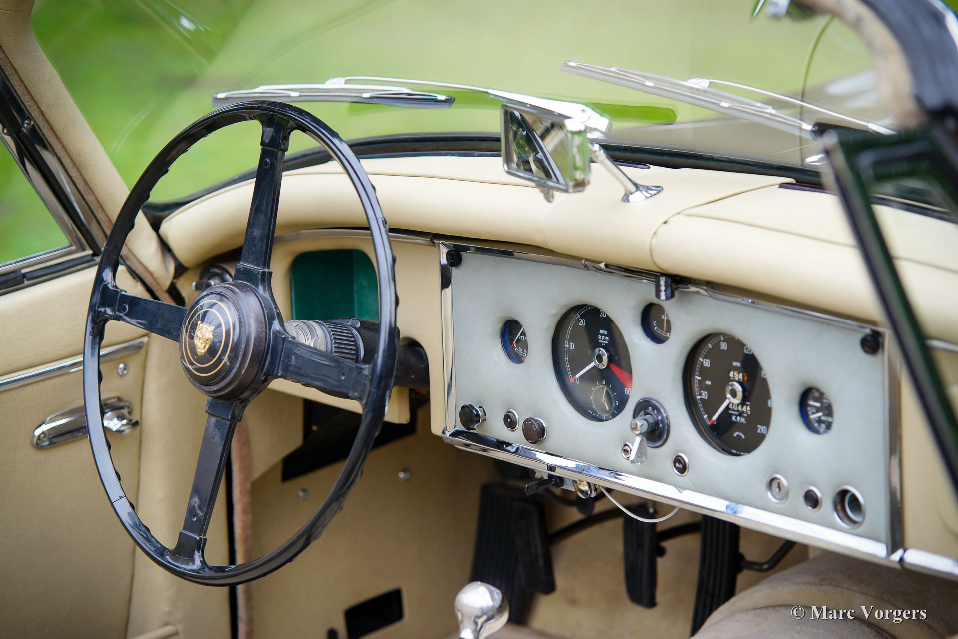 The XK 150 replaced the Jaguar XK 140 in 1957. The undercarriage of the XK 150 was for the greater part equal to the XK 140’s, but its bodywork was new and broader. Though its design was again very refined, it was somewhat less dynamic as compared with the XK 120 and XK 140. The bodywork was less sleek and the design of the characteristic wing lines was now less markedly sloping. The increased width of the bodywork resulted in a wider grille which, in line with the best Jaguar’s tradition, was delicately integrated in its design. The XK 150 was the first of XK series with an unbroken panoramic windscreen.
