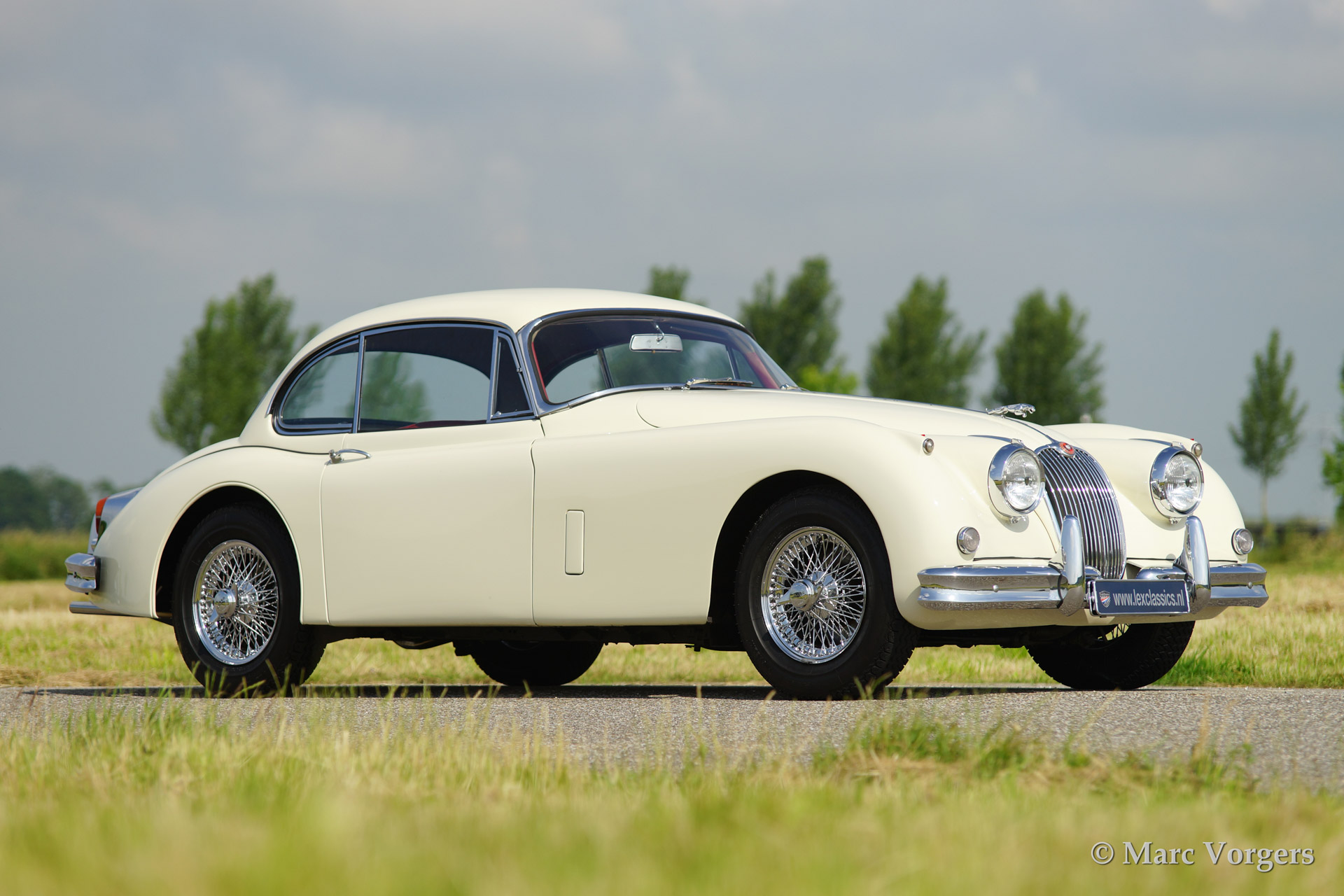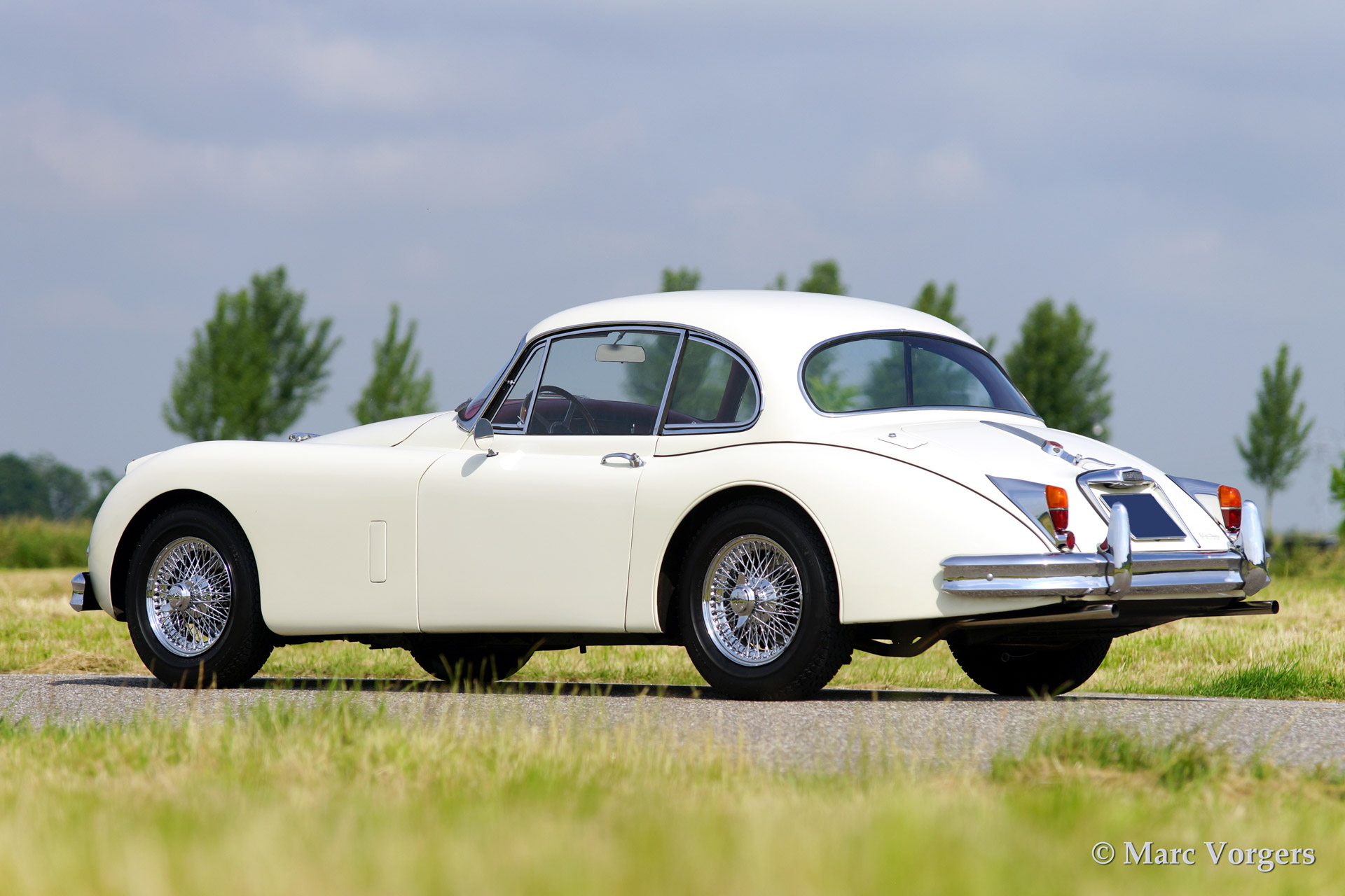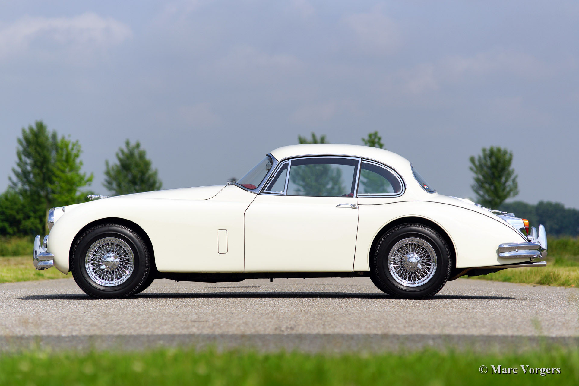Jaguar XK 150 3.8 Litre Fixed Head Coupe (FHC), year 1961. Colour Old English White with a red leather interior. This fabulous Jaguar XK 150 was extensively restored. The automobile shows beautiful original details and a delightful classic colour scheme. Fitted with the powerful 3.8 Litre six cylinder XK engine mated to a four speed manual gearbox with as bonus an overdrive!