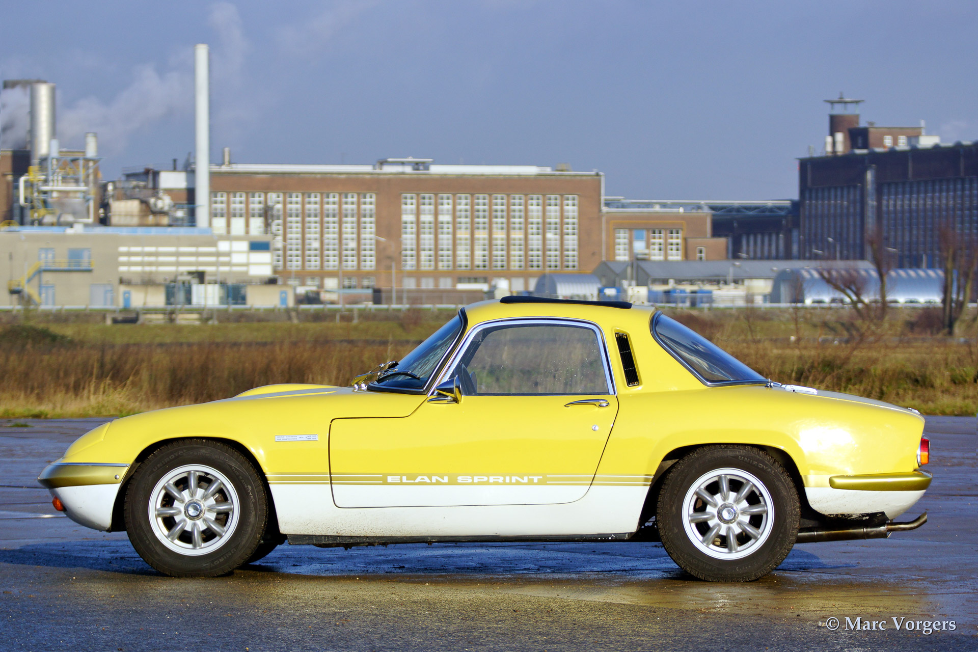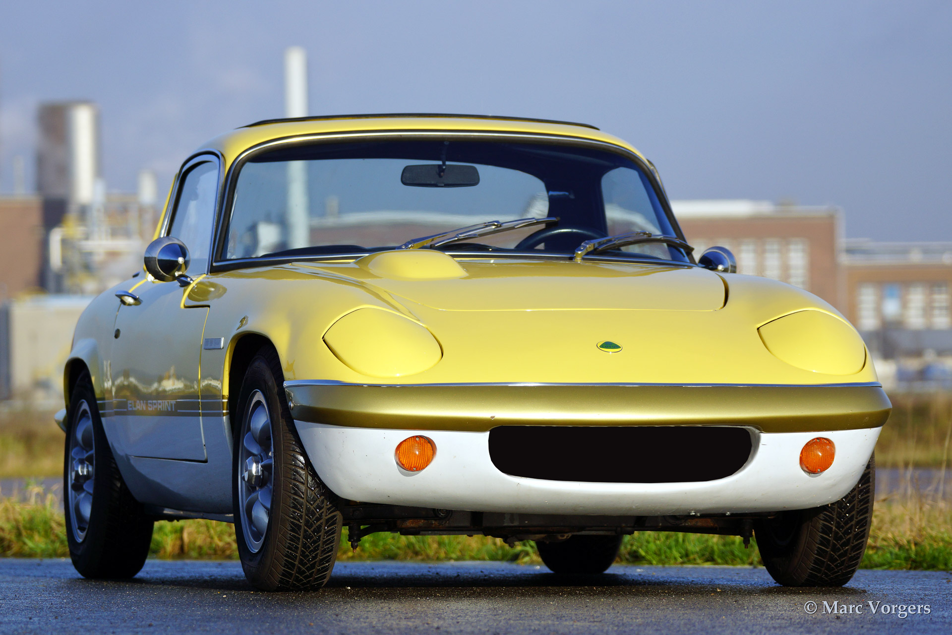 Lotus Elan 'Sprint' Fixed Head Coupe, year 1971. Colour two tone light yellow over white separated by a golden 'Sprint' stripe. Black vinyl interior with black carpet. The car is fitted with the powerful Sprint 'Big Valve' engine.