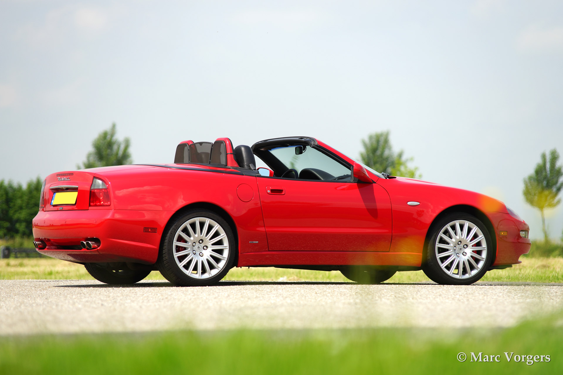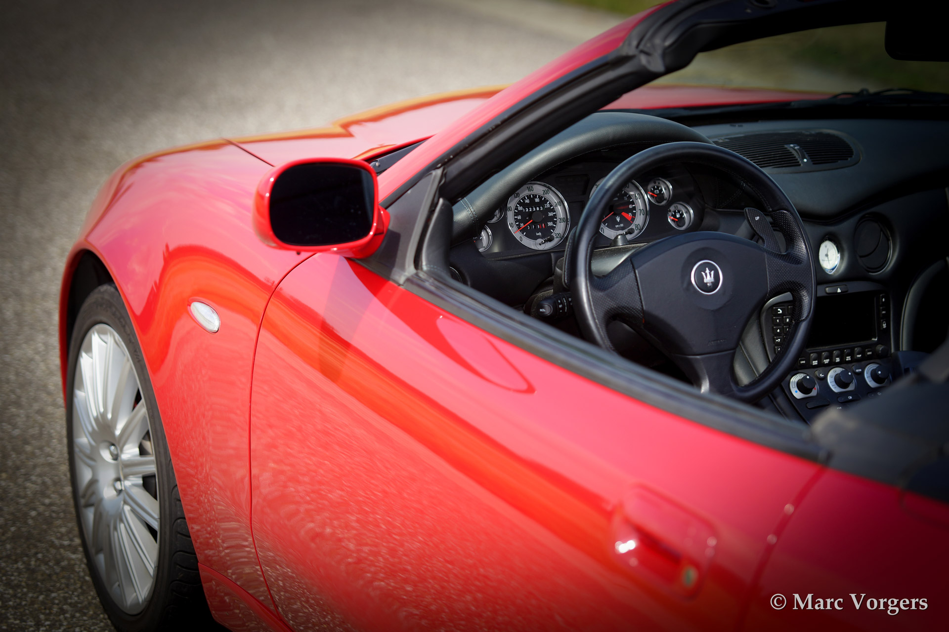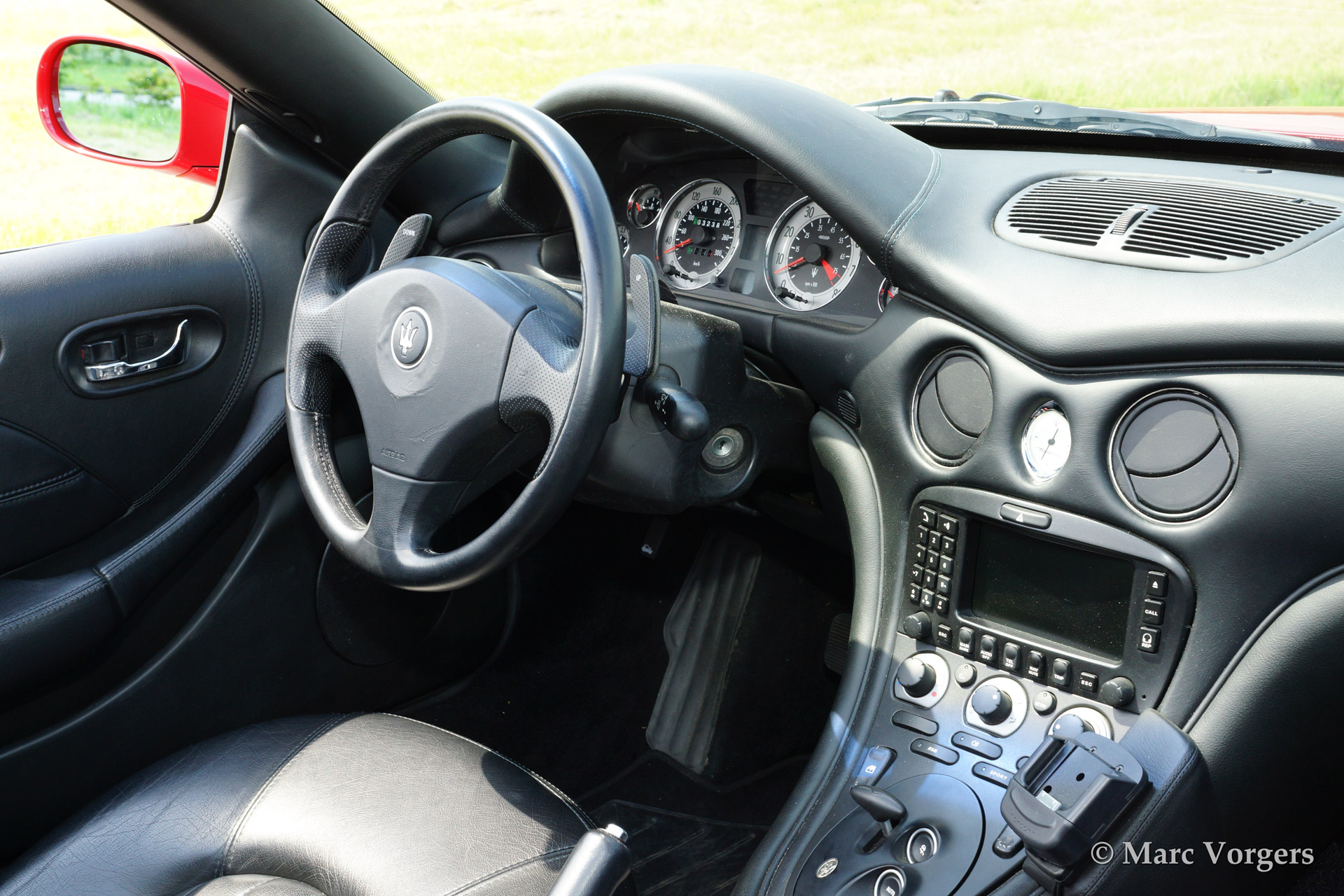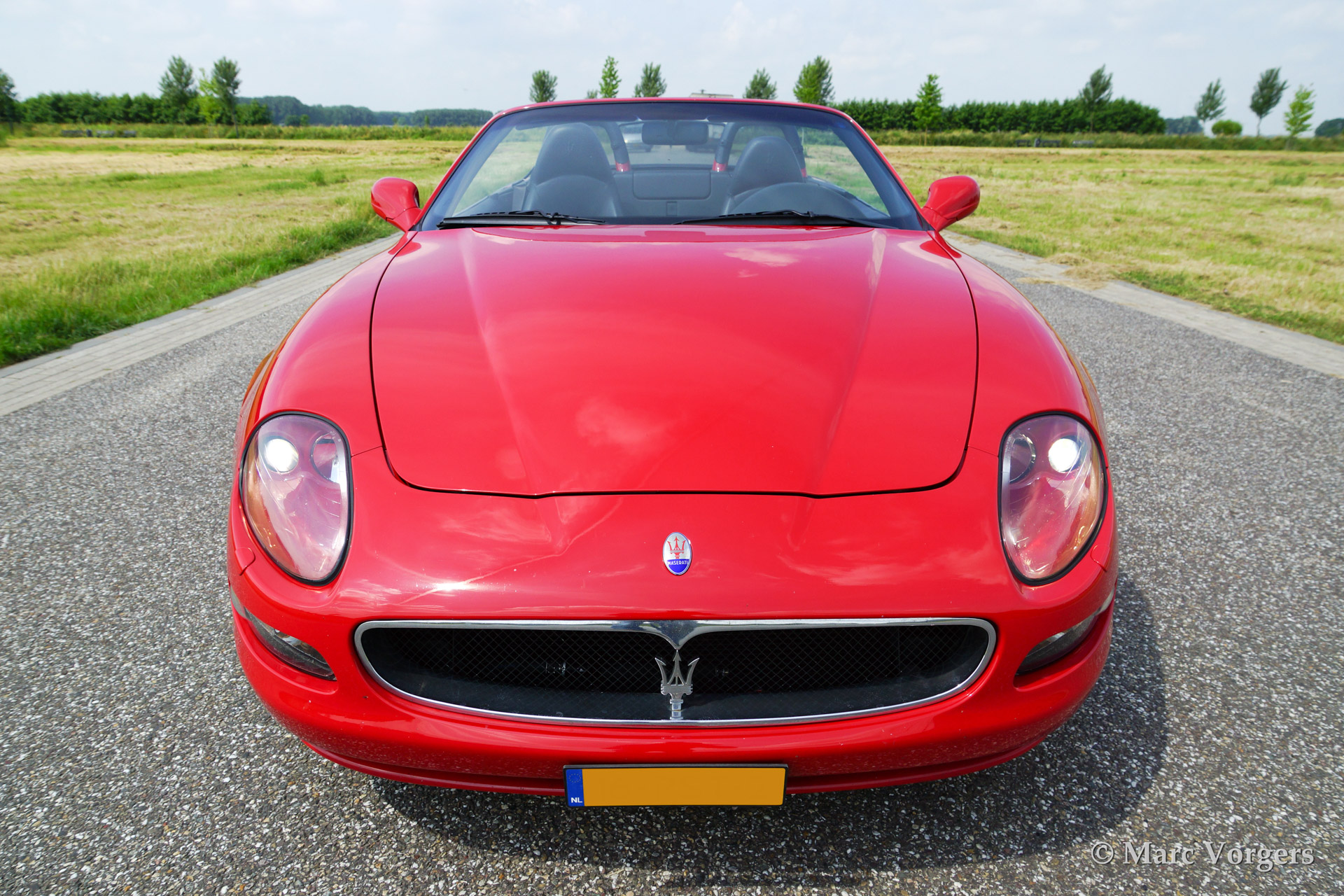 Maserati Spyder GT Cambiocorsa, year 2002. Colour red with a black leather interior and a black soft top. This Maserati Spyder features a Cambiocorsa 6-speed F1 gearbox with paddles at the steering wheel.