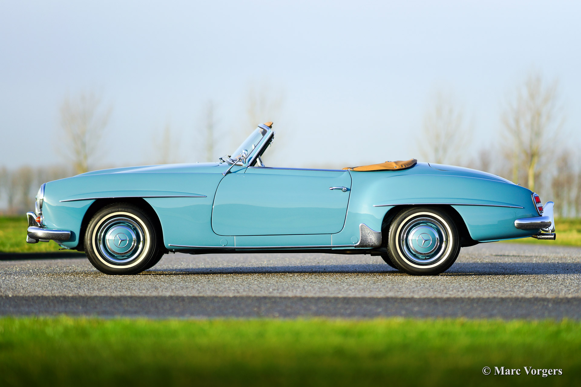 The Mercedes-Benz 190 SL roadster saw the light of day in the year 1955 impersonating a less expensive and less advanced alternative for the 300 SL roadster. Technically the 190 SL roadster shared nothing with big brother 300 SL. But the bodywork design and interior design, which appealed to many people, were strongly inspired by the 300 SL roadster. The Mercedes-Benz 190 SL was a real touring-convertible in opposite to the 300 SL roadster which was a true sports car. But the 190 SL was affordable (to Mercedes-Benz standards) and the car found a great share of enthusiastic owners primarily in the sunny states of the USA. The sales success of the 190 SL was based on the good looks of the car but also because of the excellent comfort, the excellent mechanics and its reliability. The Mercedes-Benz 190 SL was equipped with a four-cylinder engine with a cylinder capacity of 1897 cc. and fitted with two carburettors. The standard four-speed manual gearbox was fully synchronized and featured floor shift. From 1956 on the 190 SL was fitted with standard power brakes. During the entire period of production a very nice hardtop was available. The story goes that many European owner ordered the roadster with the hardtop and hardly ever took it off! In the year 1963 the 190 SL was succeeded by the new Mercedes-Benz 230 SL roadster which was going to be known by the nickname "Pagoda".