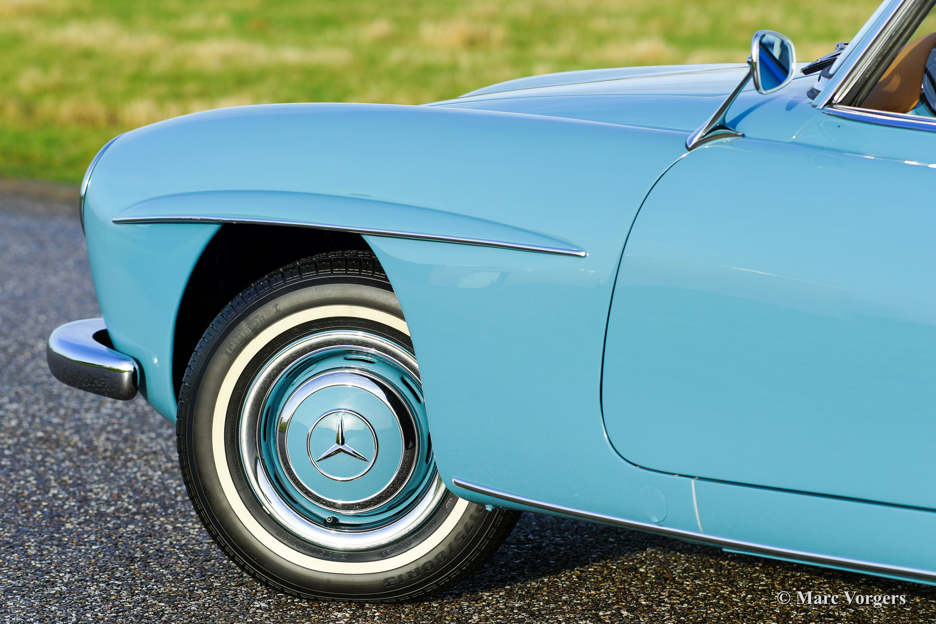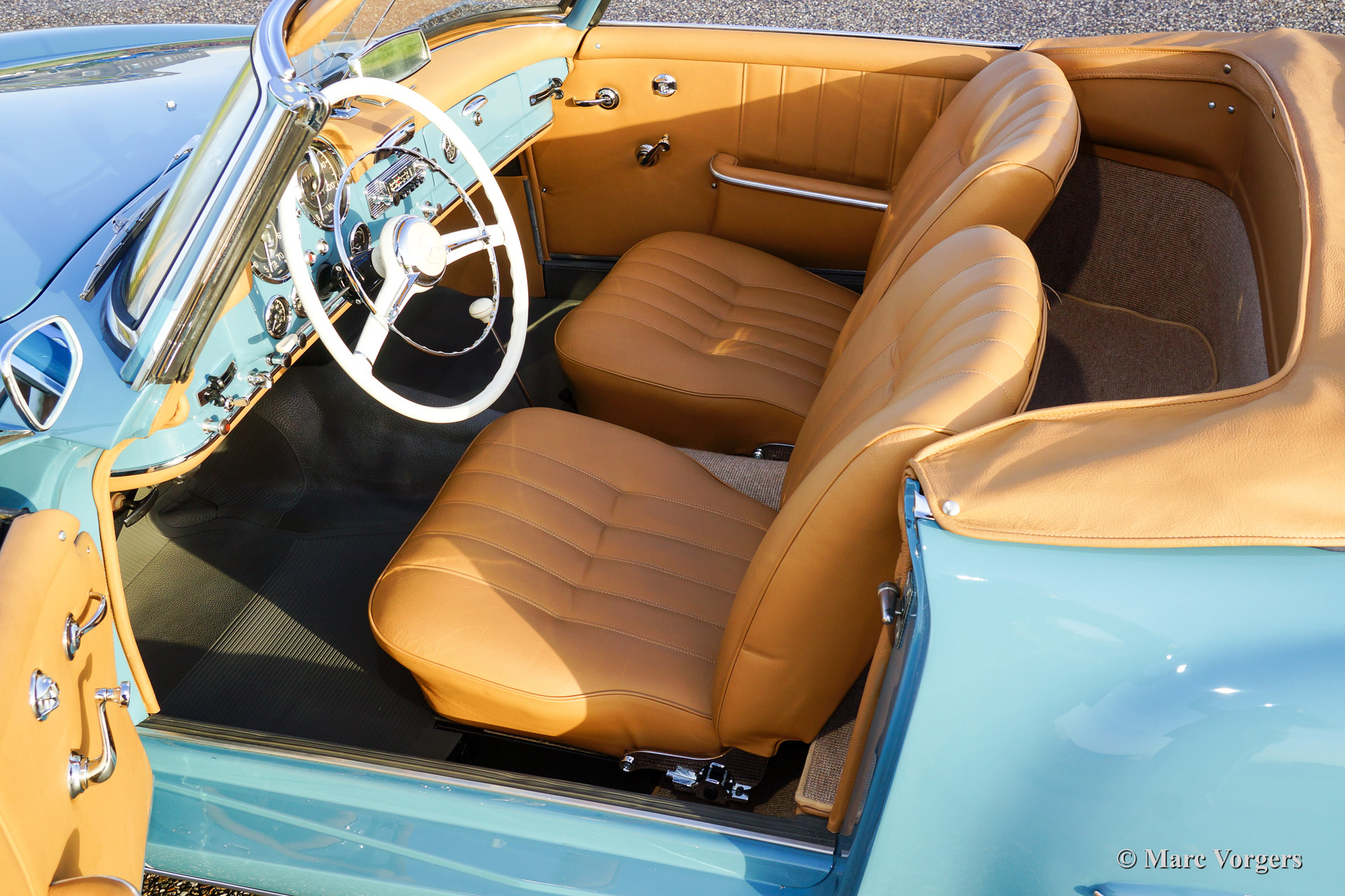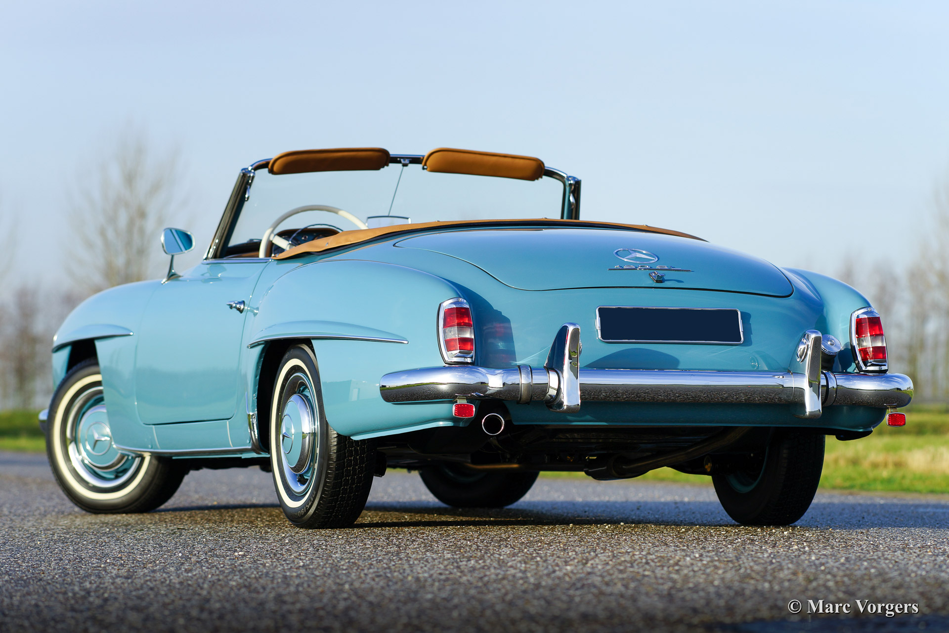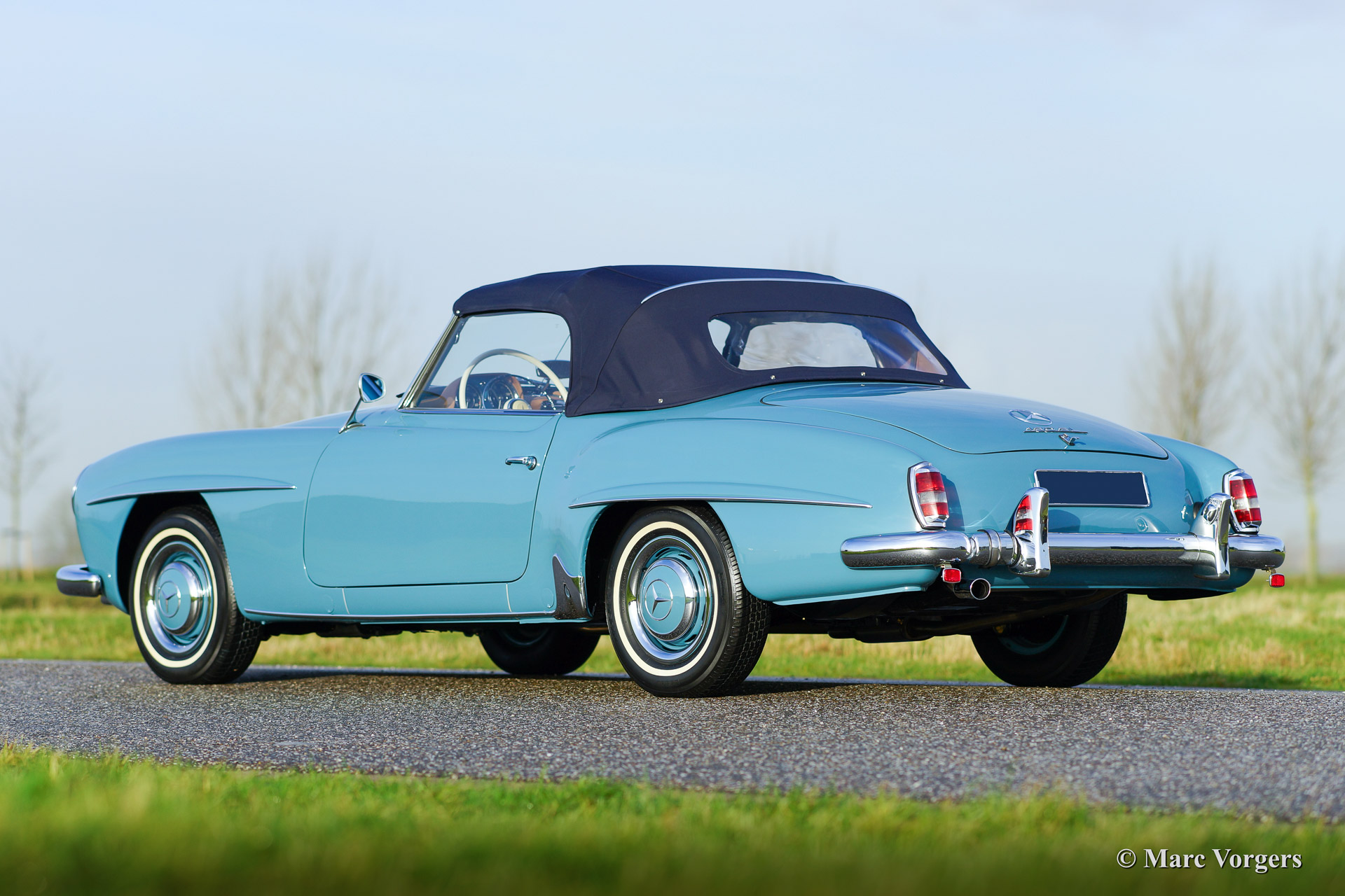 Mercedes-Benz 190 SL, year 1959. Chassis number: 1210429500XXX. Body colour 'Hell Blau' with a beige leather interior, grey rubber carpet and a dark blue mohair soft top. This magnificent 190 SL was sold new in the USA. The automobile was imported to the Netherlands in the year 2004.