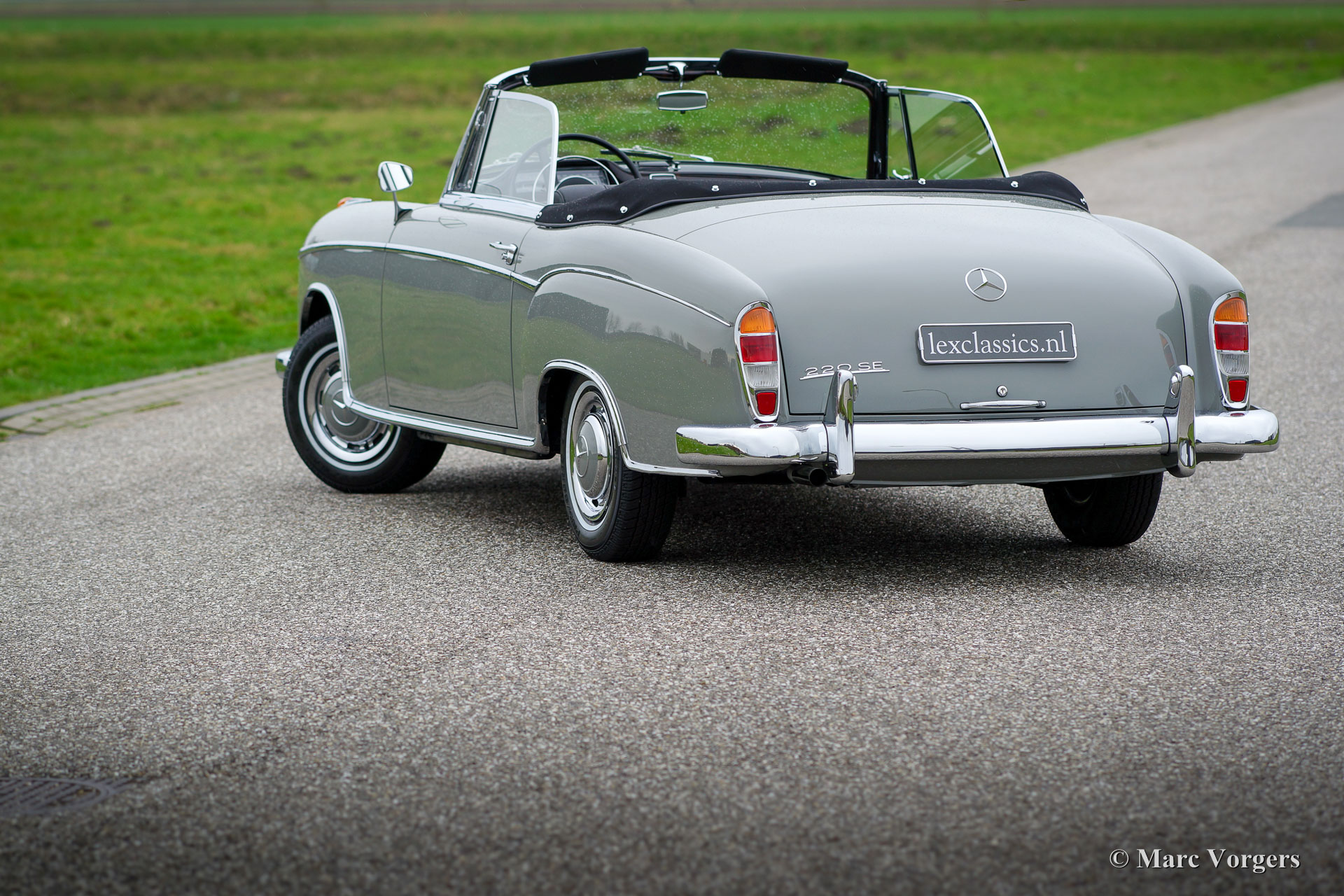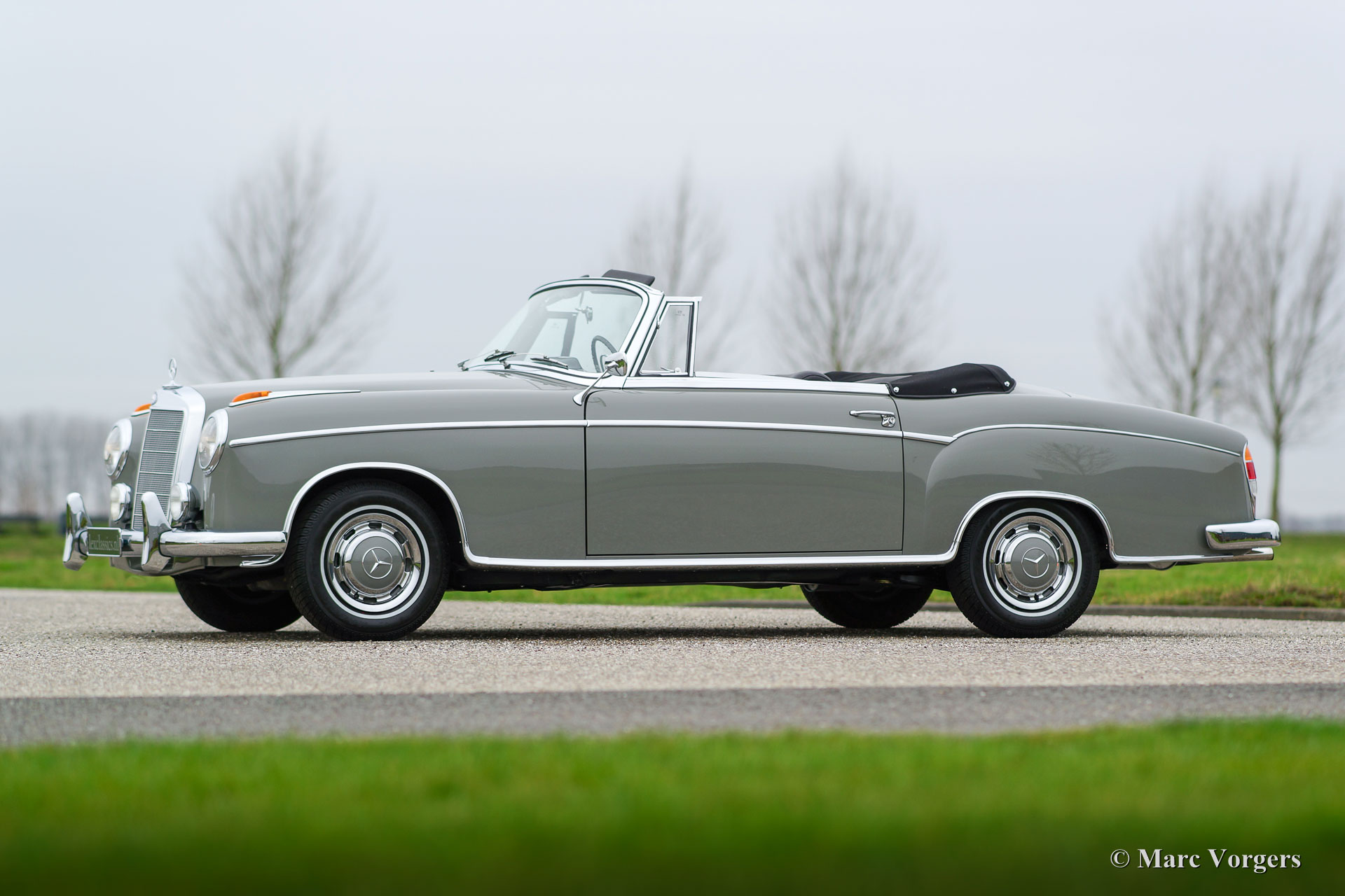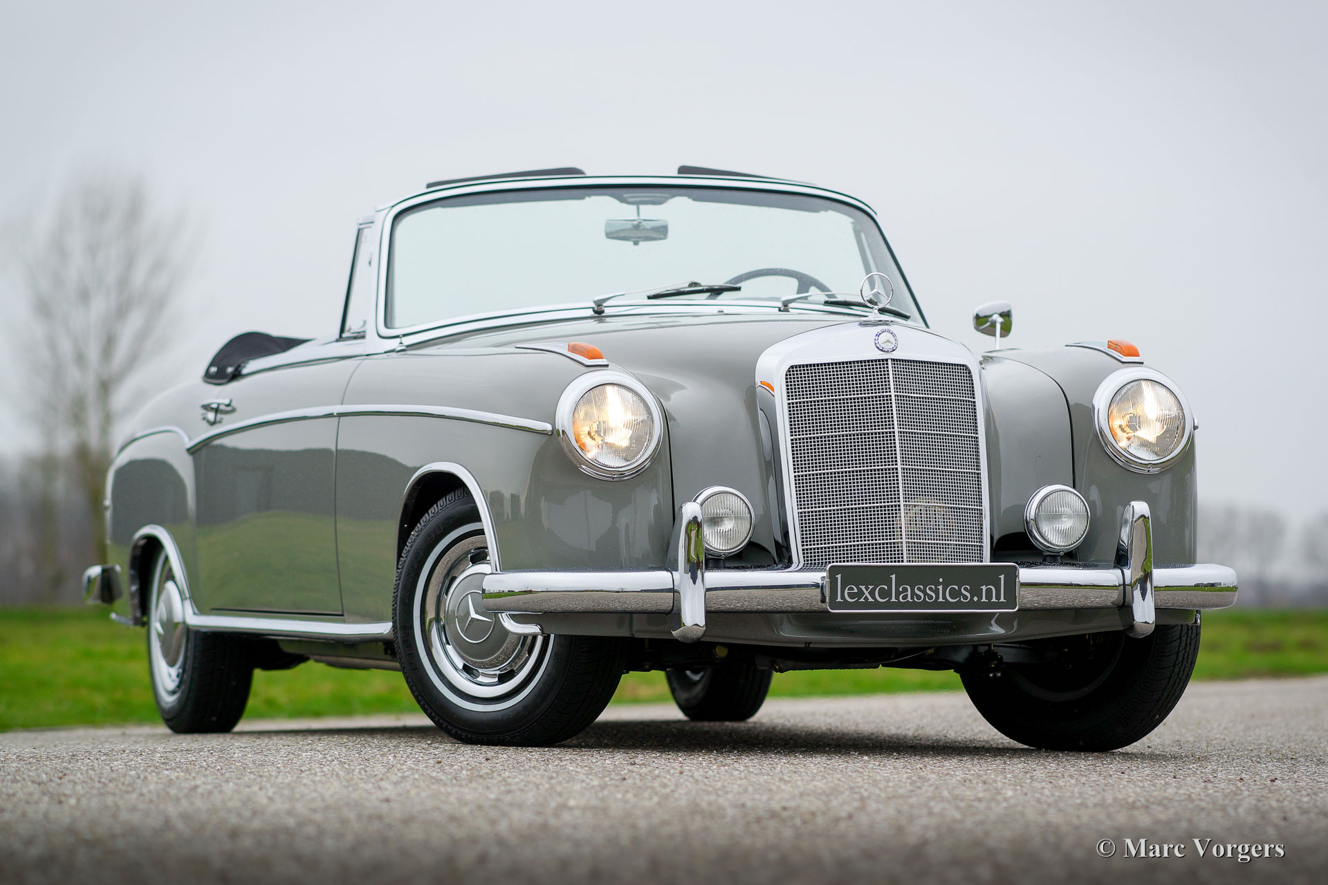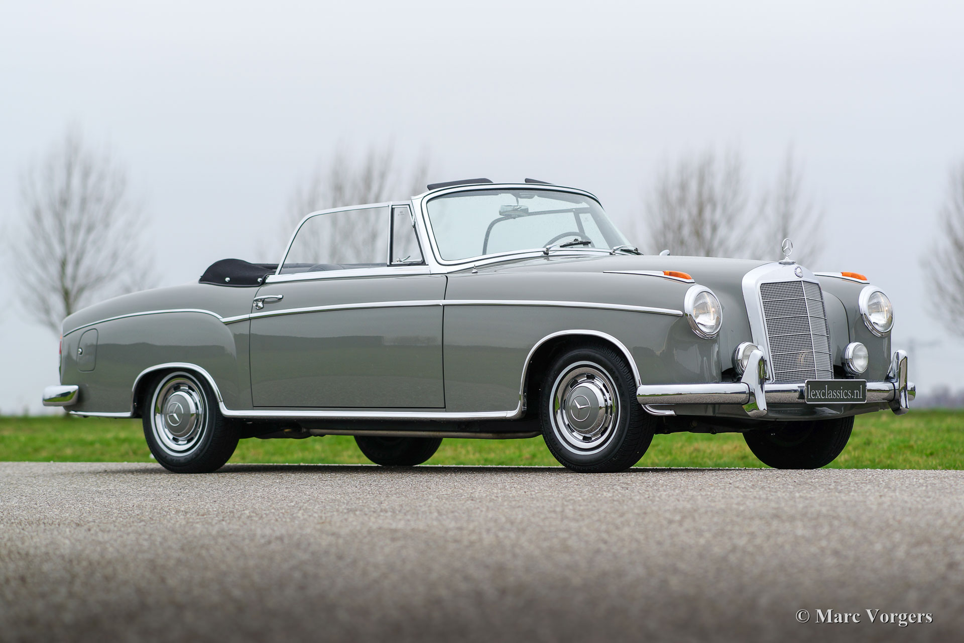 Mercedes-Benz W128 220 SE Cabriolet, Jahr 1959. Farbe Grau (Zementgrau, Farbcode 186) mit einem dunkelgrauen Lederinterieur und grauem Teppich. Schwarze Mohair Kapuze und Verdeck Abdeckung. Dieses prächtige Automobil wurde ausgiebig und perfekt von einem Spezialisten restauriert. Eine Foto-Reportage der Restauration ist vorhanden wie ein M.B. ‘Wagenkarte‘, die bestätigt, dass das Auto ‚‘matching numbers‘ hat. Dieses feine Mercedes-Cabriolet ist in perfektem Zustand; concours! Von 1958 bis 1960 wurden nur 1.112 Exemplare dieses Modelles gebaut.