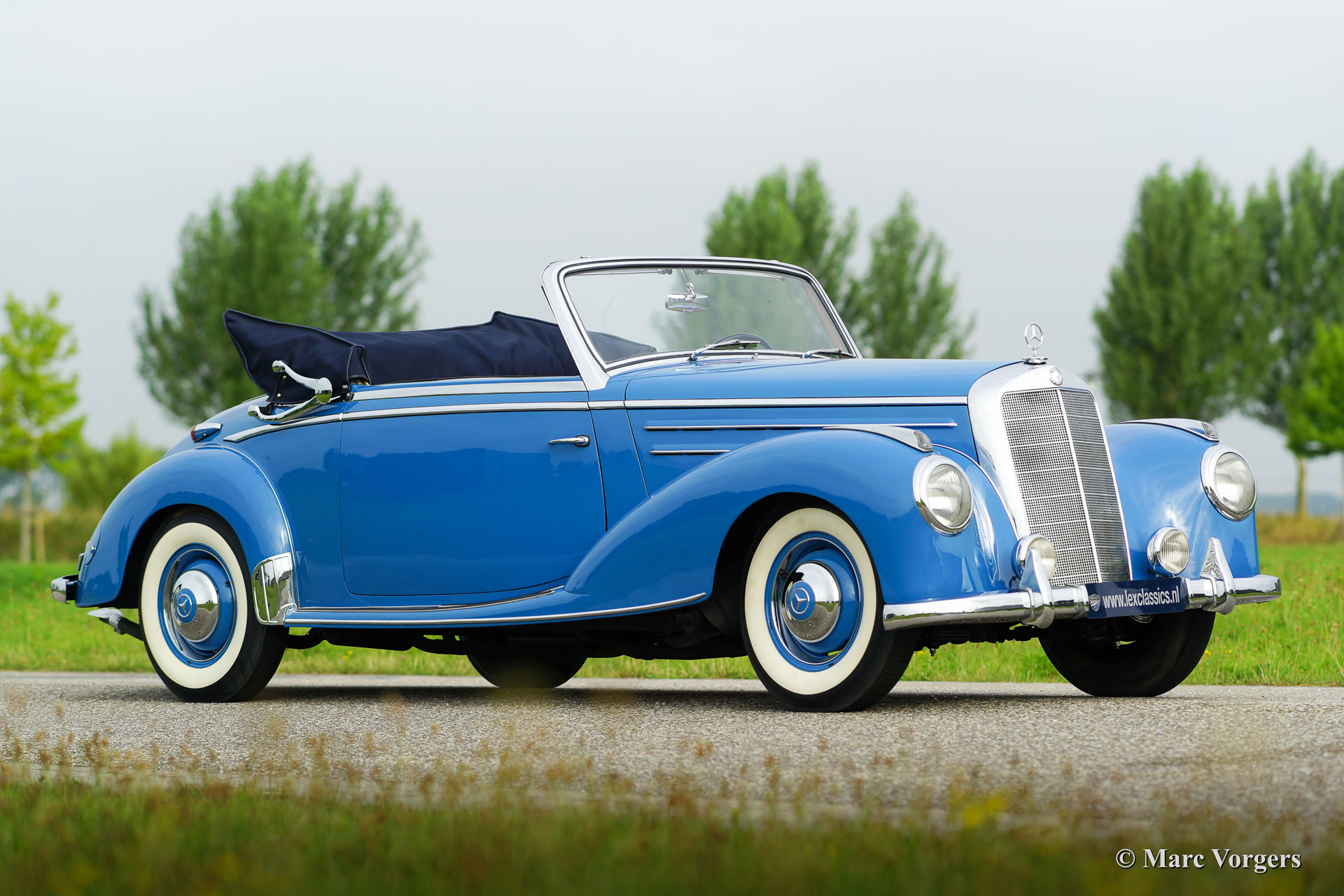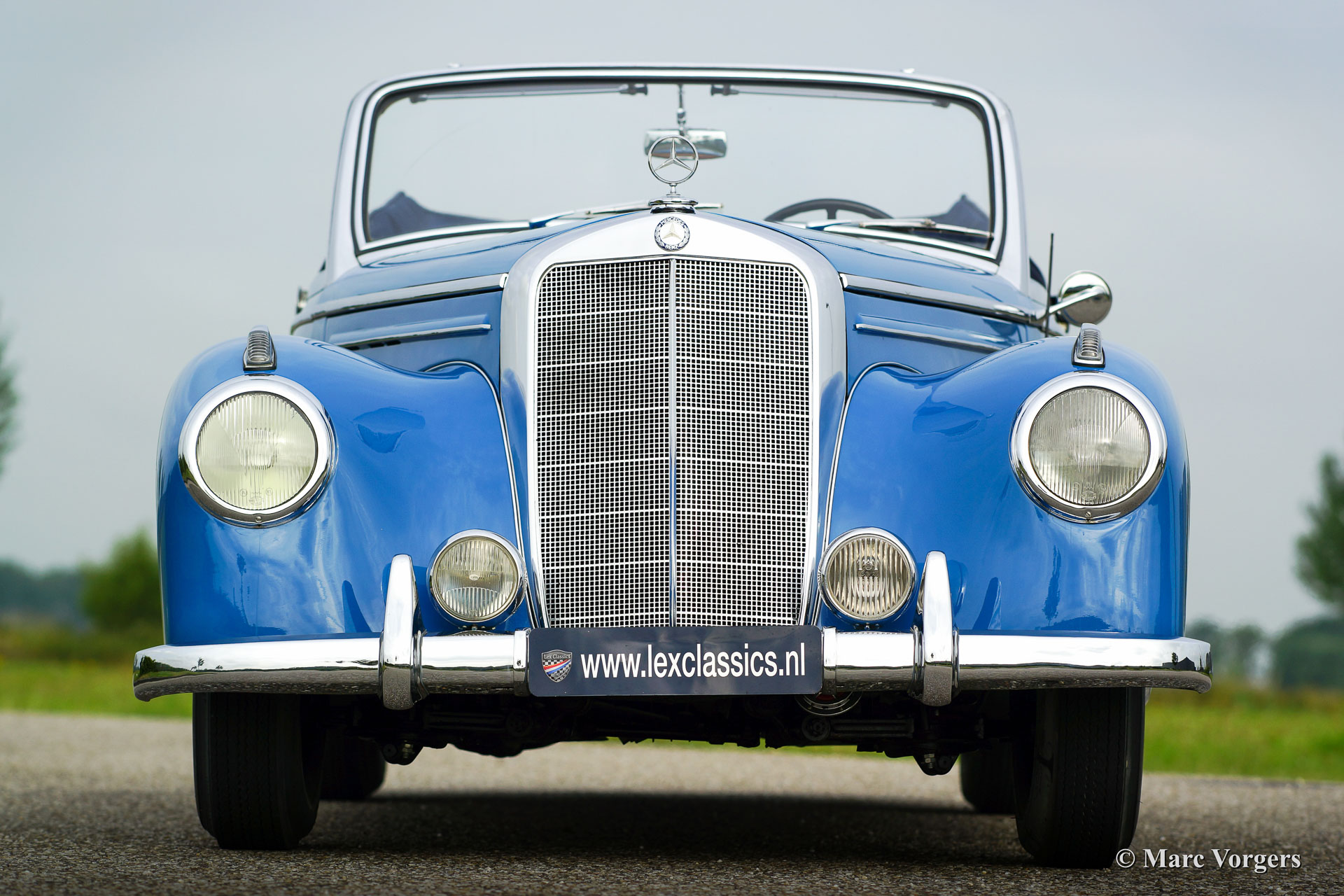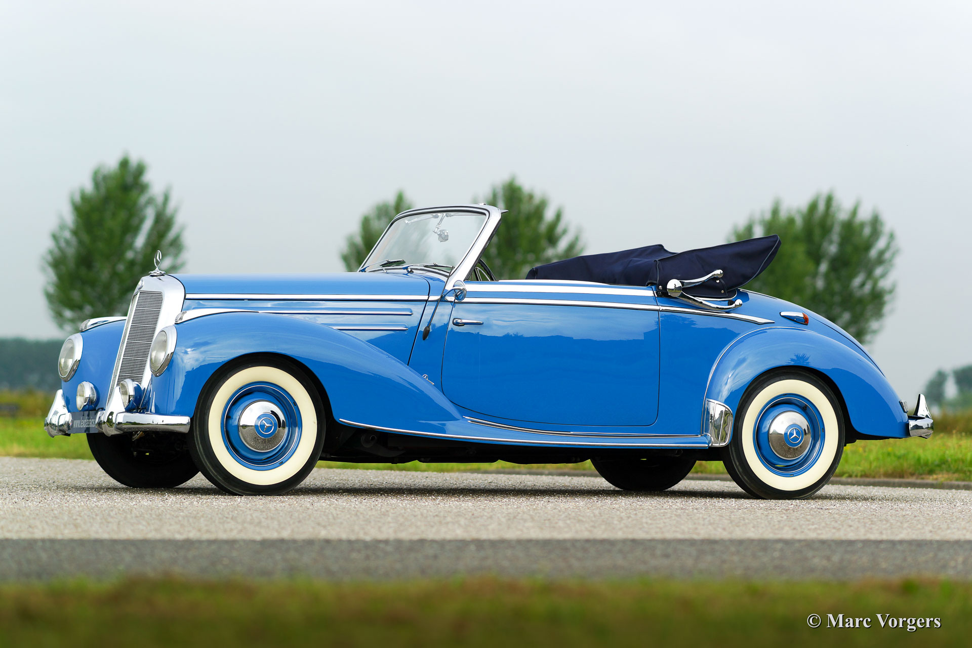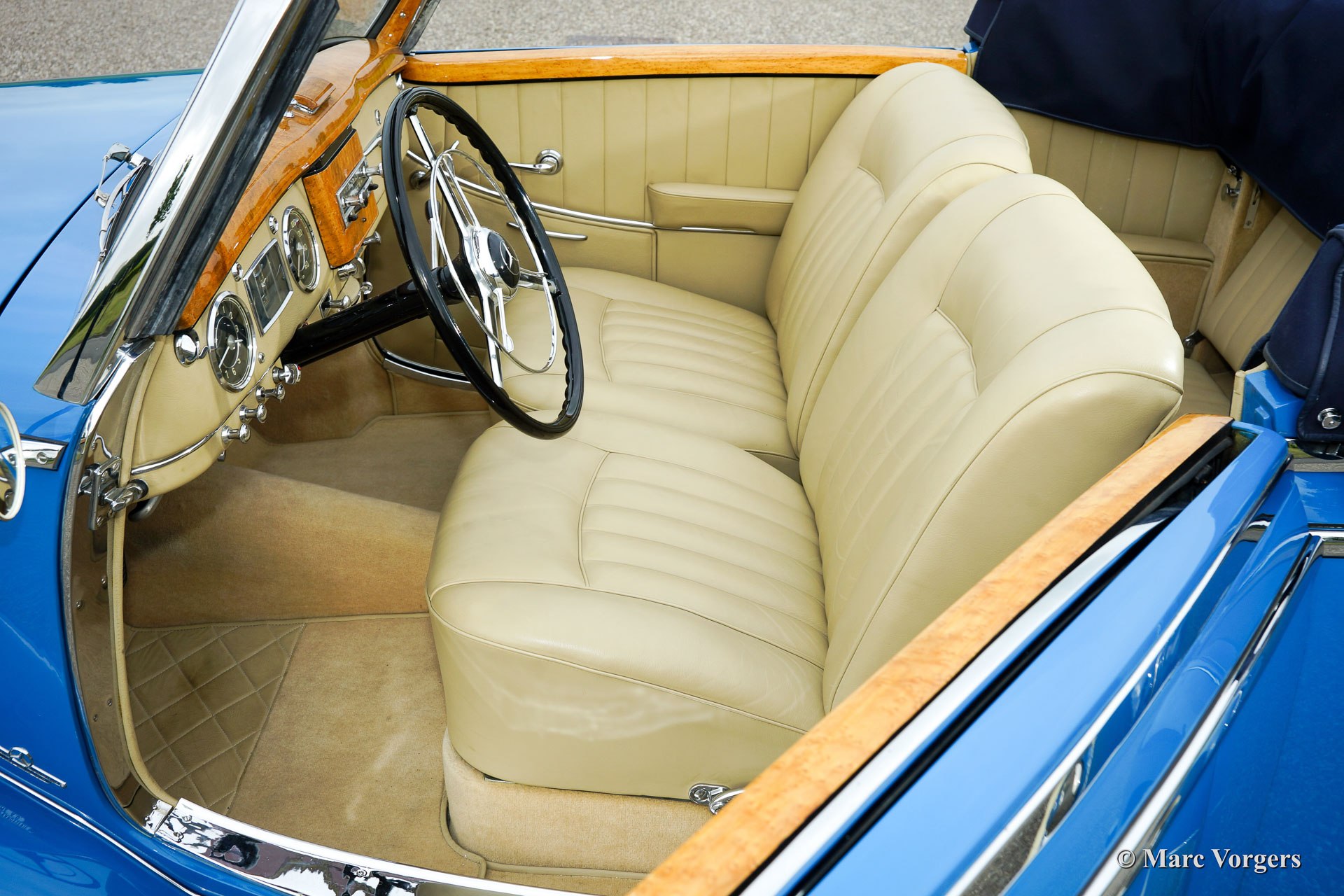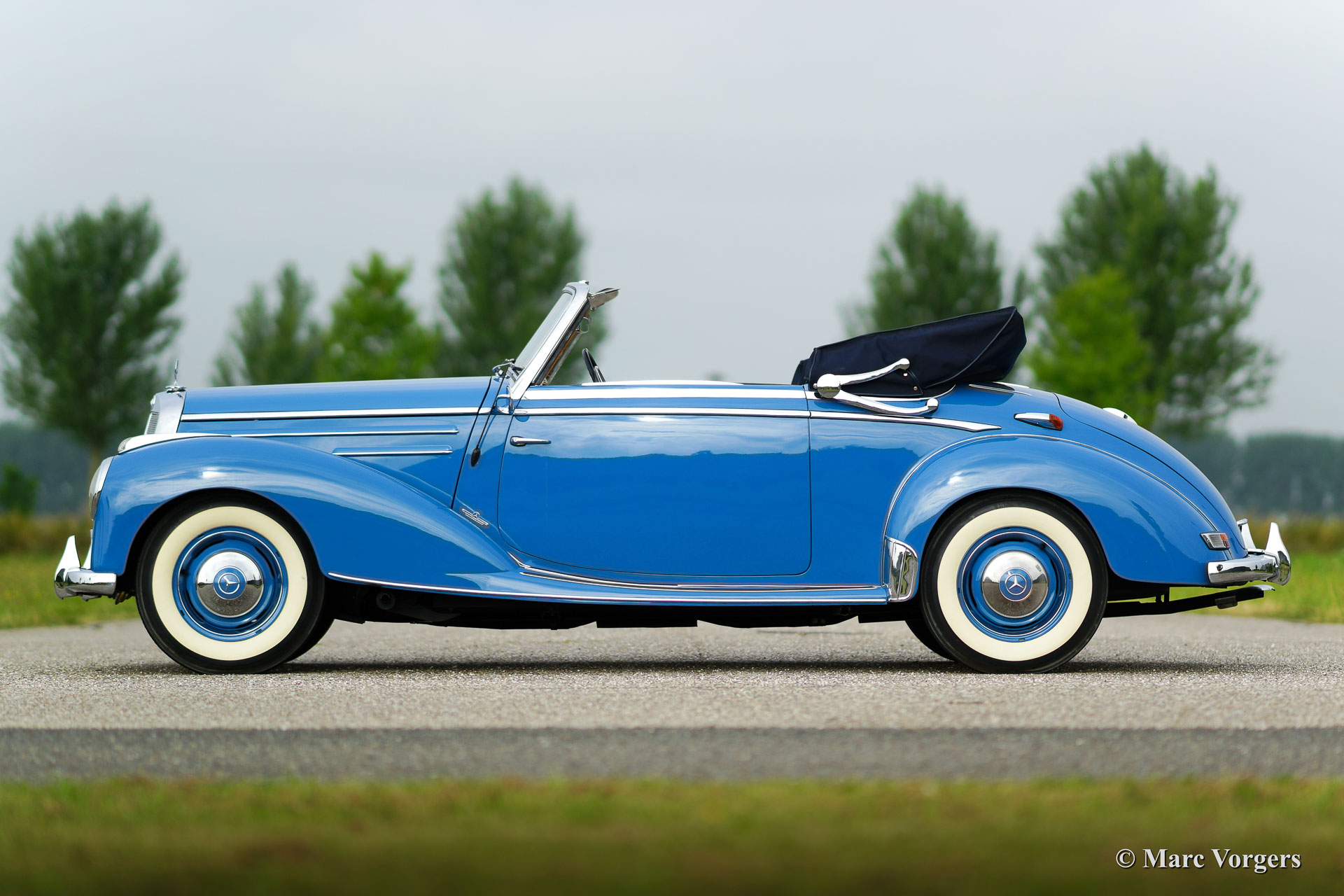 Mercedes-Benz 220A Cabriolet, Jahr 1954. Fahrgestellnummer 1870124500XXX. Farbe Blau mit beige Lederausstattung und beige Teppich. Dunkelblau Mohair Verdeck und Verdeck Abdeckung. Dieses schöne Mercedes Cabrio wurde in der Vergangenheit umfangreich 'Körper aus‘ wieder hergestellt. Eine Fotoreportage der Restauration ist vorhanden. Das Auto ist in einem sehr gutem bis exzellenten Zustand und das Auto fährt herrlich. Das Auto ist schon seit dem Jahr 1965 in den Niederlanden. Den letzten zehn Jahren war das Automobil Teil einer Autosammlung.