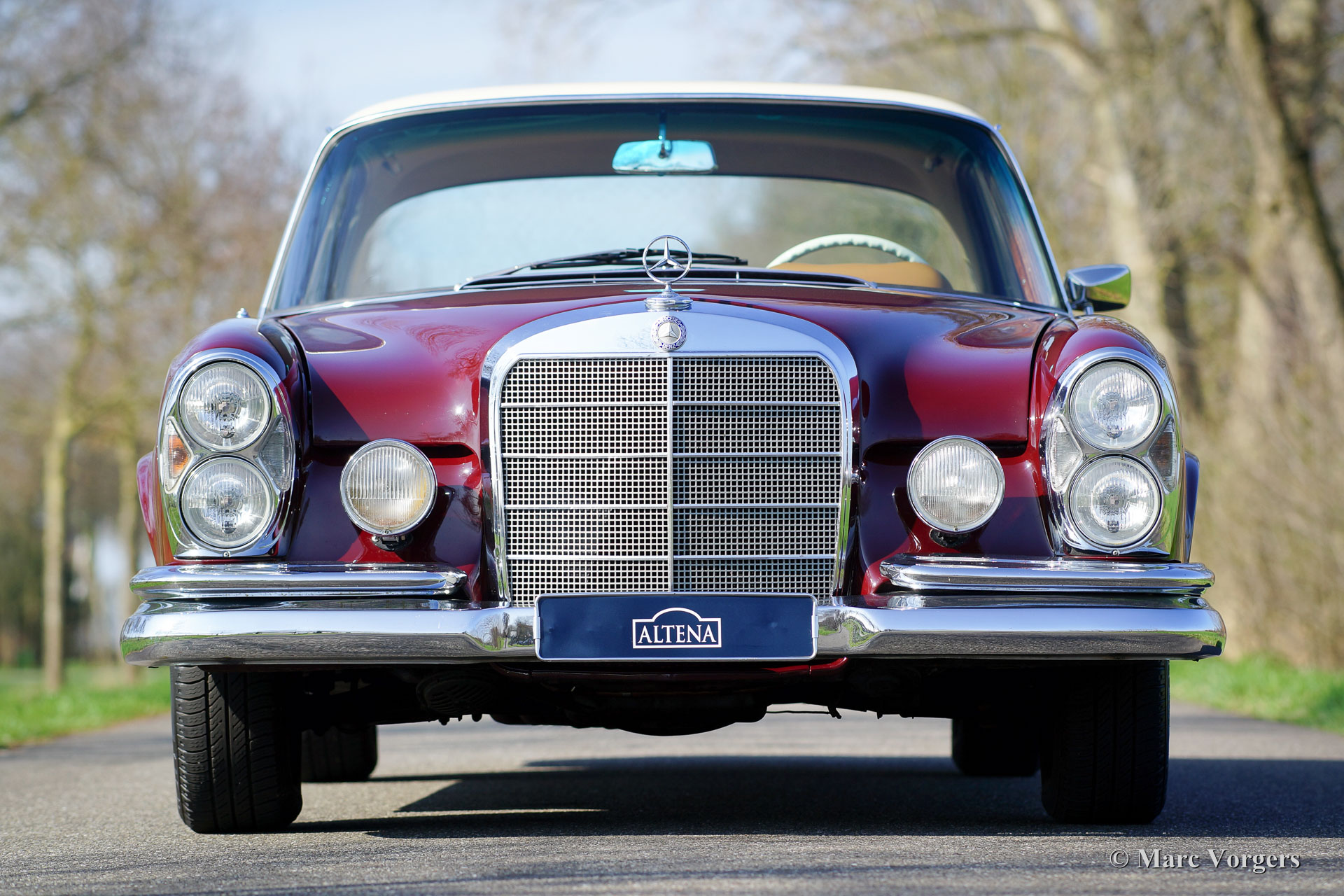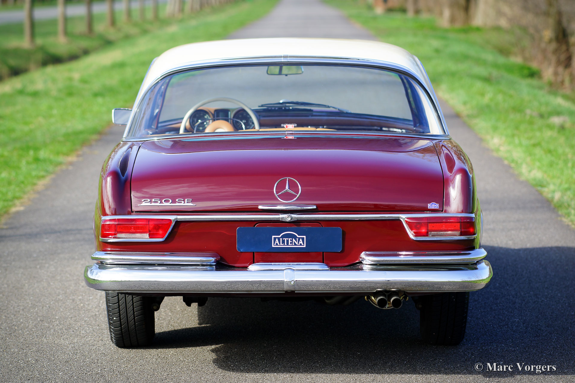 Mercedes-Benz 250 SE Coupe (W108), Jahr 1968 (Erstzulassung). Farbe dunkelrot mit einer Cremefarbiges Dach. Beige Leder Interieur und beige Teppich. Dieses sehr beeindruckende und recht große Mercedes-Benz 250 SE Coupé ist in einem sehr guten Originalzustand und das Auto fährt sehr bequem. Ganz Besonderes ist die Anwesenheit eines manuellen Getriebes, da die meisten W108 Autos mit Automatik verkauft wurden. Dieses schöne Coupé ist sehr originell und es zeigt einige Gebrauchsspuren. Der Körper wurde in der Vergangenheit neu lackiert und der reibungslose Sechszylinder-Reihen-Motor wurde überholt. Ein herrliches Fahrer-auto in sehr gutem Zustand!