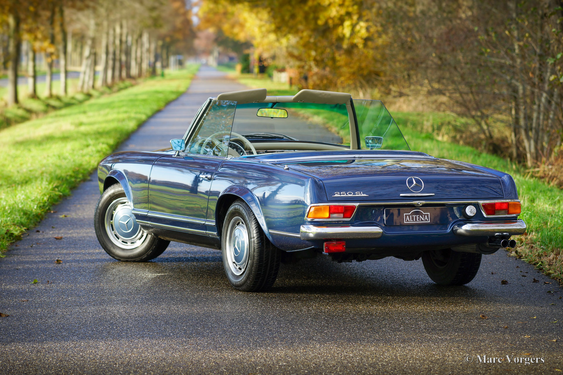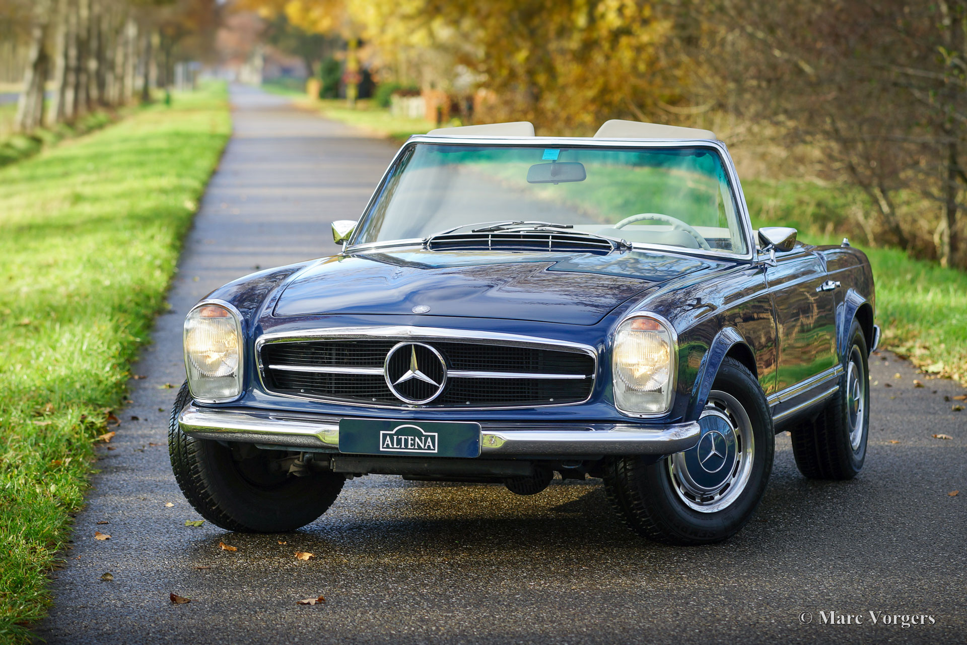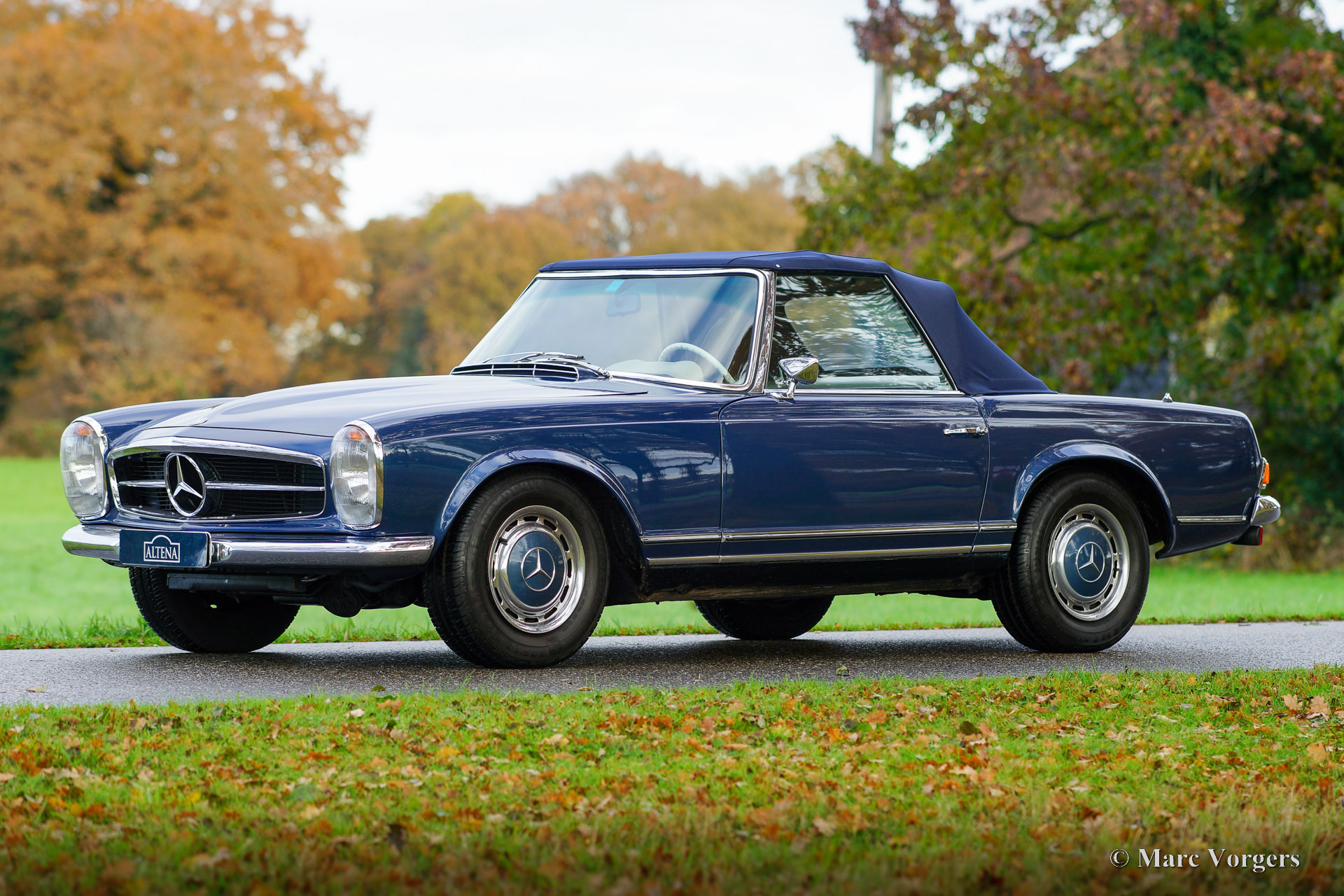Mercedes-Benz 250 SL „Pagode“, Jahr 1968. Werksoriginale Fahrgestell- und Motornummern, die MB-Datenkarte ist vorhanden, um dies zu bestätigen. Farbe Blaumetallic kombiniert mit einer beigen Lederausstattung mit beigem Teppich. Kapuze aus dunkelblauem Mohair. Dieser wunderbare Mercedes 250 SL wurde in den USA neu verkauft. Das Auto wurde 2006 in die Niederlande importiert, wo es seit 2008 vom letzten Besitzer geschätzt wurde. Das Auto wurde im Laufe der Jahre sehr gut gewartet, dieser Mercedes 250 SL ist in einem sehr guten Zustand und das Auto fährt ausgezeignet. Der Sechszylindermotor läuft ruhig und kraftvoll, das Viergang-Automatikgetriebe schaltet, wie es soll. Die Lackierung und die Chromzierleisten sind wunderschön, die Innenausstattung zeigt leichte bis normale Gebrauchsspuren und das Verdeck wurde kürzlich erneuert. Das Auto verfügt über die Originalräder mit Radkappen und 205/70 14-Zoll-Reifen, ein zeitrichtiges Blaupunkt-Radio mit Nadelstreifendesign front, europäische Scheinwerfer und ein Windschott. Dieser schöne Mercedes-Benz 250 SL (der seltenste der „Pagode“-Modellreihe) ist bereit für unvergessliche Sommerabendfahrten, historische Clubveranstaltungen und Urlaubsreisen!