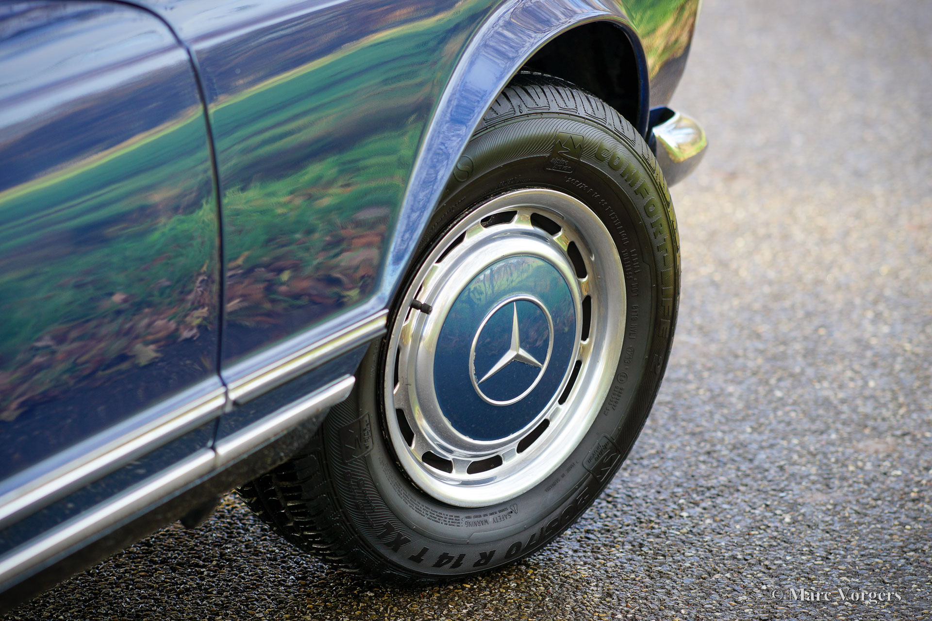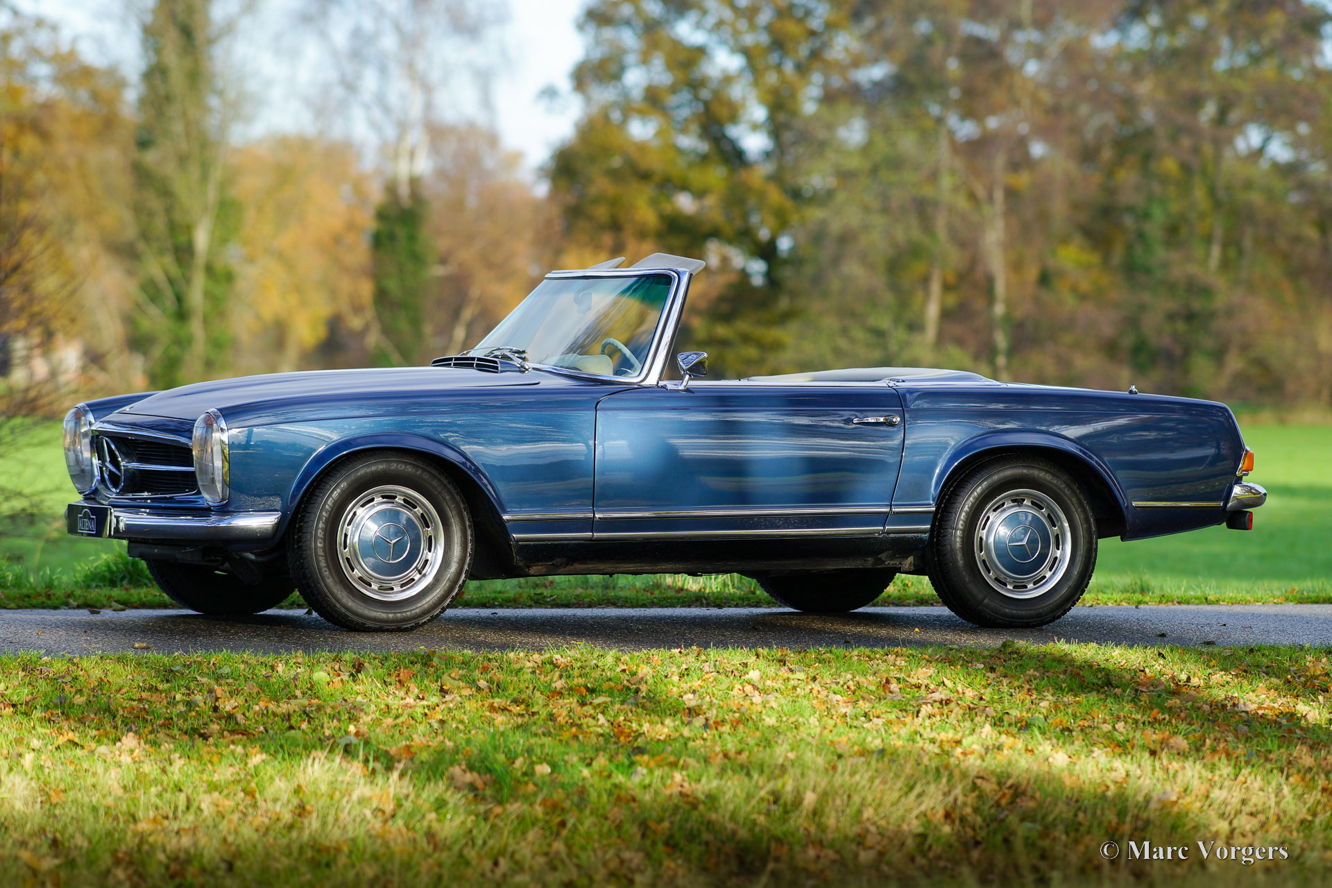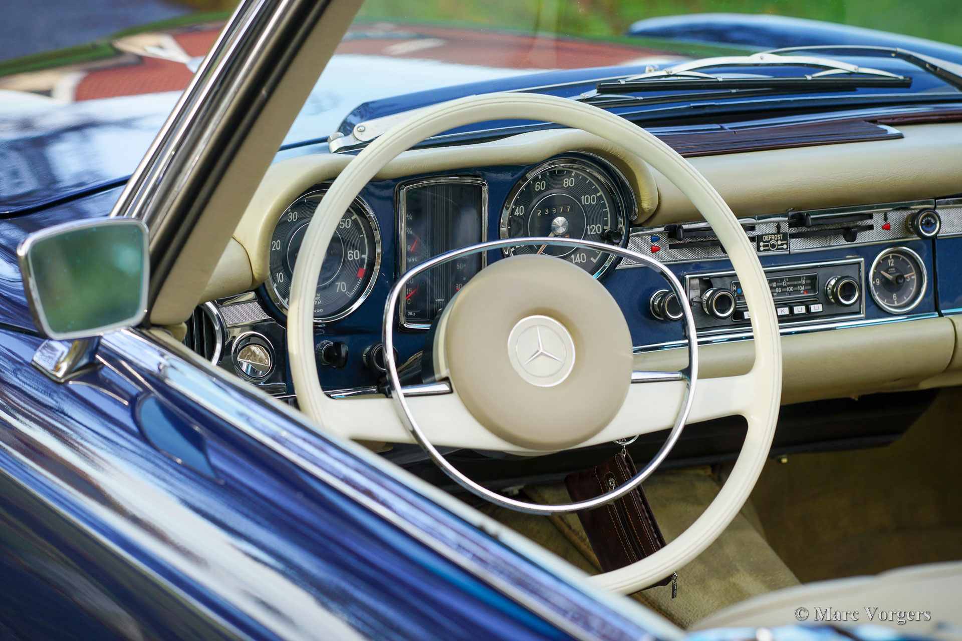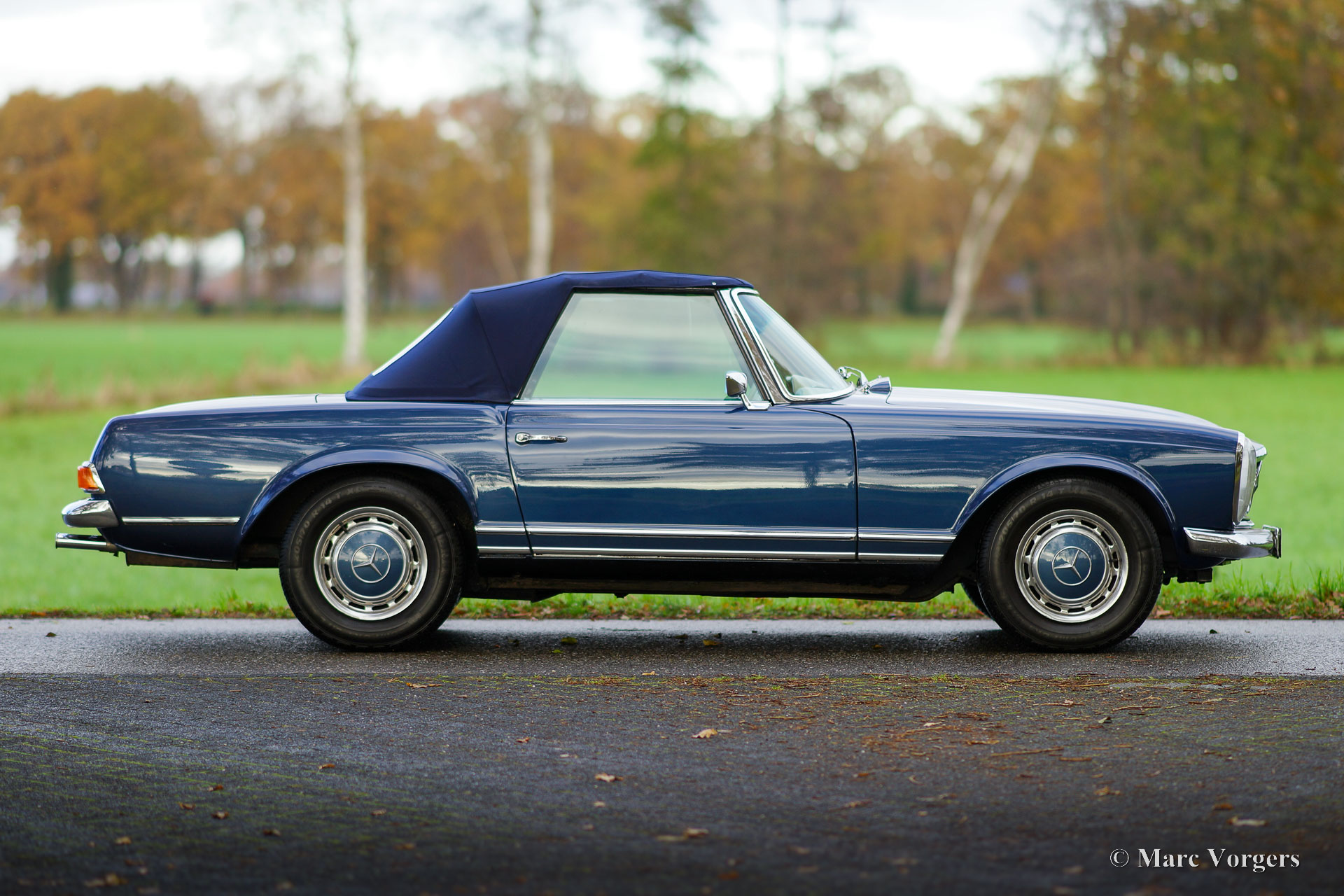 Mercedes-Benz 250 SL „Pagode“, Jahr 1968. Werksoriginale Fahrgestell- und Motornummern, die MB-Datenkarte ist vorhanden, um dies zu bestätigen. Farbe Blaumetallic kombiniert mit einer beigen Lederausstattung mit beigem Teppich. Kapuze aus dunkelblauem Mohair. Dieser wunderbare Mercedes 250 SL wurde in den USA neu verkauft. Das Auto wurde 2006 in die Niederlande importiert, wo es seit 2008 vom letzten Besitzer geschätzt wurde. Das Auto wurde im Laufe der Jahre sehr gut gewartet, dieser Mercedes 250 SL ist in einem sehr guten Zustand und das Auto fährt ausgezeignet. Der Sechszylindermotor läuft ruhig und kraftvoll, das Viergang-Automatikgetriebe schaltet, wie es soll. Die Lackierung und die Chromzierleisten sind wunderschön, die Innenausstattung zeigt leichte bis normale Gebrauchsspuren und das Verdeck wurde kürzlich erneuert. Das Auto verfügt über die Originalräder mit Radkappen und 205/70 14-Zoll-Reifen, ein zeitrichtiges Blaupunkt-Radio mit Nadelstreifendesign front, europäische Scheinwerfer und ein Windschott. Dieser schöne Mercedes-Benz 250 SL (der seltenste der „Pagode“-Modellreihe) ist bereit für unvergessliche Sommerabendfahrten, historische Clubveranstaltungen und Urlaubsreisen!