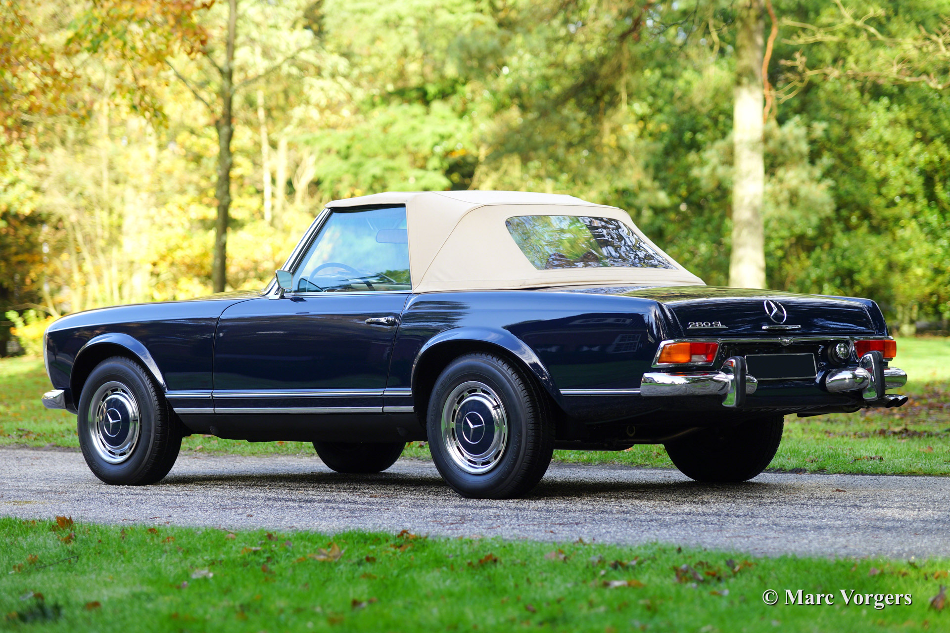 Mercedes-Benz 280 SL 'Pagoda', year 1970. Colour dark blue (MB colour code 904). Beige leather interior (colour code 8000) and a beige soft top. This stunning Mercedes-Benz 280 SL was sold new in Houston, Texas, USA.