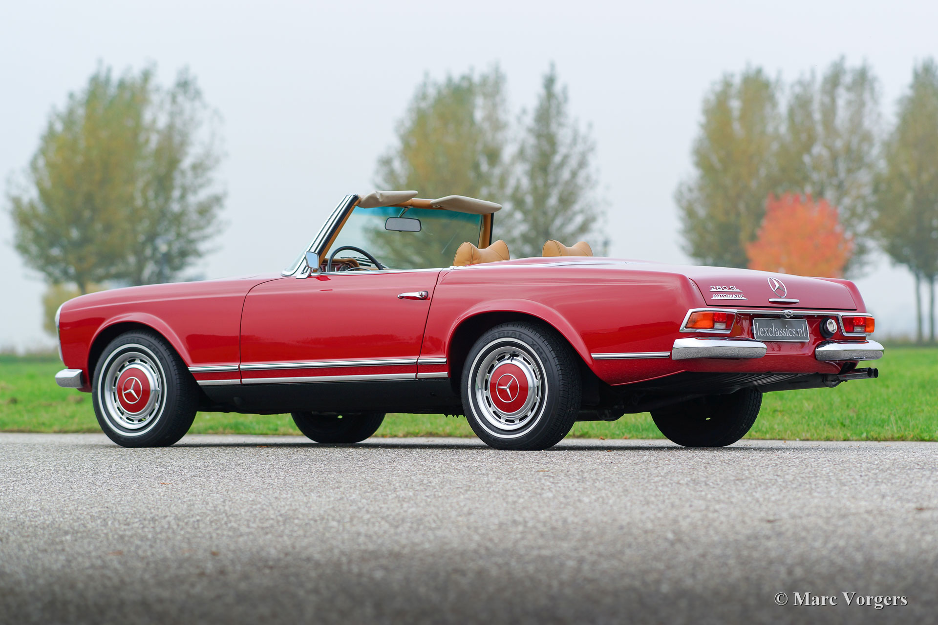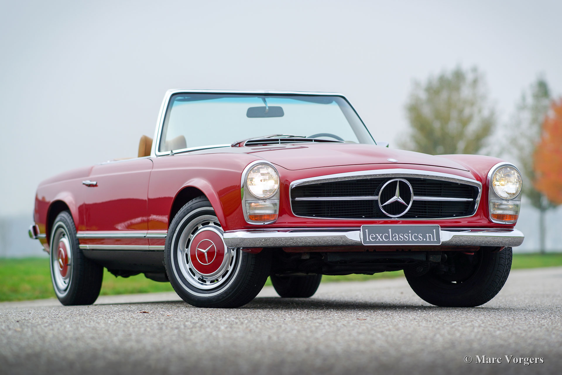Mercedes-Benz 280 SL 'Pagode', Jahr 1968. Farbe Rot mit einem Beigeleder Innenraum und beige Teppichboden. Braunes Mohair-Soft-Top. Dieser schöne Mercedes 280 SL wurde in der Vergangenheit restauriert, das Auto ist in einem sehr guten Zustand und das Auto fährt perfekt! Sie finden nur einige Gebrauchsspuren im Innenraum. Das Auto ist versehen von ein perfekt schaltendes automatisches Viergang-Getriebe, das die 170 PS, die von dem glatten Sechszylinder-Reihenmotor erzeugt werden, schön behandelt. Das Auto ist weiterhin ausgestattet mit einem schönen Becker Mexico Radio.
