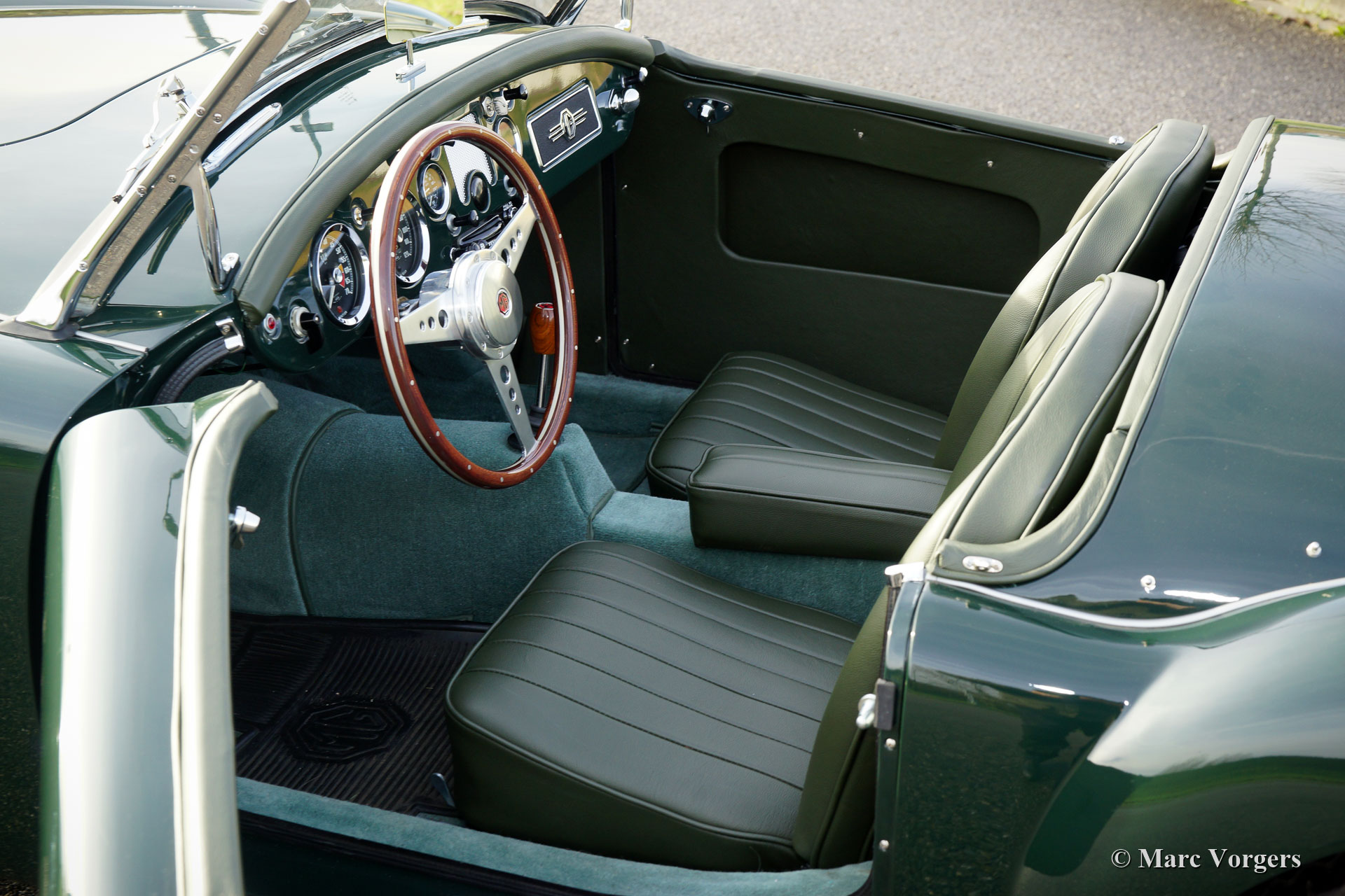 MG MGA 1500 Roadster, Jahr 1956. Farbe British Racing Green kombiniert mit einer grünen Lederausstattung und grünem Teppich. Schwarzes Verdeck und Seitenfensterrahmen. Dieser wunderschöne MGA 1500 Roadster wurde umfangreich bis zur Perfektion restauriert. Dieser MGA ist in einem hervorragenden TOP Zustand! Seit dem Abschluss der Restaurierung ist das Auto nur 1000 Kilometer gefahren. Das Auto ist ausgestattet mit einem Sportlenkrad mit Holzkranz, Chromdrahträdern und einer Auspuffanlage aus Edelstahl. Der MGA Roadster ist einer der schönsten offenen Sportwagen der 1950er Jahre und das offene Fahrerlebnis ist fantastisch! Dieser MGA 1500 Roadster ist sehr wünschenswert; hervorragend restauriert in einem wunderschönen Farbschema!