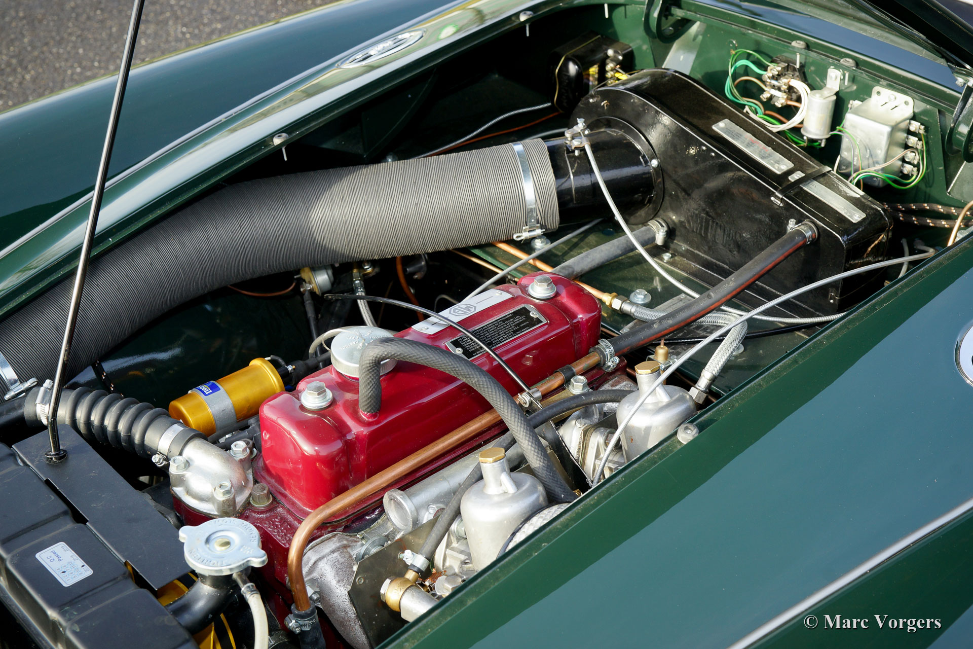 The year 1955 saw the introduction of the MGA. With this design the MG broke new grounds. After its predecessors MG TD and MG TF, which were largely based on the pre-war MG TB, it was a roadster with a very modern sporty design. Like its predecessors, the MGA was a great success and, like before, the greater part was sold in America. Until 1959, the MGA was equipped with a 1459 cc four-cylinder engine. From that year, the car was fitted with a 1588 cc four-cylinder. A 1622 cc four-cylinder engine replaced the 1588 cc. engine in 1961. The early MGA versions had very good drum brakes until 1959, but after that year, the MG A was equipped with disc brakes on the front wheels. The year 1962 saw the production of the MGA, the A 1600 Mk II. The MGB replaced this very popular British sports car, and was to develop the success of the MG A even further.