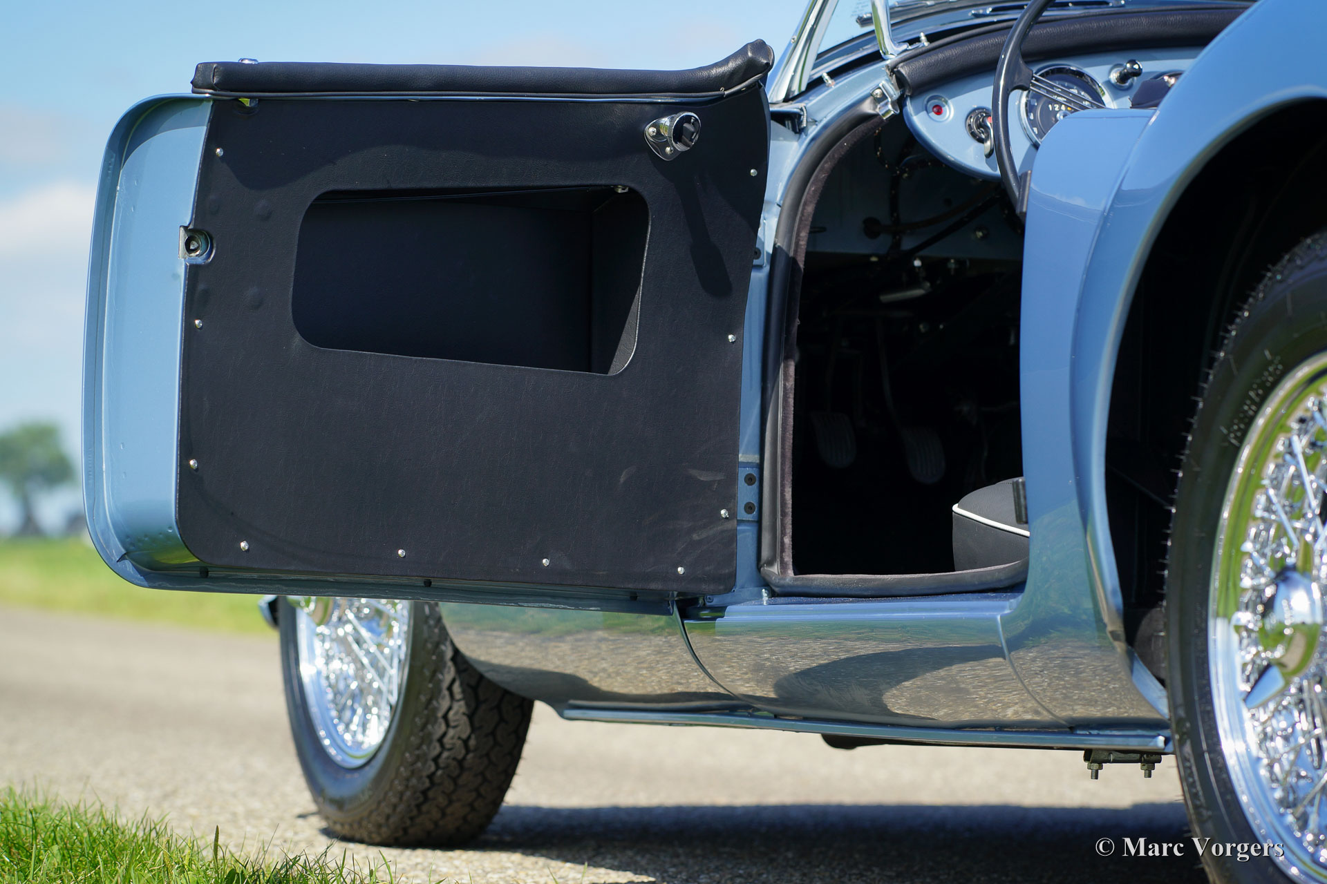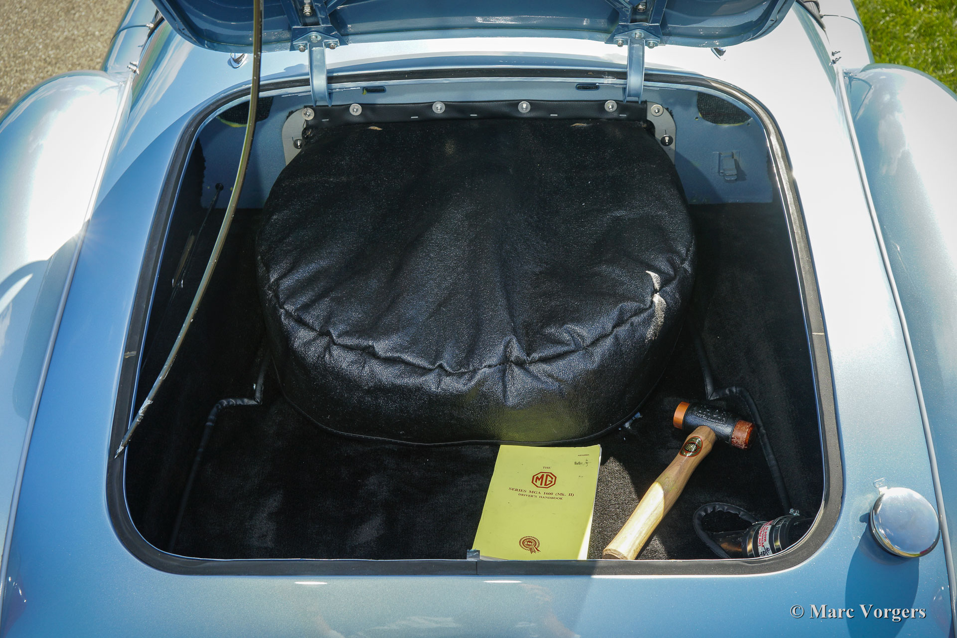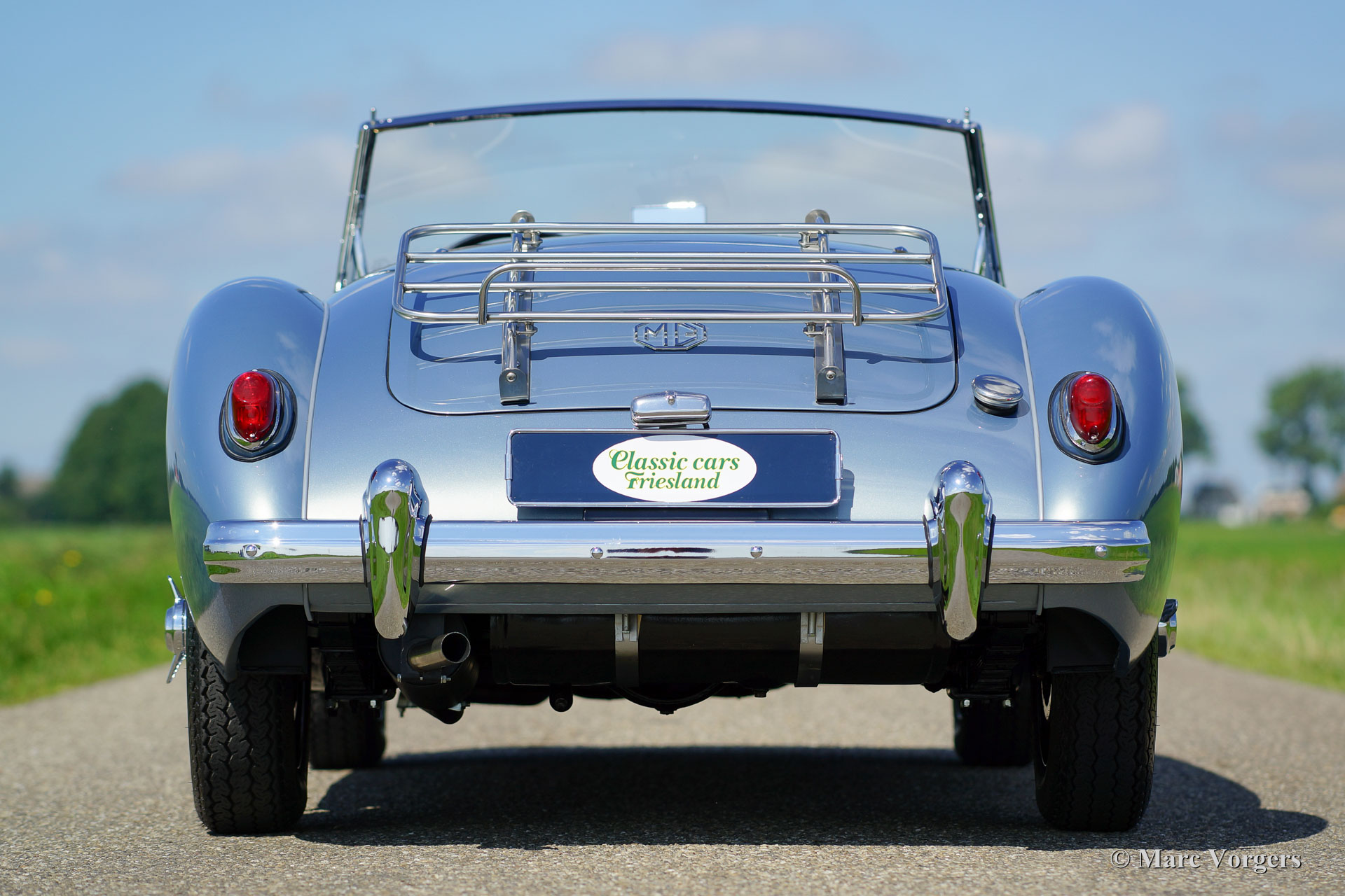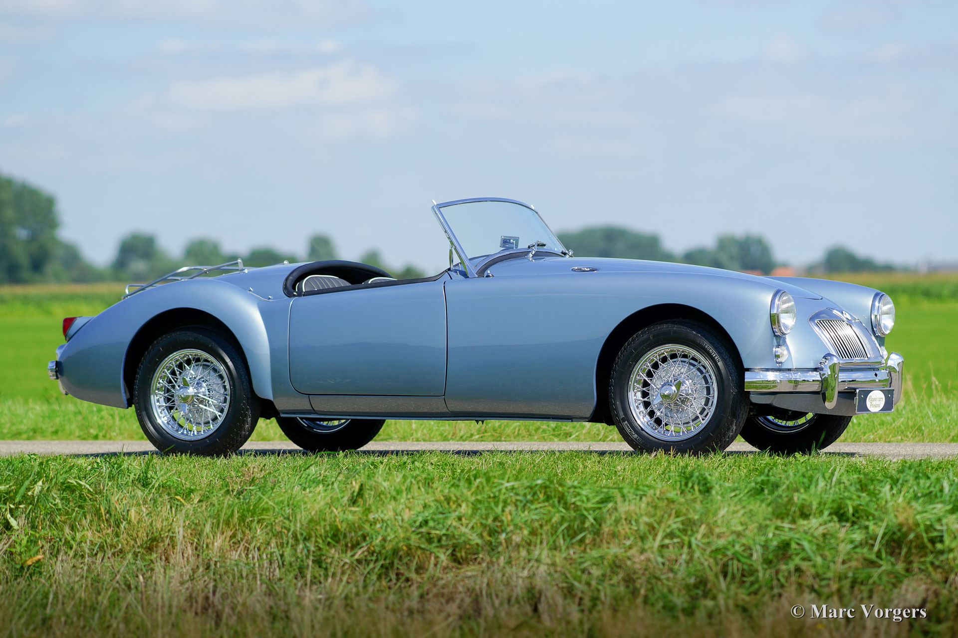 MG MGA 1500 Roadster, Jahr 1957. Farbe ‘Ice Blue‘ metallic mit einem schwarzen Leder-Interieur getrimmt weißer Paspelierung. Das Auto ist versehen von einem schwarzen Mohair Soft-Top, schwarzer Persenning und Aluminium-Seitenfenster. Dieser wunderschöne MGA 1500 Roadster wurde umfangreich und perfekt restauriert in den Niederlanden. Die Karosserie zeigt gestochen scharfe Linien, perfekte Panel Passform und eine Top-Lackierung. Unter anderem wurden der Motor und das Getriebe überholt, die Bremsen wurden erneuert, das Chrom wurde erneuert und ein neuer Kabelbaum wurde montiert. Eine Fotoreportage der Restauration ist vorhanden. Dieser MGA Roadster ist in einem hervorragenden Top-Zustand: NEU! Das Auto ist ausgestattet mit Chrom Speichenräder, Vredestein Reifen und eine Auspuffanlage aus Edelstahl. Ein Top-Exemplar in einer sehr schönen Farbe!