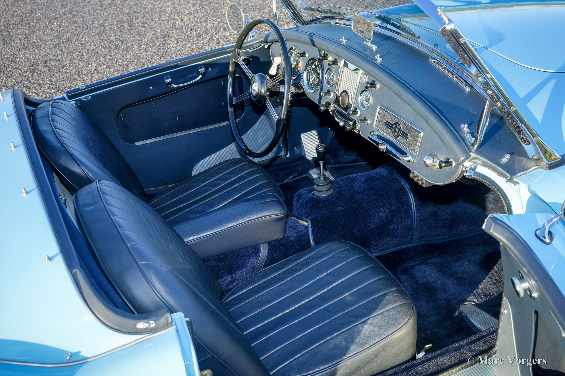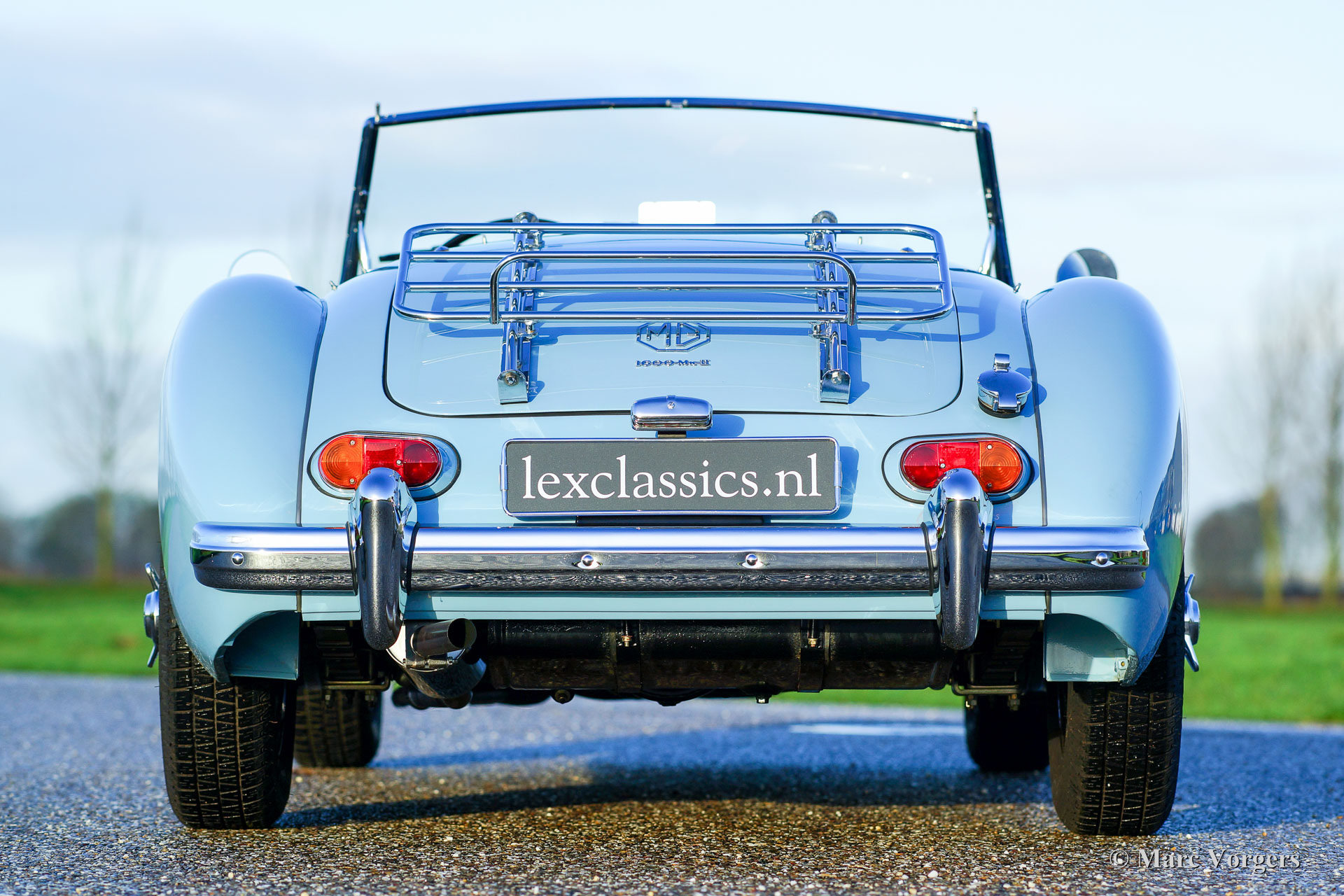 MG MGA 1600 Mk II roadster, Jahr 1961. Farbe ‘Powder Blue‘ mit einem dunkelblauen Lederausstattung. Dieses schöne MGA 1600 Roadster wurde vor einigen Jahren umfangreich und ‘body off‘ wieder hergestellt. Die Karosserie zeigt ausgezeichnete Panel Passform und der Lack ist makellos. Diese MGA ist in einem hervorragenden Top-Zustand! Eine Fotoreportage der Restauration ist vorhanden. Dieser MGA 1600 des letzten Mk II-Serie ist ausgestattet mit Chrom Speichenräder, Lucas Nebelscheinwerfer vorn, elektrische Lüfter, Bremskraftverstärker, Vinyl-Persenning und eine Chrom-Gepäckträger.