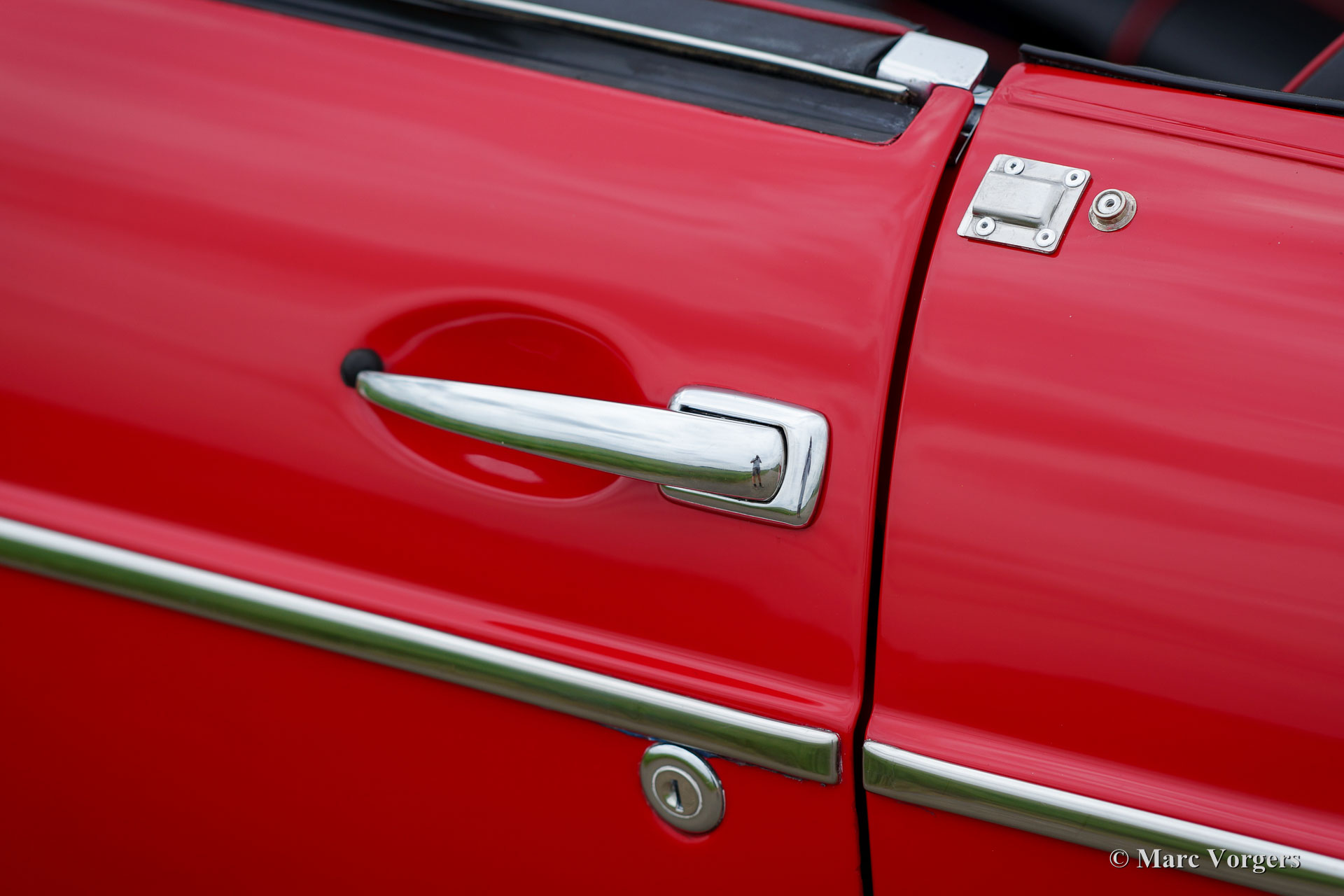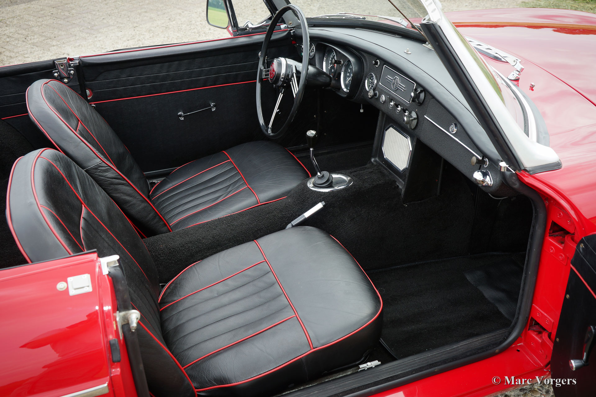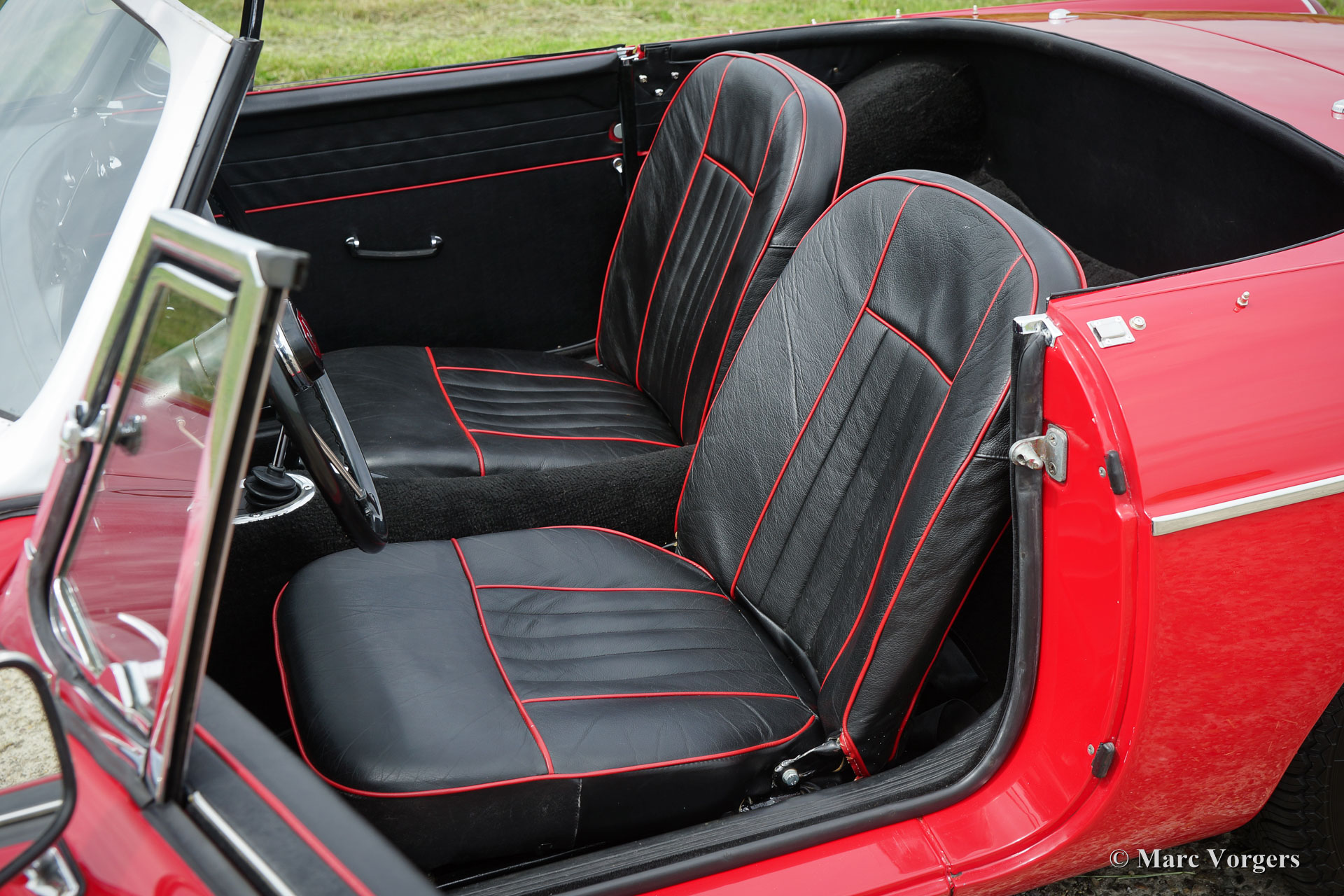 MG MGB Roadster, Jahr 1964. Dies ist ein frühes Mk I Modell mit den speziellen ‘Zieh-Griffen‘ an den Türen. Körperfarbe rot mit einem schwarzen Leder Interieur getrimmt mit roten Paspeln. Schwarzer Teppich, schwarzes Verdeck und Verdeck-Abdeckung. Dieser wundervolle MGB Roadster wurde vor einigen Jahren ausgiebig ‘Nuss & Bolzen‘ restauriert, eine umfangreiche Foto-Reportage der Wiederherstellung ist vorhanden. Dieser feine MGB Roadster ist in einem super TOP-Zustand: Concours! Das Automobil zeigt alle Originaldetails wie die Stahlräder mit Chromnabenkappen, das wunderschöne Original-lenkrad, den originalen Schaltknauf, die originalen Luftfilter und die Originalwerkzeuge. Falls Sie wünschen, kann das Auto nach Drahträder Ausstattung umgewandelt werden. Dieser MGB Roadster zeigt sehr schöne Blech-Passungen. Das Auto ist ausgestattet mit einem Viergang-Getriebe mit Overdrive! Dies ist ein hervorragend fahrendes, super originales und frühes ‘Zieh-Griffen‘ MGB in TOP-Zustand!