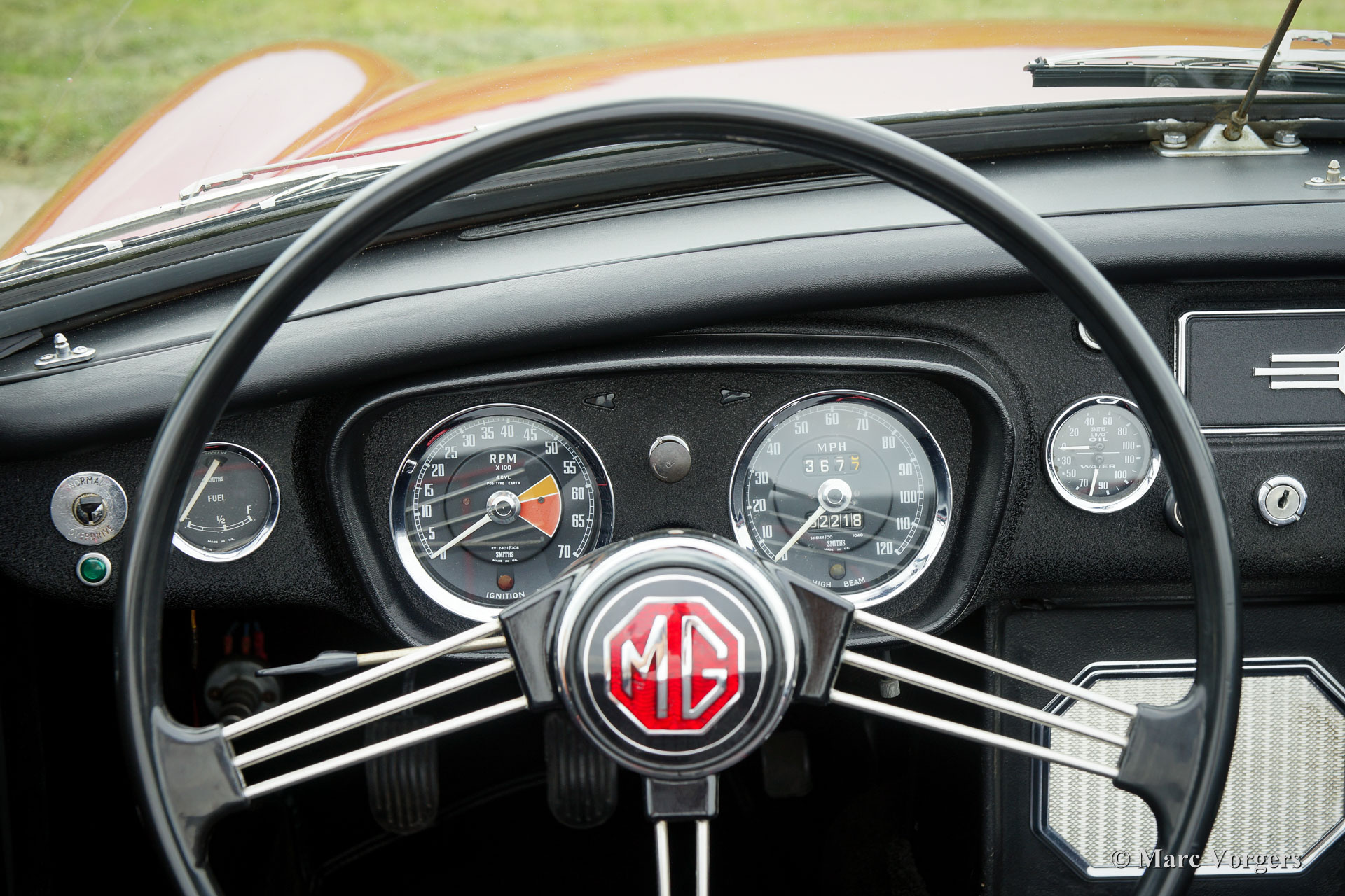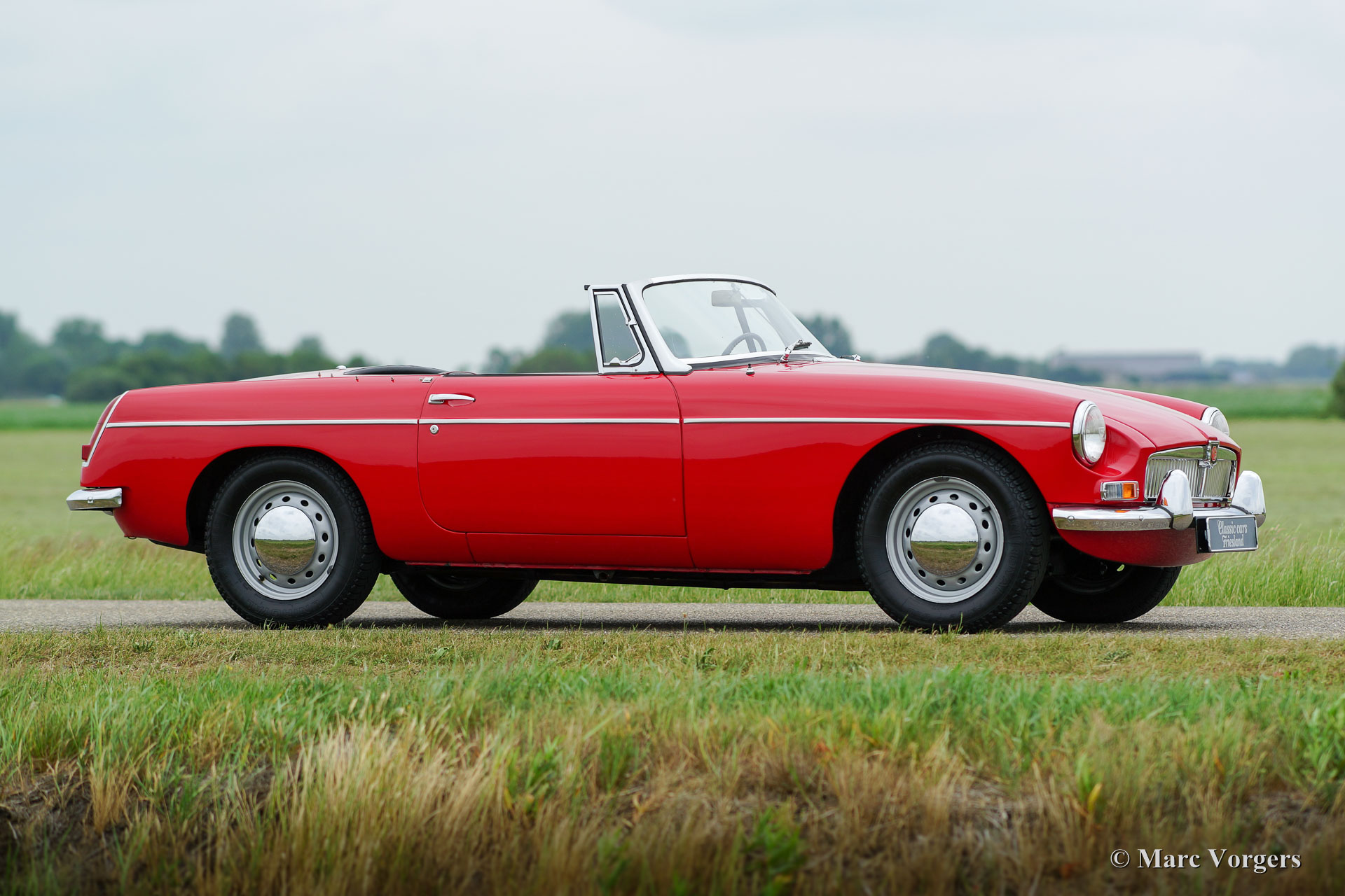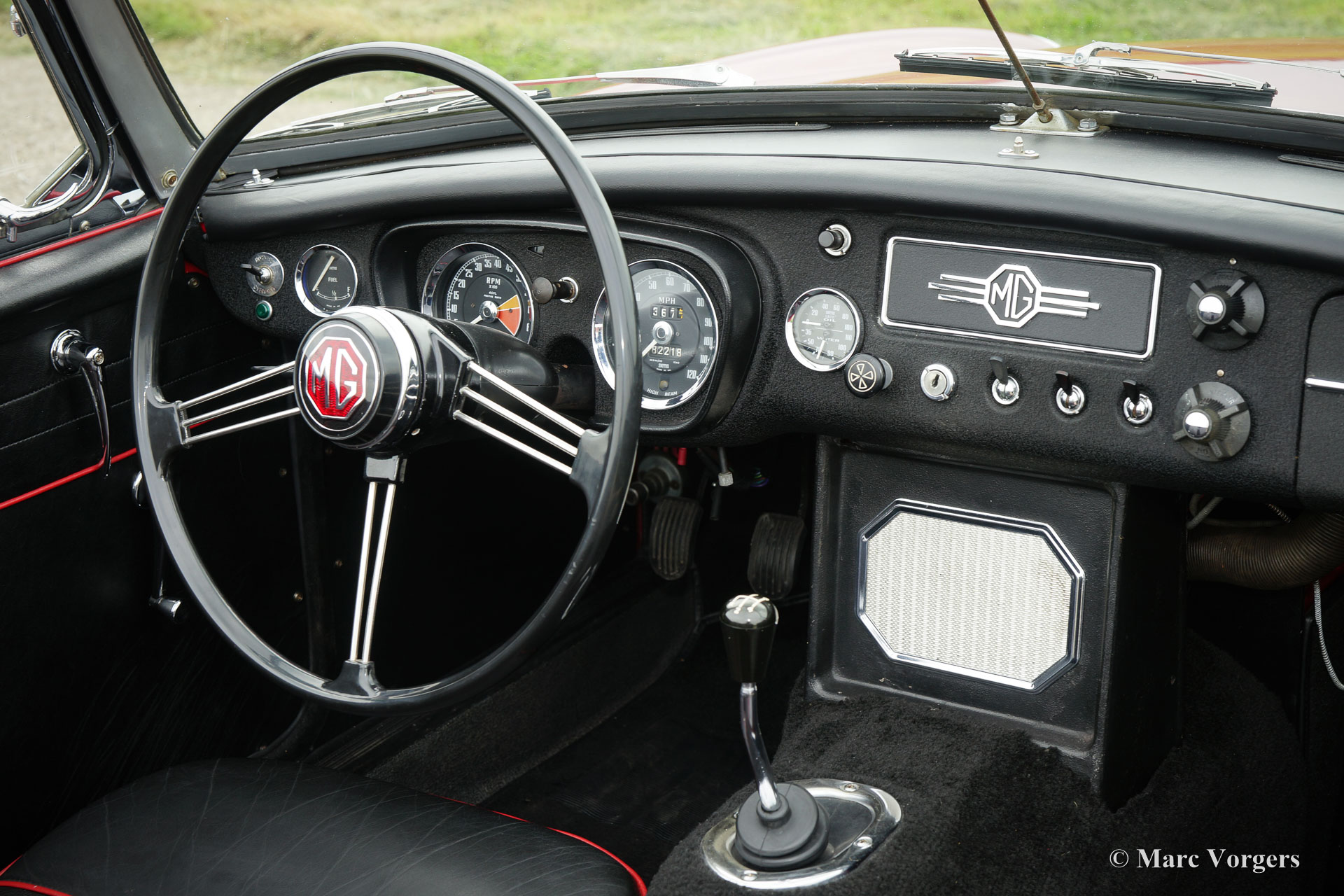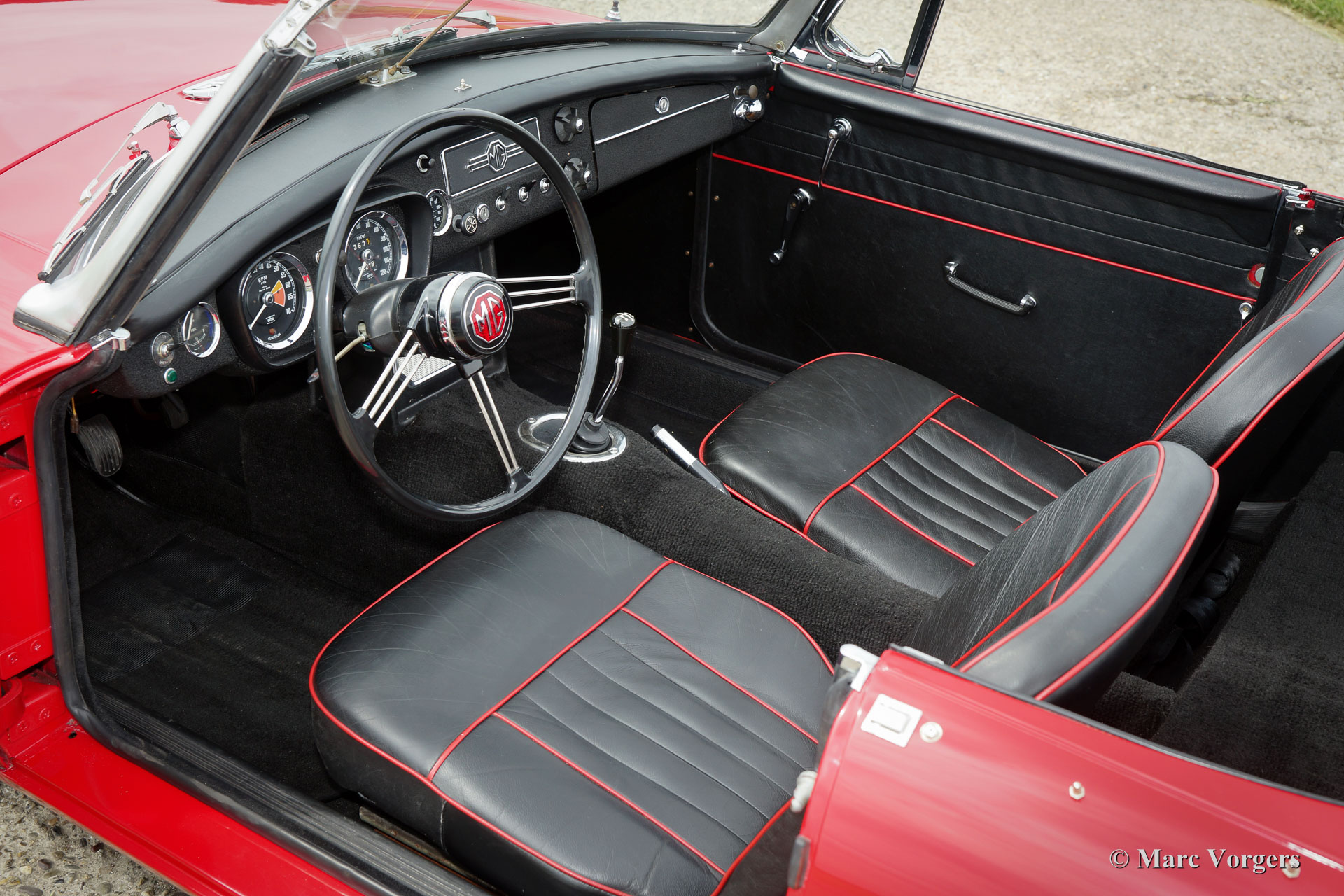MG MGB Roadster, Jahr 1964. Dies ist ein frühes Mk I Modell mit den speziellen ‘Zieh-Griffen‘ an den Türen. Körperfarbe rot mit einem schwarzen Leder Interieur getrimmt mit roten Paspeln. Schwarzer Teppich, schwarzes Verdeck und Verdeck-Abdeckung. Dieser wundervolle MGB Roadster wurde vor einigen Jahren ausgiebig ‘Nuss & Bolzen‘ restauriert, eine umfangreiche Foto-Reportage der Wiederherstellung ist vorhanden. Dieser feine MGB Roadster ist in einem super TOP-Zustand: Concours! Das Automobil zeigt alle Originaldetails wie die Stahlräder mit Chromnabenkappen, das wunderschöne Original-lenkrad, den originalen Schaltknauf, die originalen Luftfilter und die Originalwerkzeuge. Falls Sie wünschen, kann das Auto nach Drahträder Ausstattung umgewandelt werden. Dieser MGB Roadster zeigt sehr schöne Blech-Passungen. Das Auto ist ausgestattet mit einem Viergang-Getriebe mit Overdrive! Dies ist ein hervorragend fahrendes, super originales und frühes ‘Zieh-Griffen‘ MGB in TOP-Zustand!