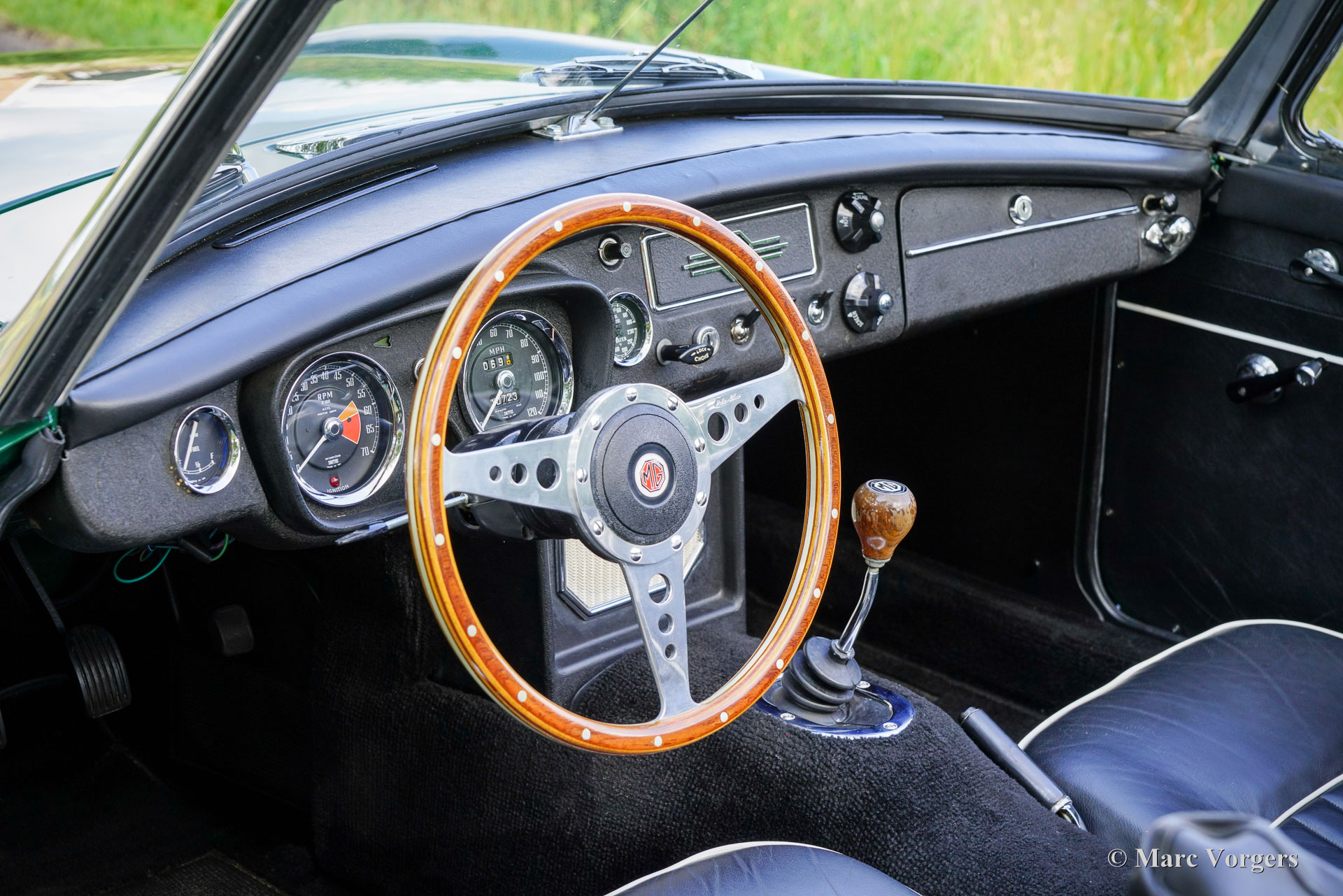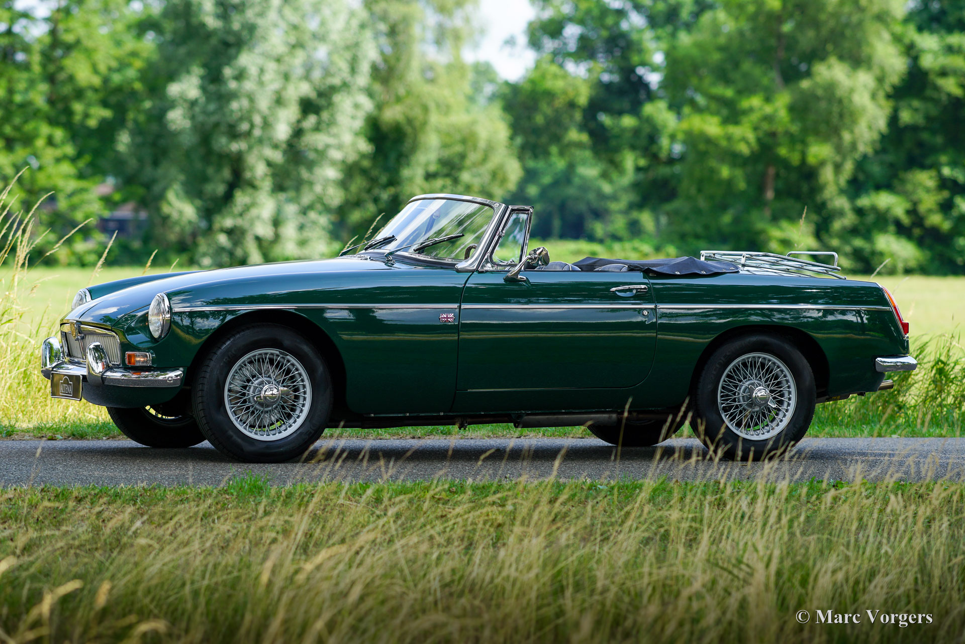 MG MGB Roadster, Jahr 1965. Farbe British Racing Green kombiniert mit einer schwarzen Lederausstattung getrimmt mit weißen Paspeln und schwarzem Teppich. Schwarzes Verdeck und Verdeck-Abdeckung. Dieser wunderschöne MGB-Roadster wurde in den USA neu verkauft und 1996 in die Niederlande verschifft. Anschließend wurde das Auto von Brooklands Classic Cars im niederländischen Veenendaal, das für seine erstklassigen Jaguar XK-Restaurierungen bekannt war, auf höchstem Niveau restauriert. Ein Schild unter der Motorhaube bestätigt das. Die Qualität der Restaurierung ist auf den ersten Blick klar… Die Passform der Blechpaneele, der Lack, das Chrom, die Verarbeitung bis ins kleinste Detail… Perfektion! Nicht nur die Optik ist super, man spürt auch, dass das Auto mit größter Sorgfalt gebaut wurde. Dieser MGB-Roadster ist in einem super Zustand und fährt perfekt! Seit der Restaurierung hat das Auto nur 10.000 Kilometer zurückgelegt und das Auto hatte in den letzten 27 Jahren nur zwei sorgfältige Besitzer. Dieser prächtige MGB-Roadster ist ausgestattet mit: Ölkühler, S.U. Vergaser, K & N-Sportluftfilter, silber lackierte Speichenräder mit Vredestein 175/70 14-Zoll-Reifen, ein Gepäckträger aus Edelstahl, eine Edelstahl-Auspuffanlage und ein wunderschönes MotoLita-Sportlenkrad mit Holzkranz. Dieser edle MGB Roadster ist ein frühes Modell mit dem begehrten Metallarmaturenbrett. Der MGB Roadster ist der praktischste klassische britische Roadster, ein wunderbarer Begleiter für Sommerabendfahrten und (Urlaubs-) Roadtrips! Dies ist ein Spitzenbeispiel!