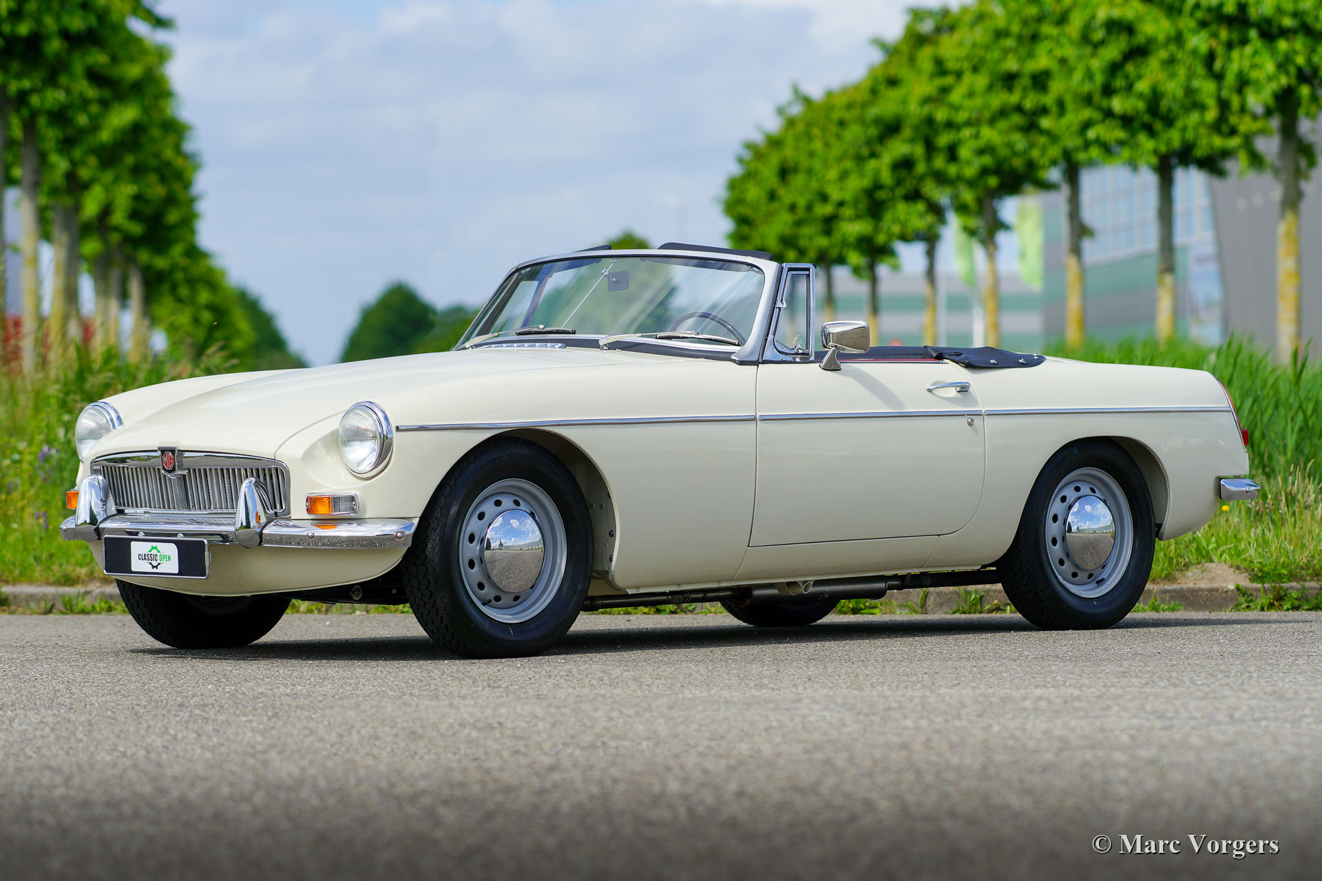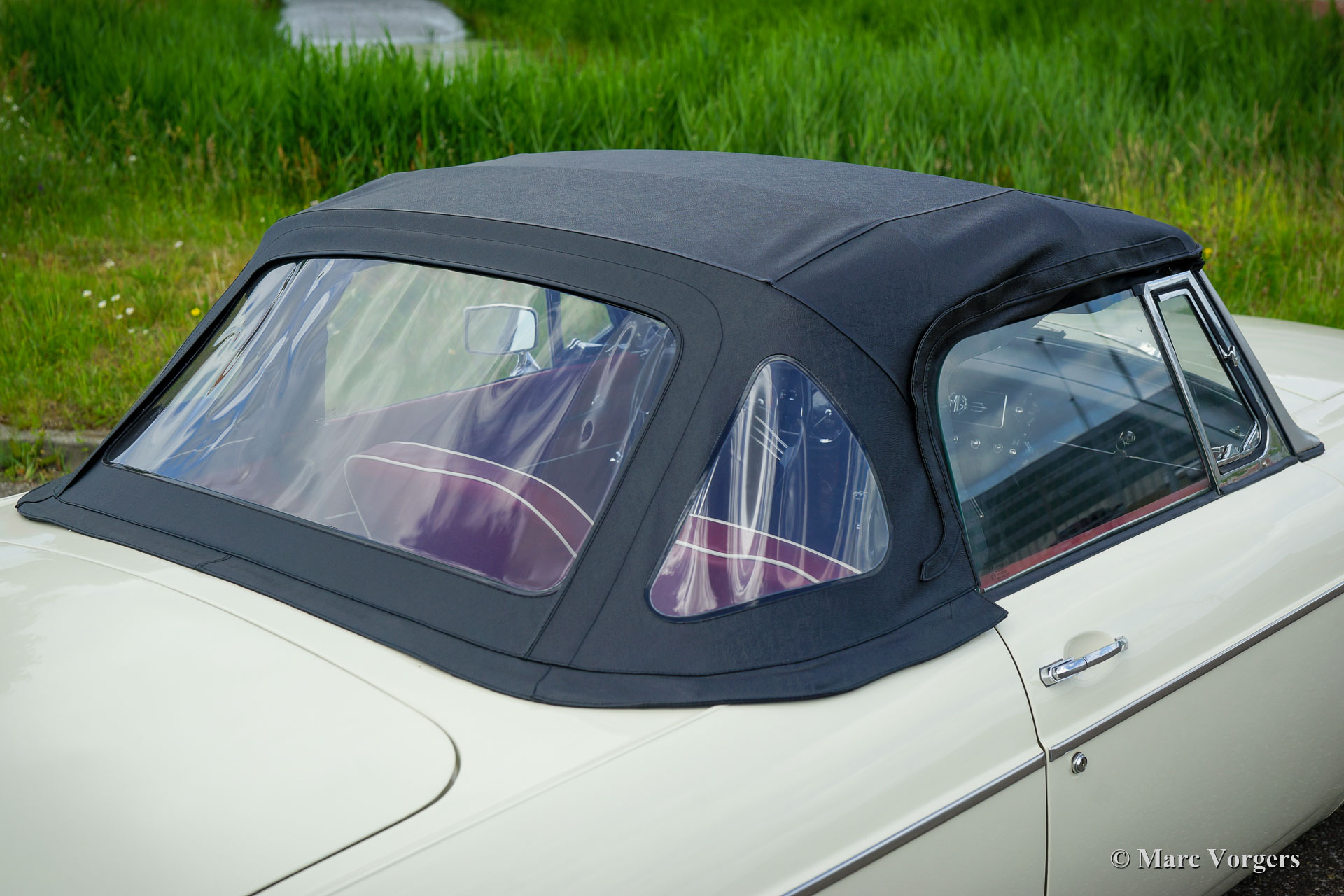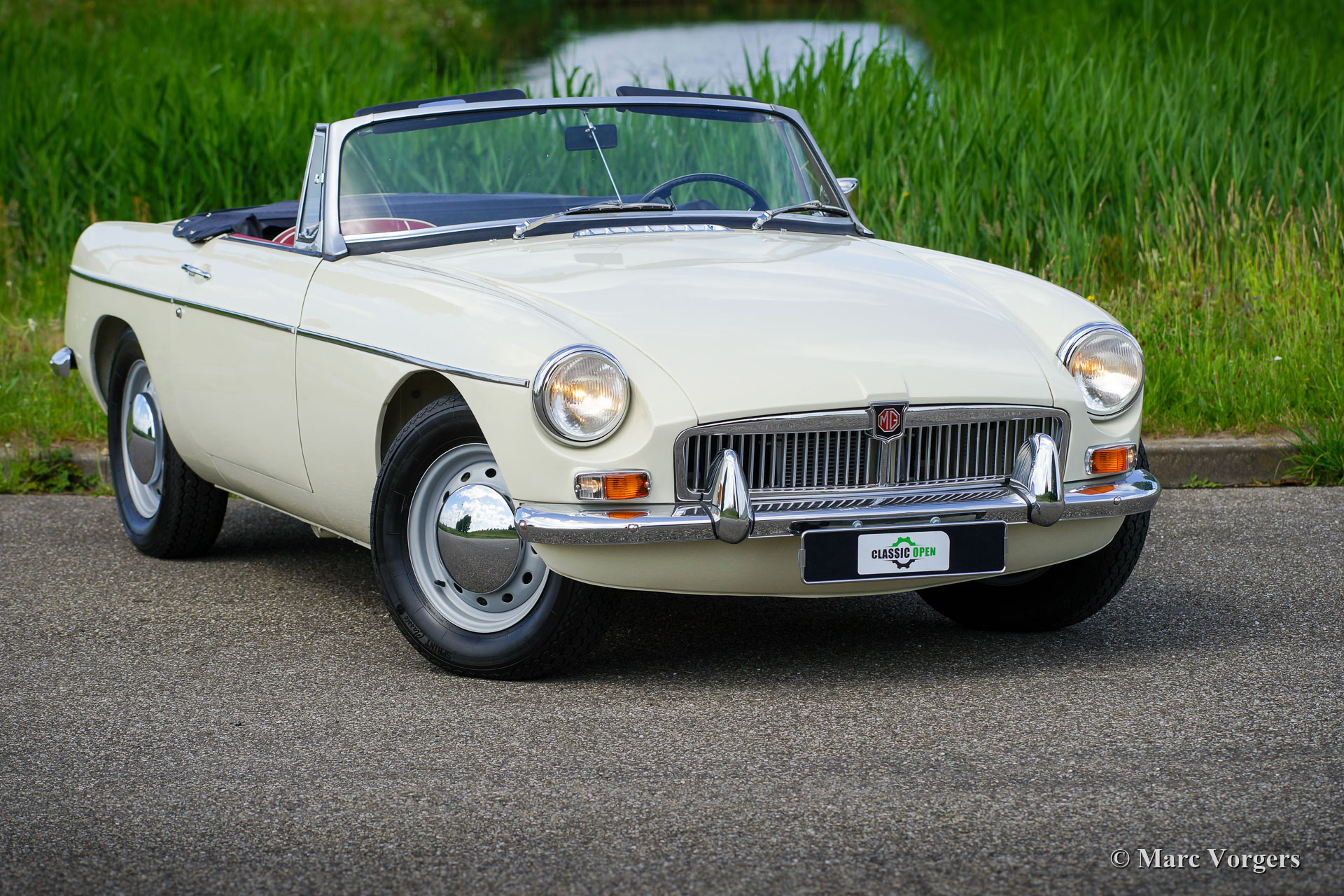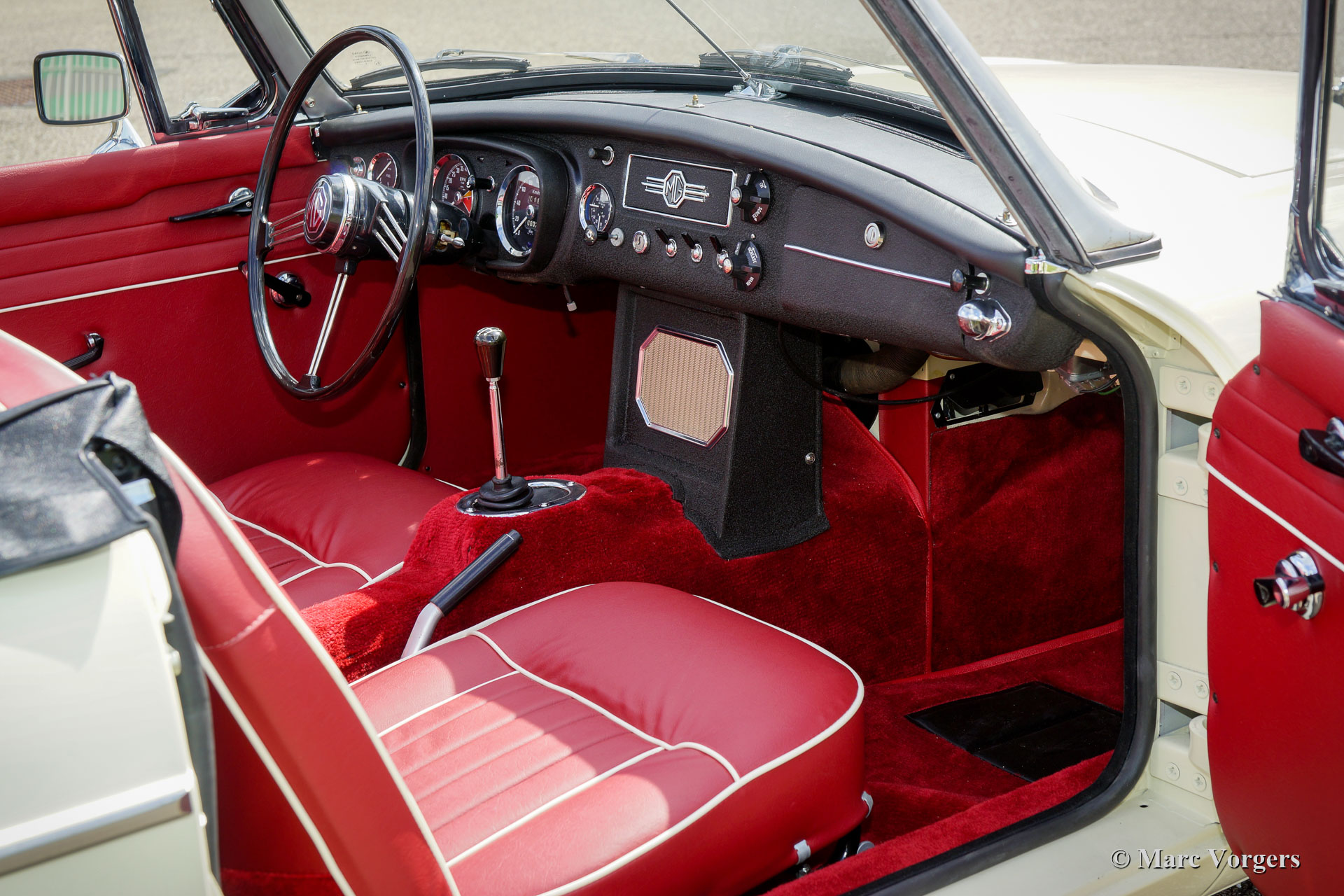 MG MGB roadster, Jahr 1966. Farbe ‘Old English White‘ kombiniert mit einer roten Lederausstattung getrimmt mit weißen Paspeln und schwarzem Teppich. Schwarzes Verdeck und Verdeckbezug. Dieser prächtige MG MGB wurde umfassend bis zur Perfektion restauriert! Das Auto ist in einem Concours-Zustand und es fährt herrlich. Seit Abschluss der Restaurierung hat das Auto nur 500 Kilometer gefahren. Dieser feine MGB zeigt alle originalen Details wie das wunderschöne Metallarmaturenbrett mit schwarzer Kräusellackierung, das originale Lenkrad und die Stahlscheibenräder mit verchromten Nabenkappen. Das Auto ist mit Overdrive und Scheibenbremsen an den Vorderrädern ausgestattet. Ein Top-Beispiel für den anspruchsvollen Enthusiasten.