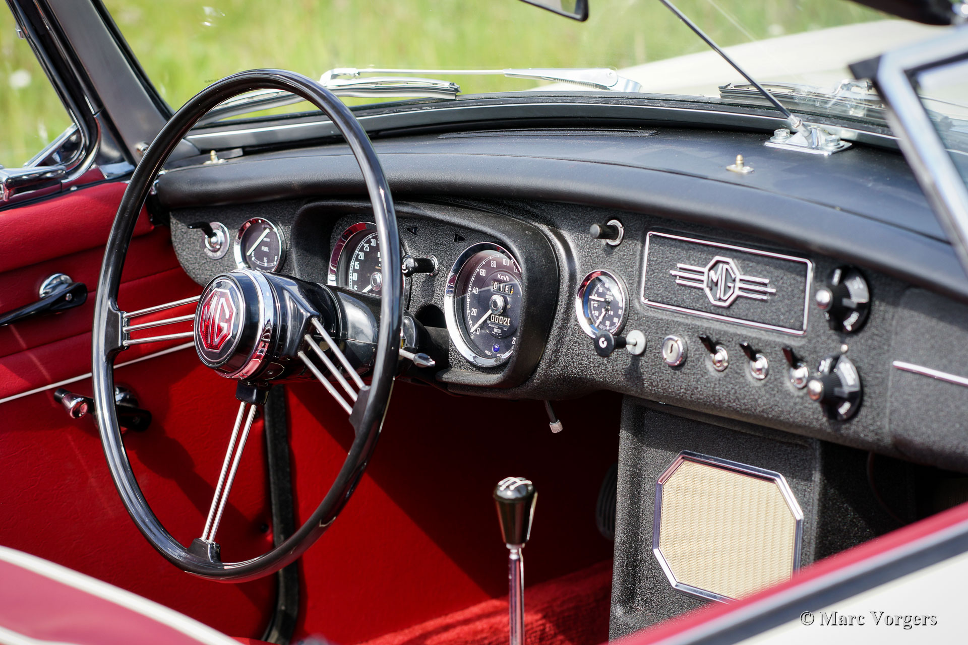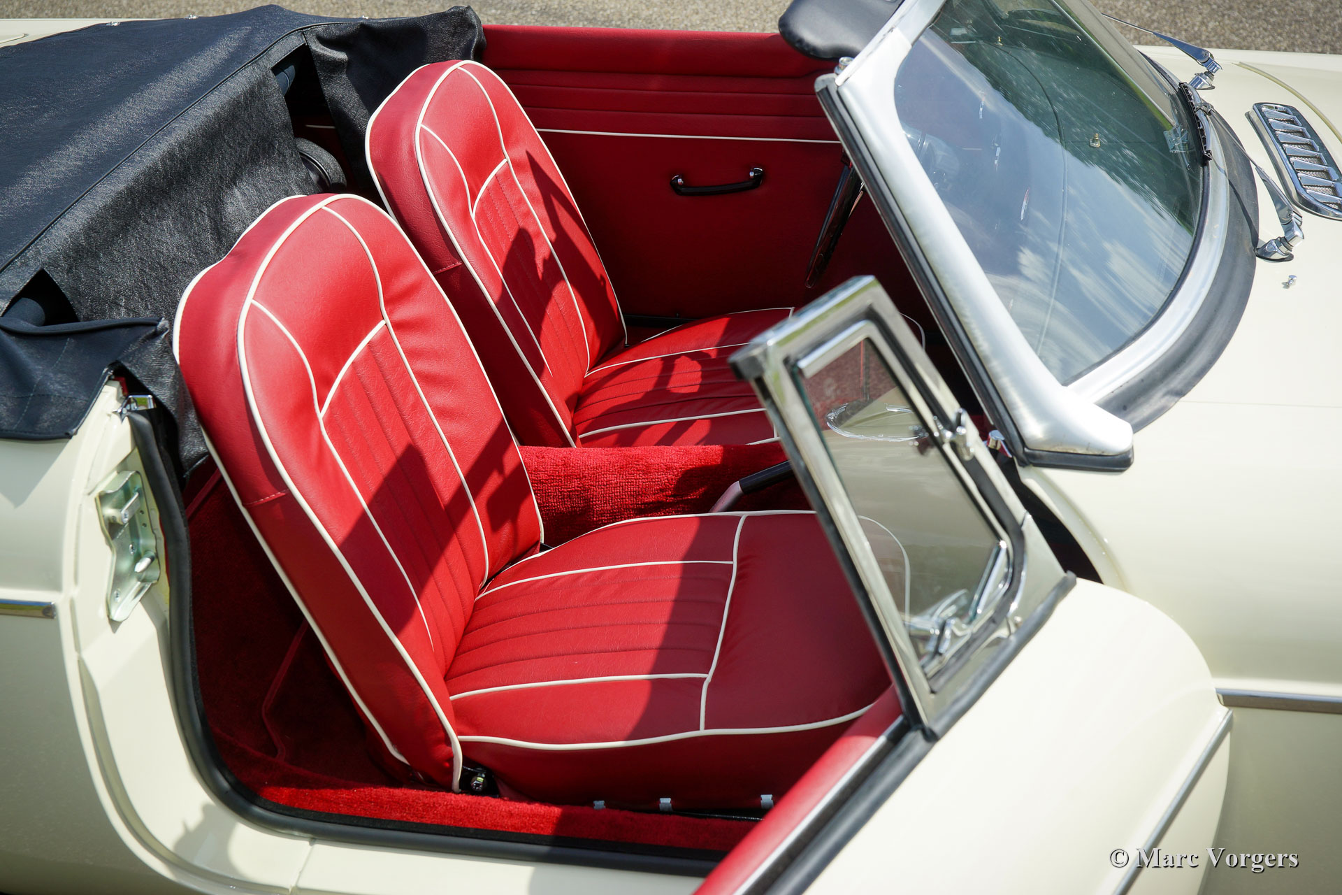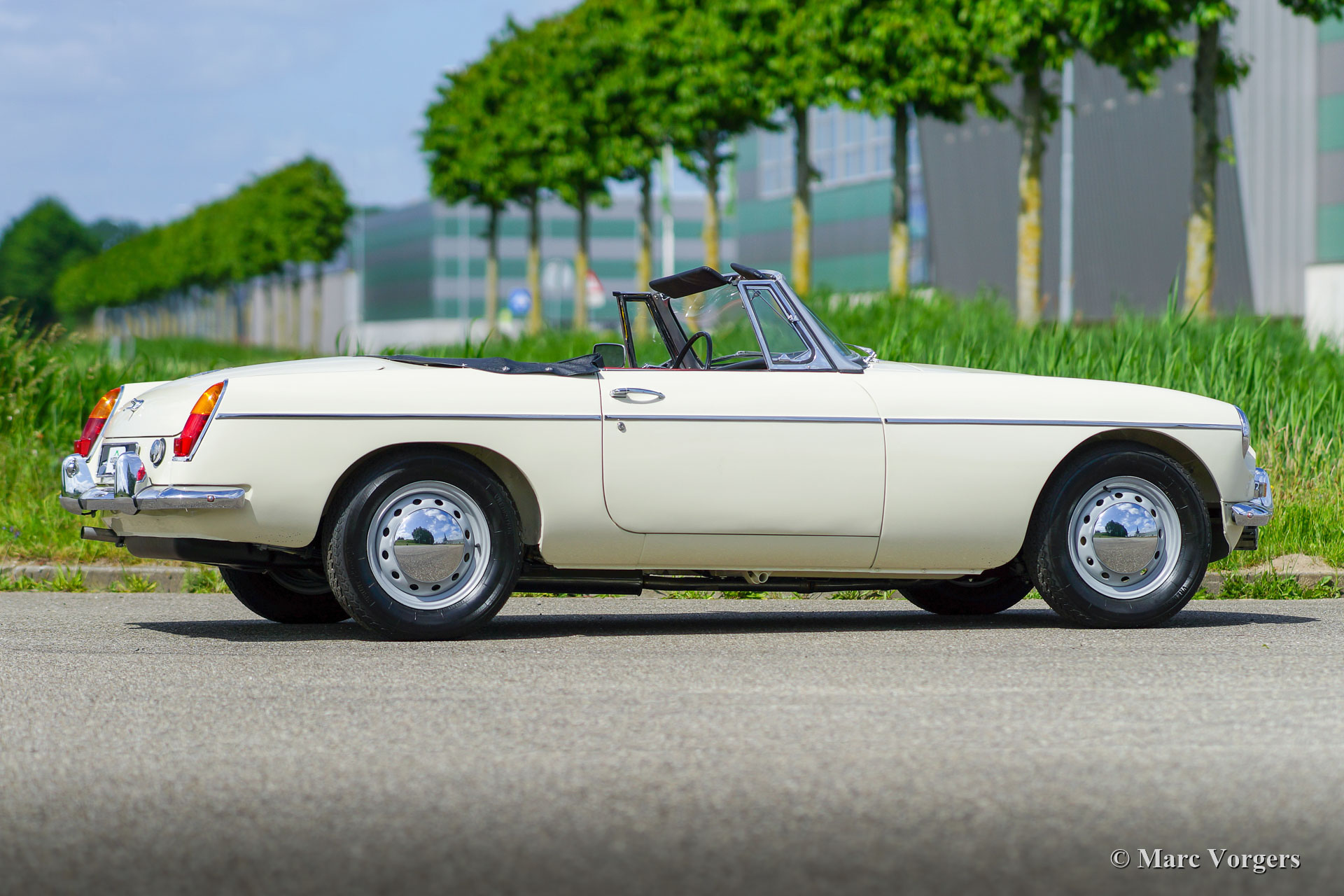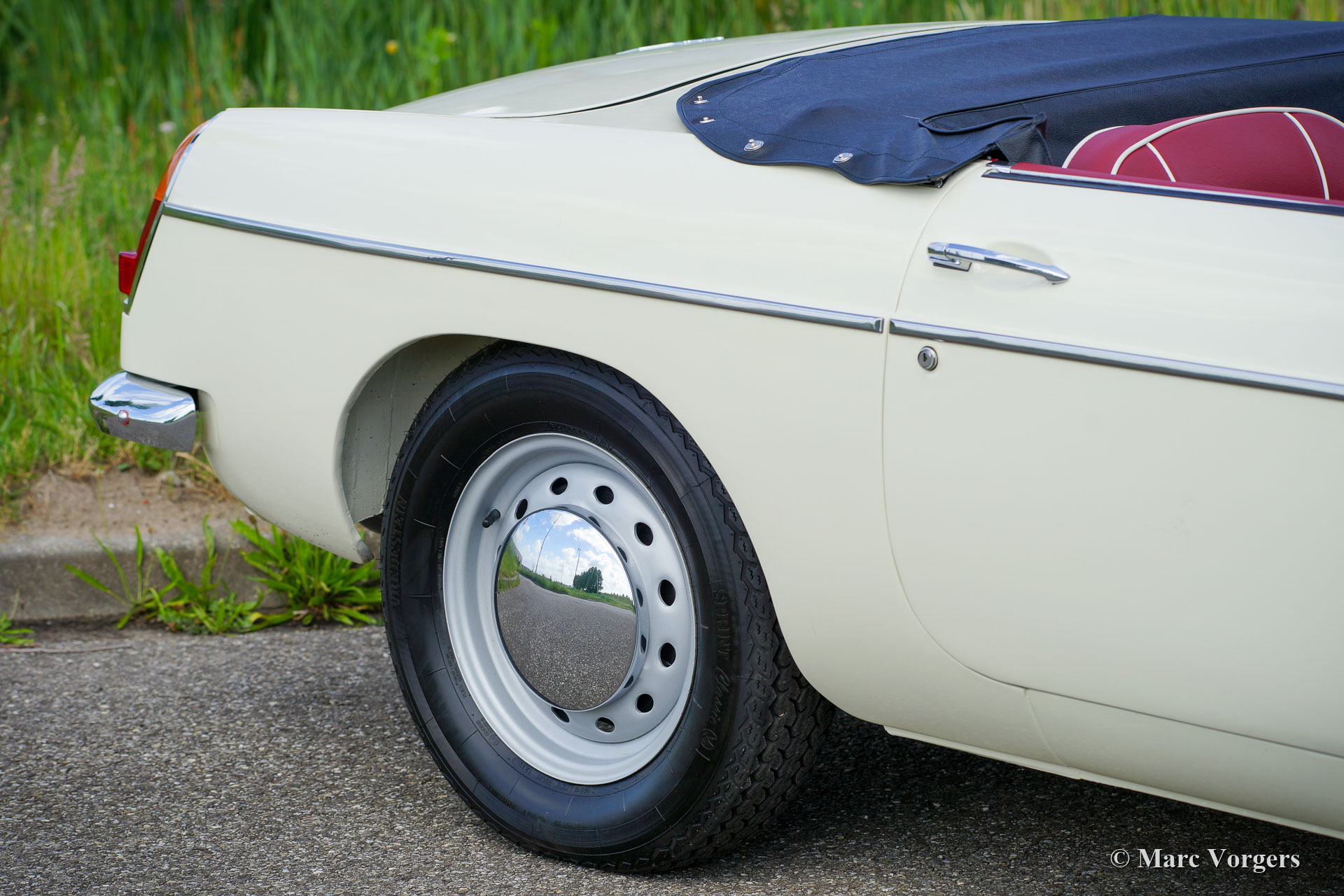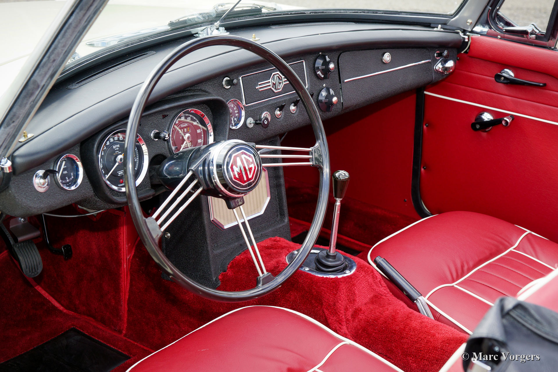 MG MGB roadster, Jahr 1966. Farbe ‘Old English White‘ kombiniert mit einer roten Lederausstattung getrimmt mit weißen Paspeln und schwarzem Teppich. Schwarzes Verdeck und Verdeckbezug. Dieser prächtige MG MGB wurde umfassend bis zur Perfektion restauriert! Das Auto ist in einem Concours-Zustand und es fährt herrlich. Seit Abschluss der Restaurierung hat das Auto nur 500 Kilometer gefahren. Dieser feine MGB zeigt alle originalen Details wie das wunderschöne Metallarmaturenbrett mit schwarzer Kräusellackierung, das originale Lenkrad und die Stahlscheibenräder mit verchromten Nabenkappen. Das Auto ist mit Overdrive und Scheibenbremsen an den Vorderrädern ausgestattet. Ein Top-Beispiel für den anspruchsvollen Enthusiasten.