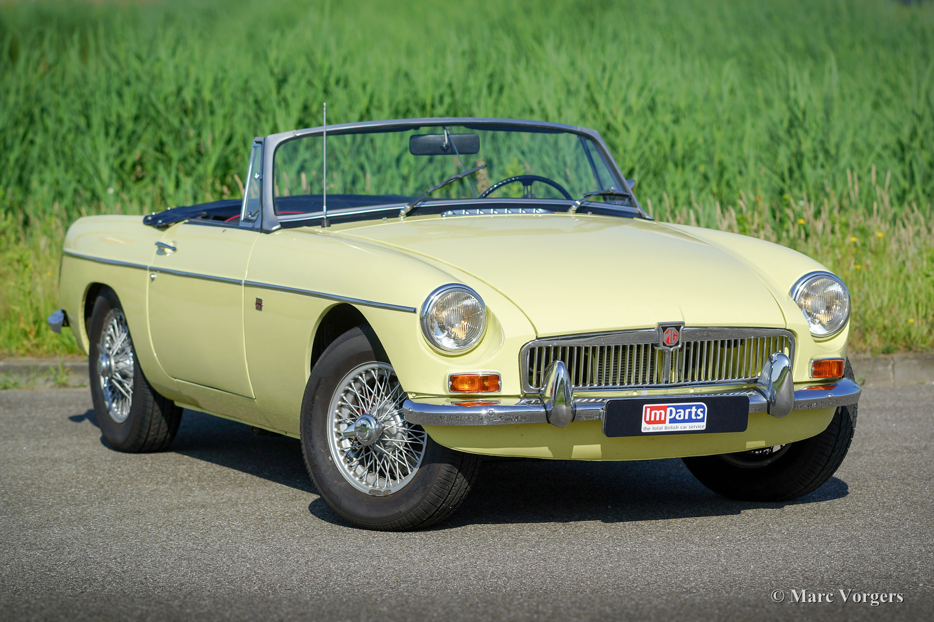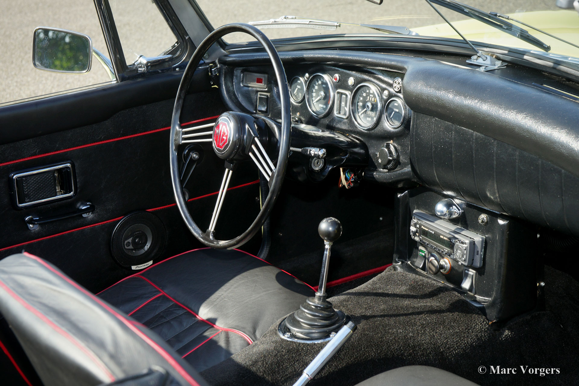 MG MGB Roadster, Jahr 1968. Farbe hellgelb (Primrose) kombiniert mit einer schwarzen Lederausstattung getrimmt mit roten Paspeln. Schwarzes Vinyl-Verdeck und Kapuze. Dieser wunderbare MGB Roadster wurde vor einigen Jahren aufwendig restauriert. Das Auto ist in einem ausgezeichneten Zustand und das Auto fährt perfekt. Dieses 1968 MGB-Modell verfügt noch über zwei Scheibenwischer (statt drei) und es ist noch frei von den späteren Seitenlichtern auf den Kotflügeln. Das Auto ist ausgestattet mit Overdrive, lackierte Speichenräder, Aluminium-Ventildeckel, Ölkühler, Edelstahl-Auspuff, elektronische Zündung und eine Tankklappe mit Schloss. Dieses MGB wird mit einem Heritage-Zertifikat geliefert, auf dem die ursprünglichen Produktionsdetails angegeben sind. Ein sehr begehrter britischer Roadster!