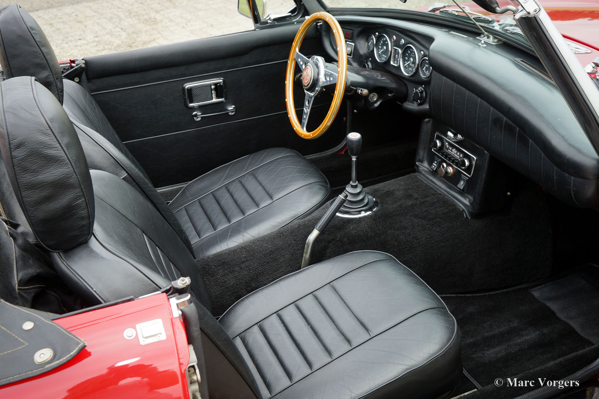 MG MGB Roadster, Jahr 1969. Farbe rot mit einem schwarzen Leder Interieur, schwarzes Verdeck und Verdeck-Abdeckung. Dieser wunderschöne MGB-Roadster wurde vor einigen Jahren in den Niederlanden sehr weitgehend restauriert. Diese MGB ist in einem hervorragenden super Zustand und das Auto fährt perfekt! Das Auto kommt komplett mit einer umfassenden (Service-) Geschichte. Die MGB verfügt über Chromdrahträder, ein Edelstahl-Auspuff, ein Chrom-Gepäckträger, ein Moto-Lita Sportlenkrad und ein original BMC Radio im Armaturenbrett! Dieser MGB Roadster ist ganz bereit mit Ihnen das offene Fahrerlebnis zu genießen!