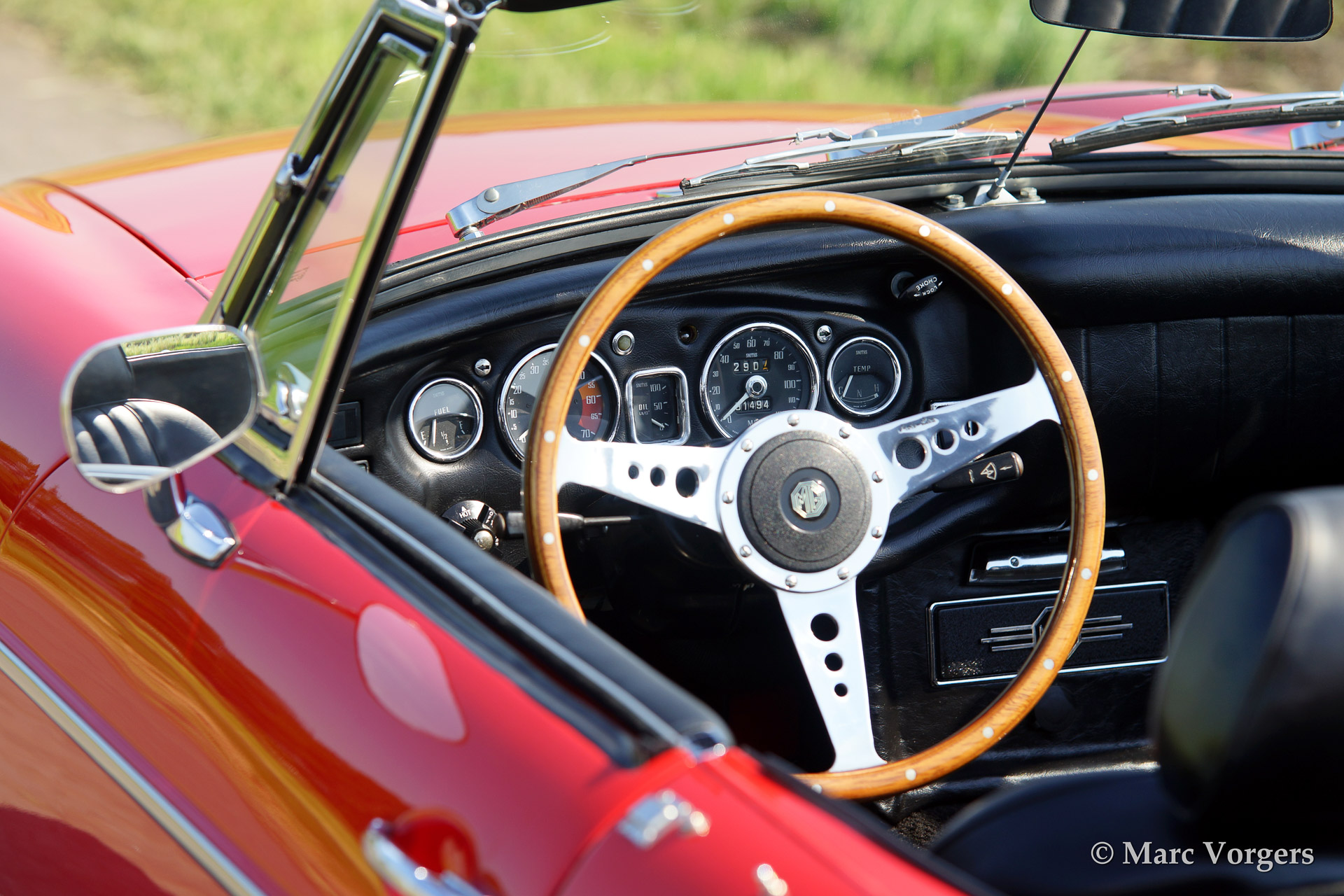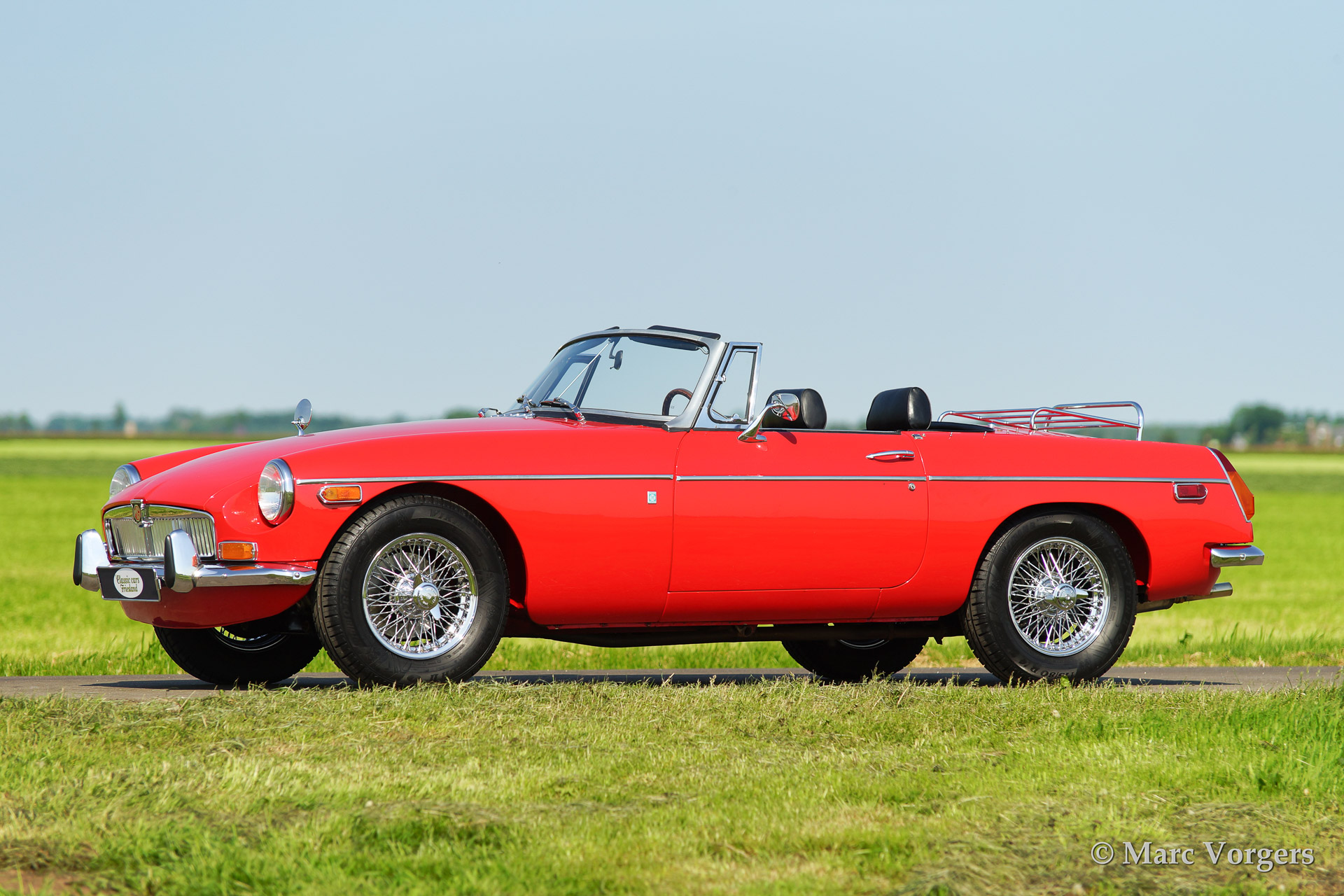 MG MGB roadster, year 1970. Colour red with a black leather interior. This fine MGB roadster was extensively restored. The original US specification side lights were retained. This MGB sports chrome wire wheels and a chrome luggage rack.