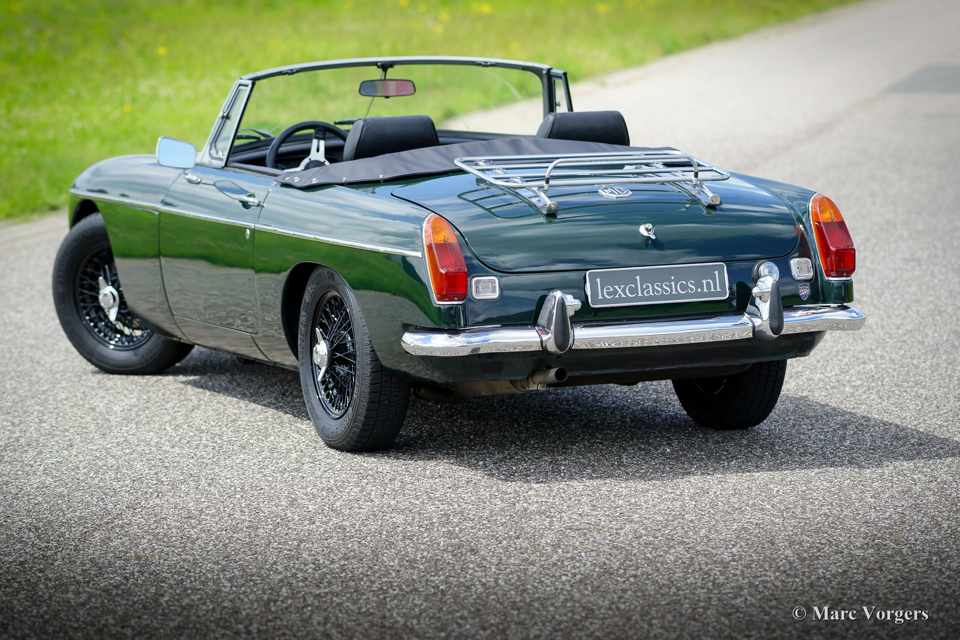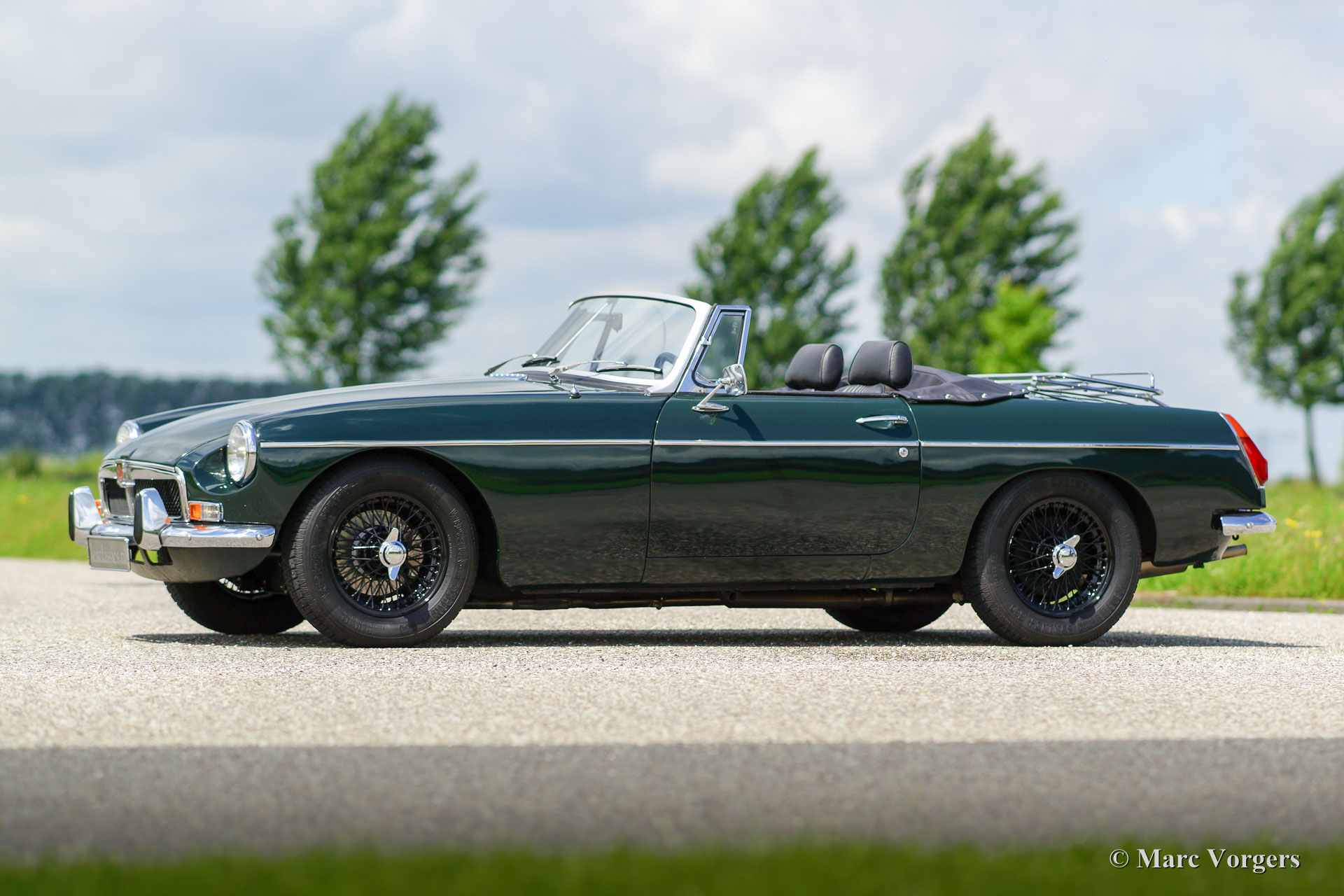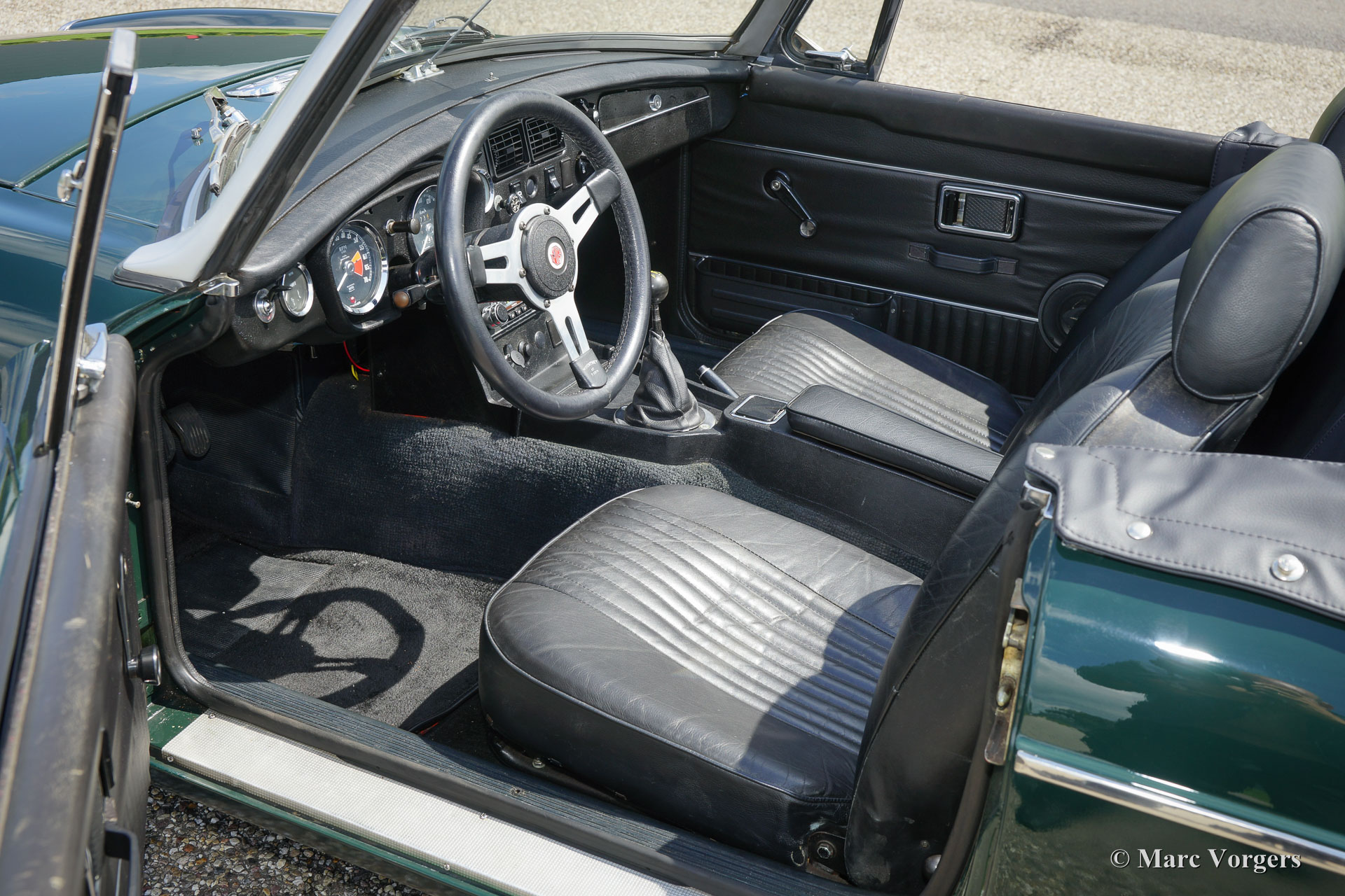MG MGB Roadster, Jahr 1971. Farbe British Racing Green mit einem schwarzen Interieur und schwarzen Teppich. Schwarz Soft-Top und Verdeck-Abdeckung. Dieser schöne MGB Roadster ist in einem guten bis sehr guten Zustand und das Auto fährt sehr gut! Diese MGB wurde neu in den Niederlanden verkauft; es ist also ein europäisches Modell. Das Auto wurde in der Vergangenheit restauriert. Eine Übersicht der Serviceintervalle ist vorhanden. Dieser MGB ist ausgestattet mit schwarzen Lackdraht Räder, Chrom 'knock off' Radmuttern, Overdrive, Chrom Gepäckträger, Leder Verdeck-Abdeckung, Sportlenkrad mit Lederrand, Radio und eine 12V-Steckdose. Ein sehr schönes Fahrer Auto das man auf schönen sonnigen Tage zum volle genießen kann!