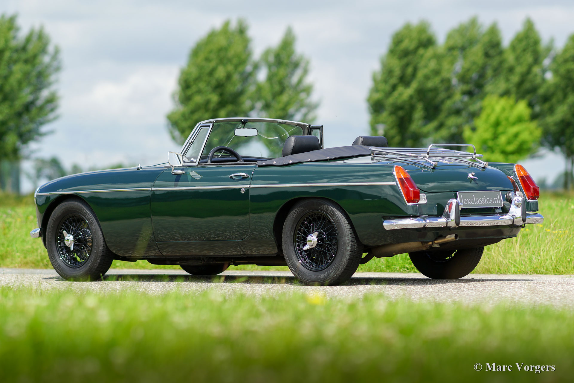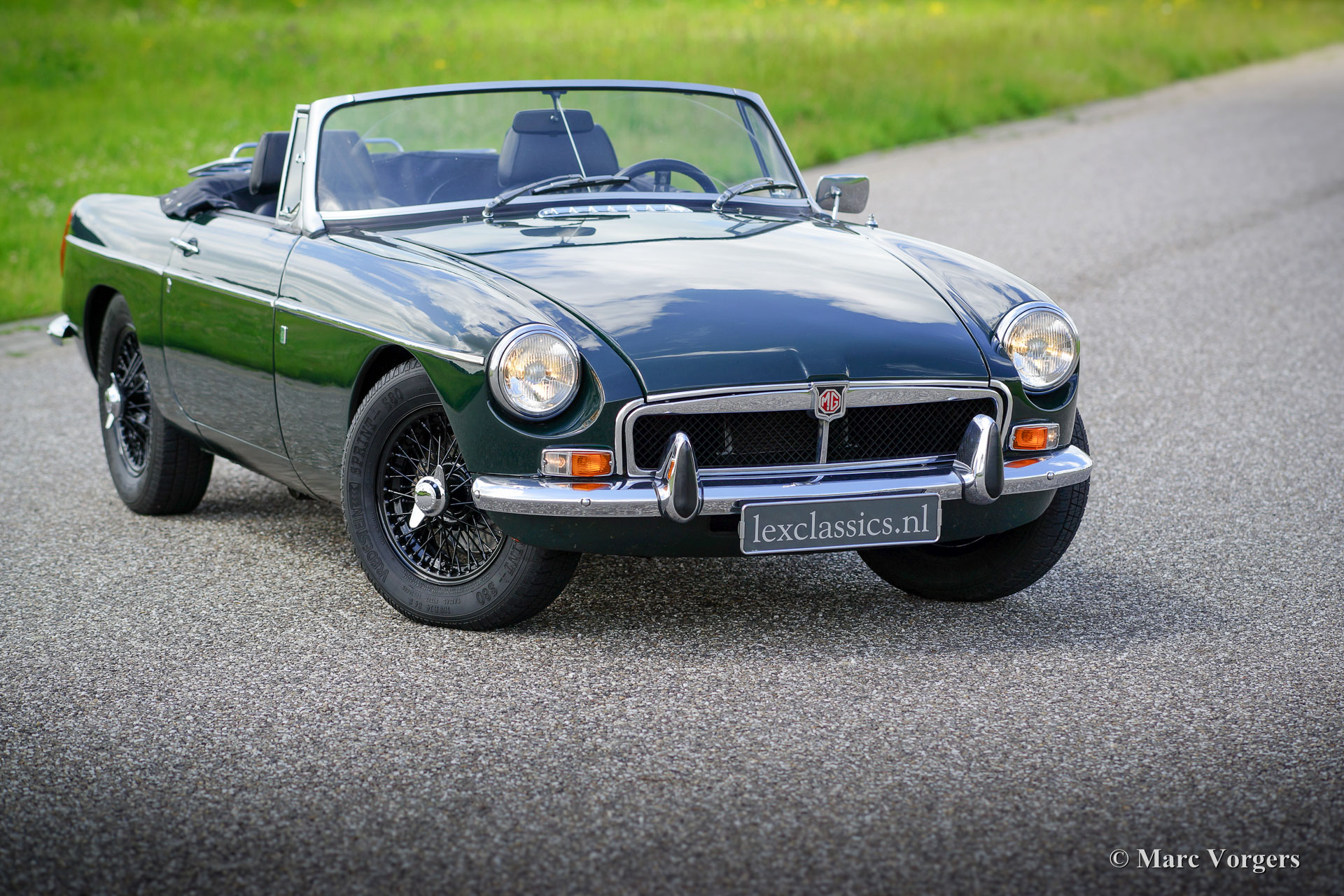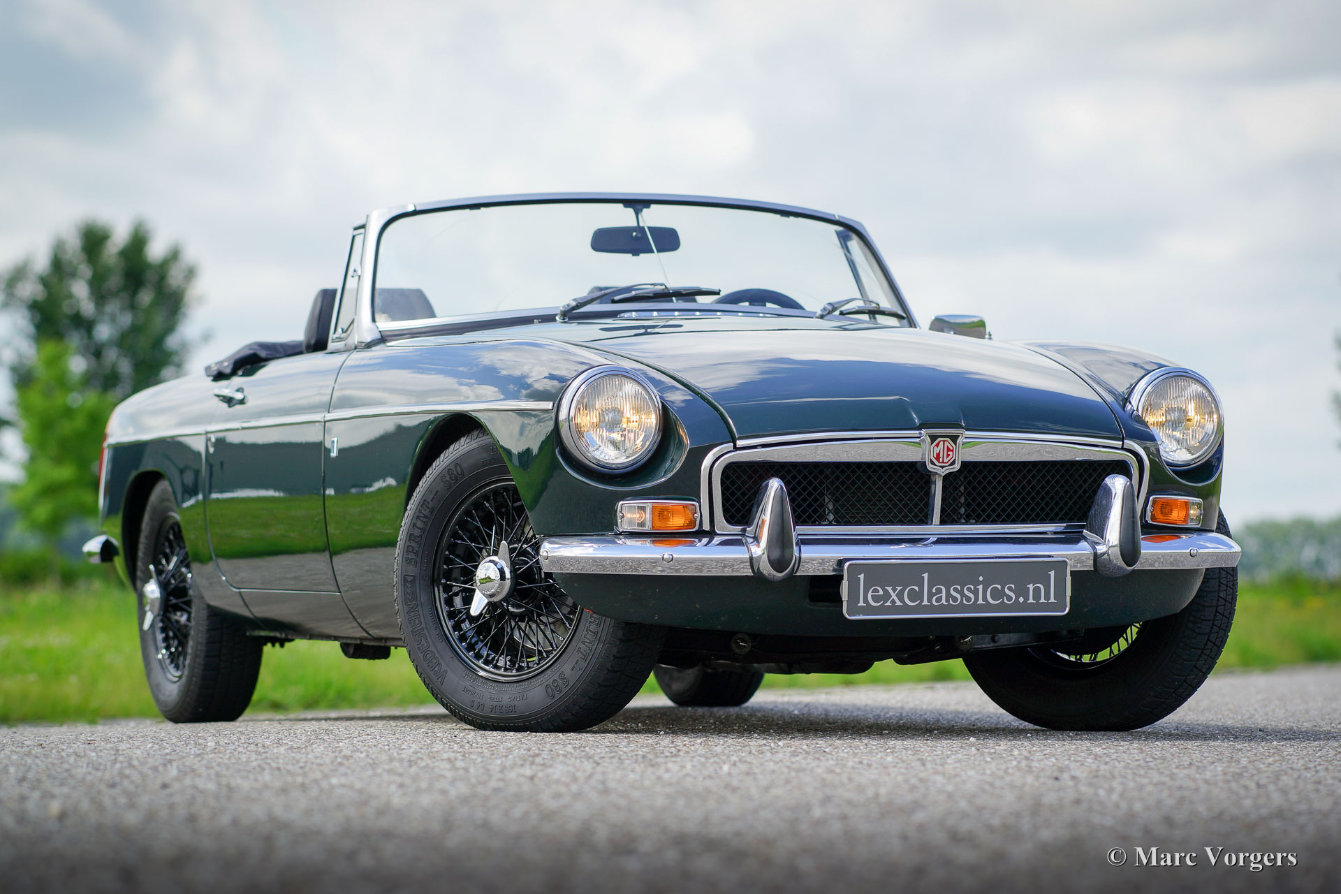 MG MGB Roadster, Jahr 1971. Farbe British Racing Green mit einem schwarzen Interieur und schwarzen Teppich. Schwarz Soft-Top und Verdeck-Abdeckung. Dieser schöne MGB Roadster ist in einem guten bis sehr guten Zustand und das Auto fährt sehr gut! Diese MGB wurde neu in den Niederlanden verkauft; es ist also ein europäisches Modell. Das Auto wurde in der Vergangenheit restauriert. Eine Übersicht der Serviceintervalle ist vorhanden. Dieser MGB ist ausgestattet mit schwarzen Lackdraht Räder, Chrom 'knock off' Radmuttern, Overdrive, Chrom Gepäckträger, Leder Verdeck-Abdeckung, Sportlenkrad mit Lederrand, Radio und eine 12V-Steckdose. Ein sehr schönes Fahrer Auto das man auf schönen sonnigen Tage zum volle genießen kann!