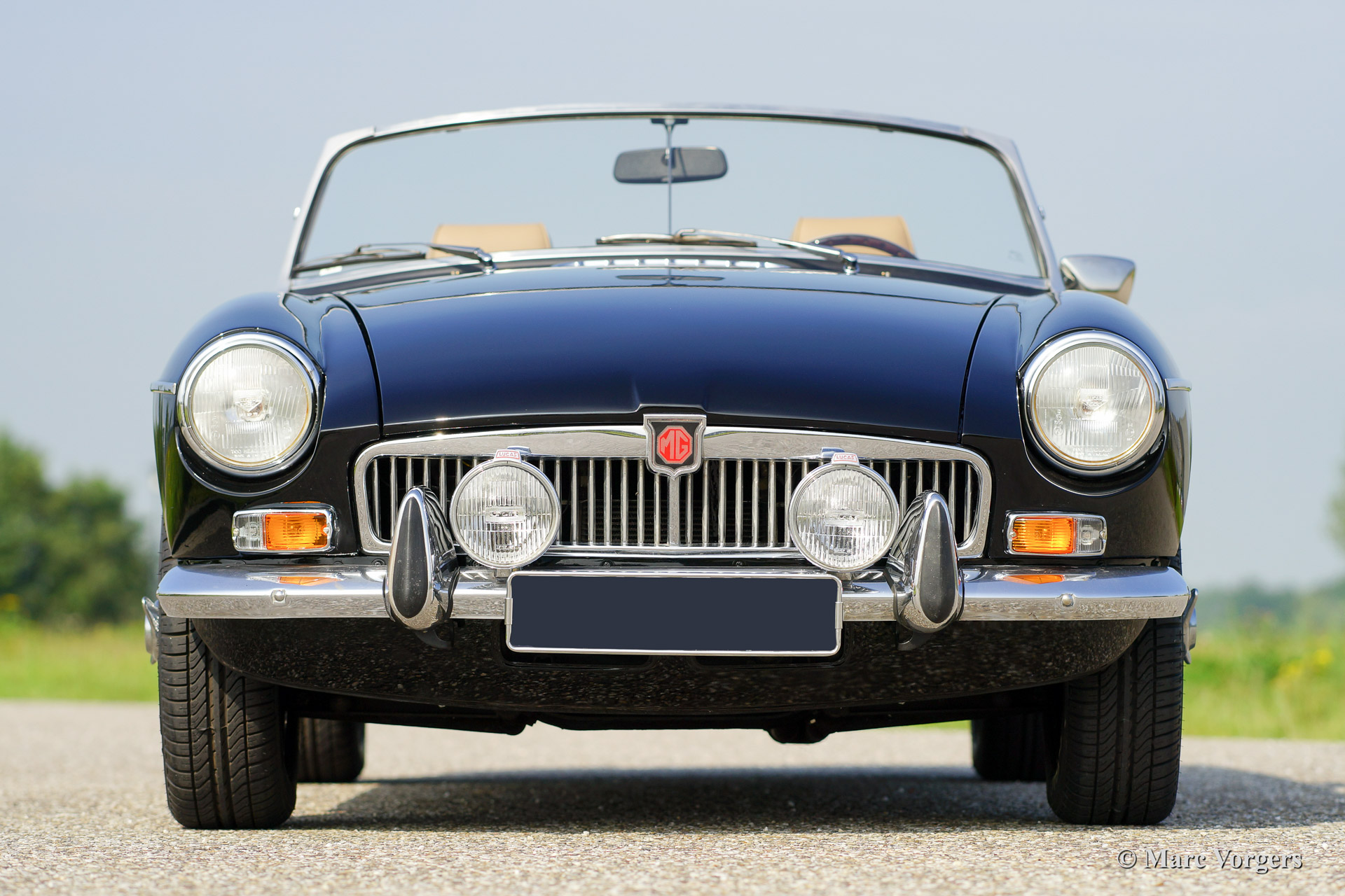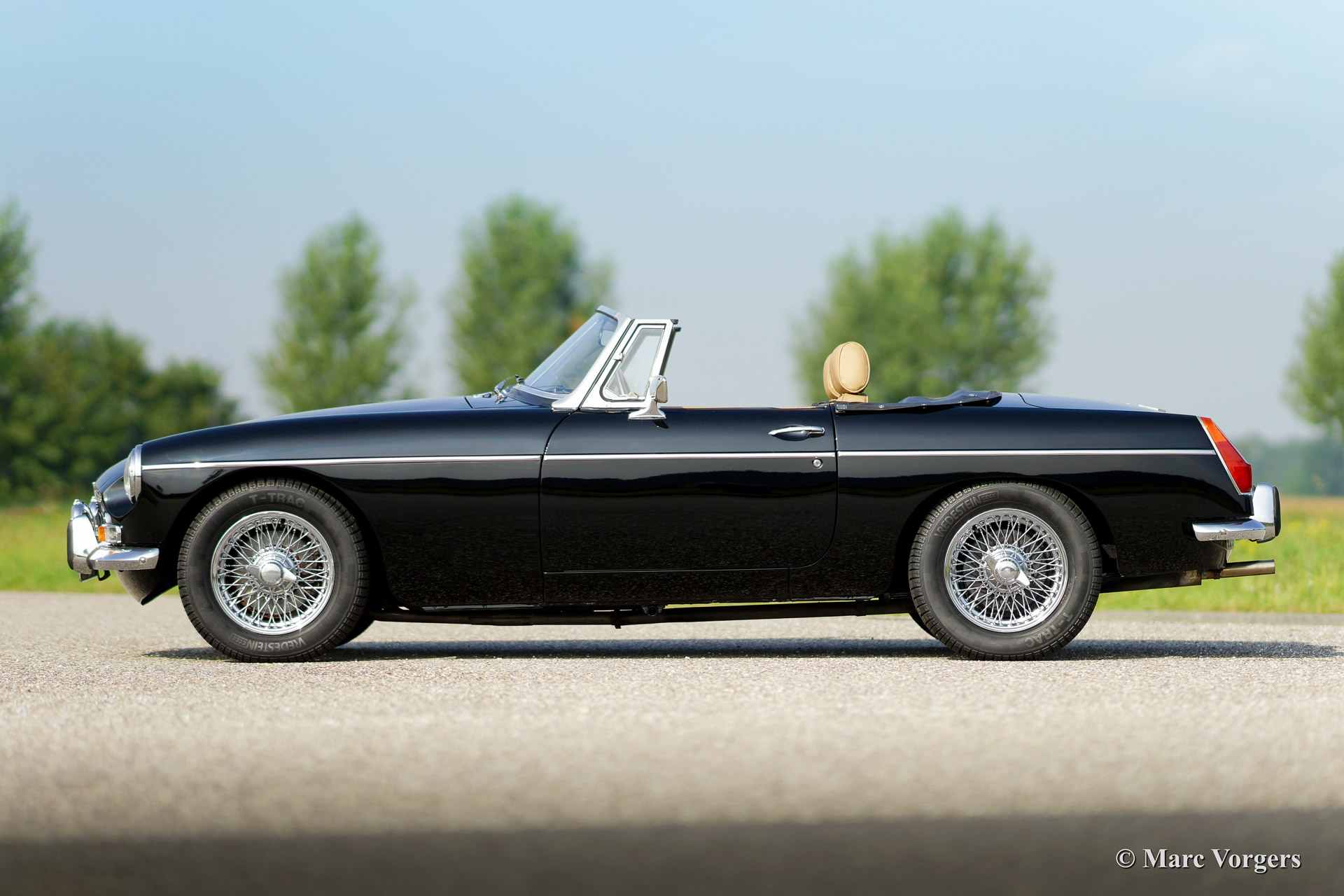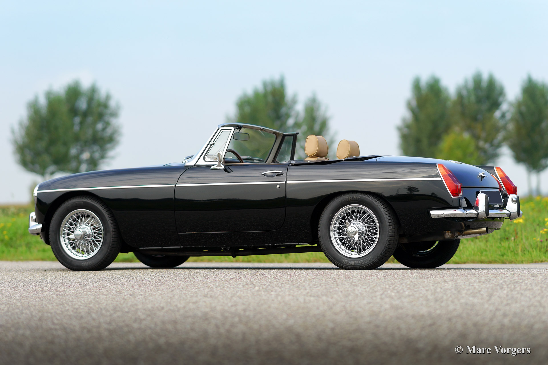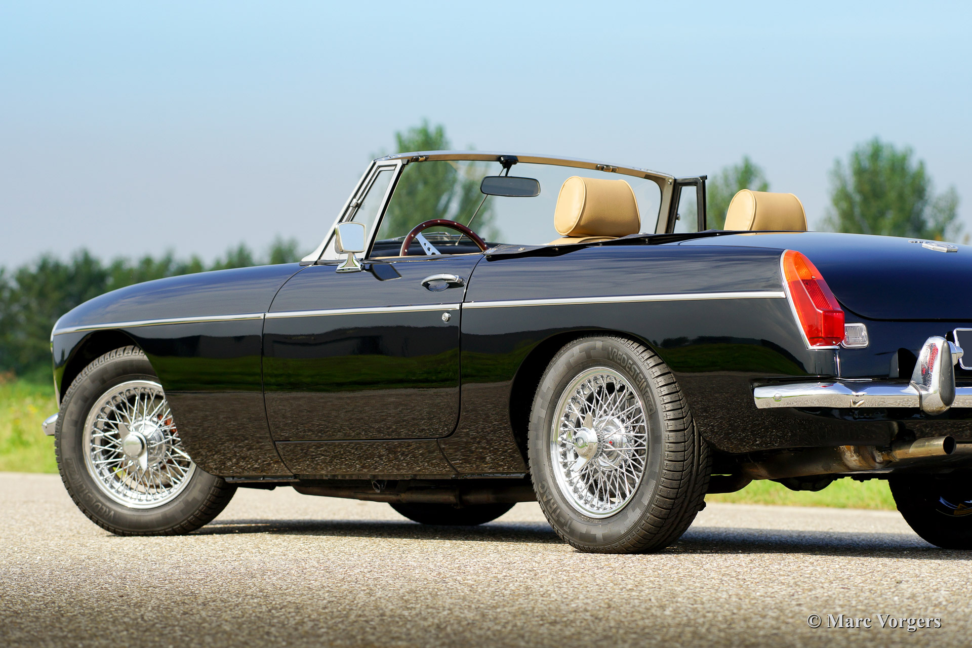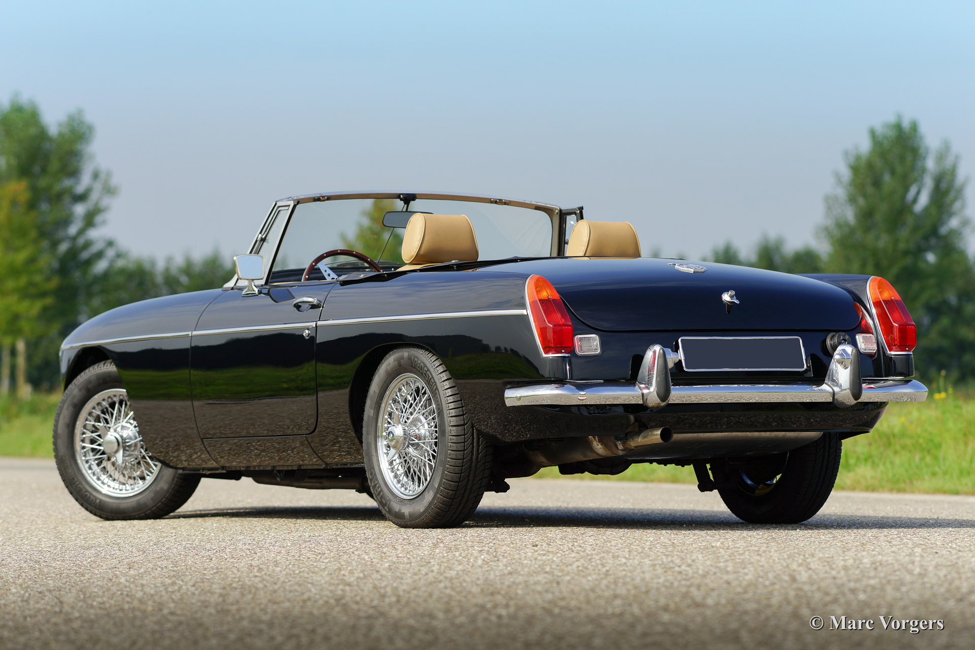 MG MGB roadster, year 1973. Colour black with a (tan) beige leather interior. Black soft top, hood cover and tonneau cover. This MGB was sold new to the Netherlands. The automobile features overdrive, chrome wire wheels, additional driving lamps at the front, AC dynamo, Stainless Steel exhaust and a beautiful sports steering wheel.