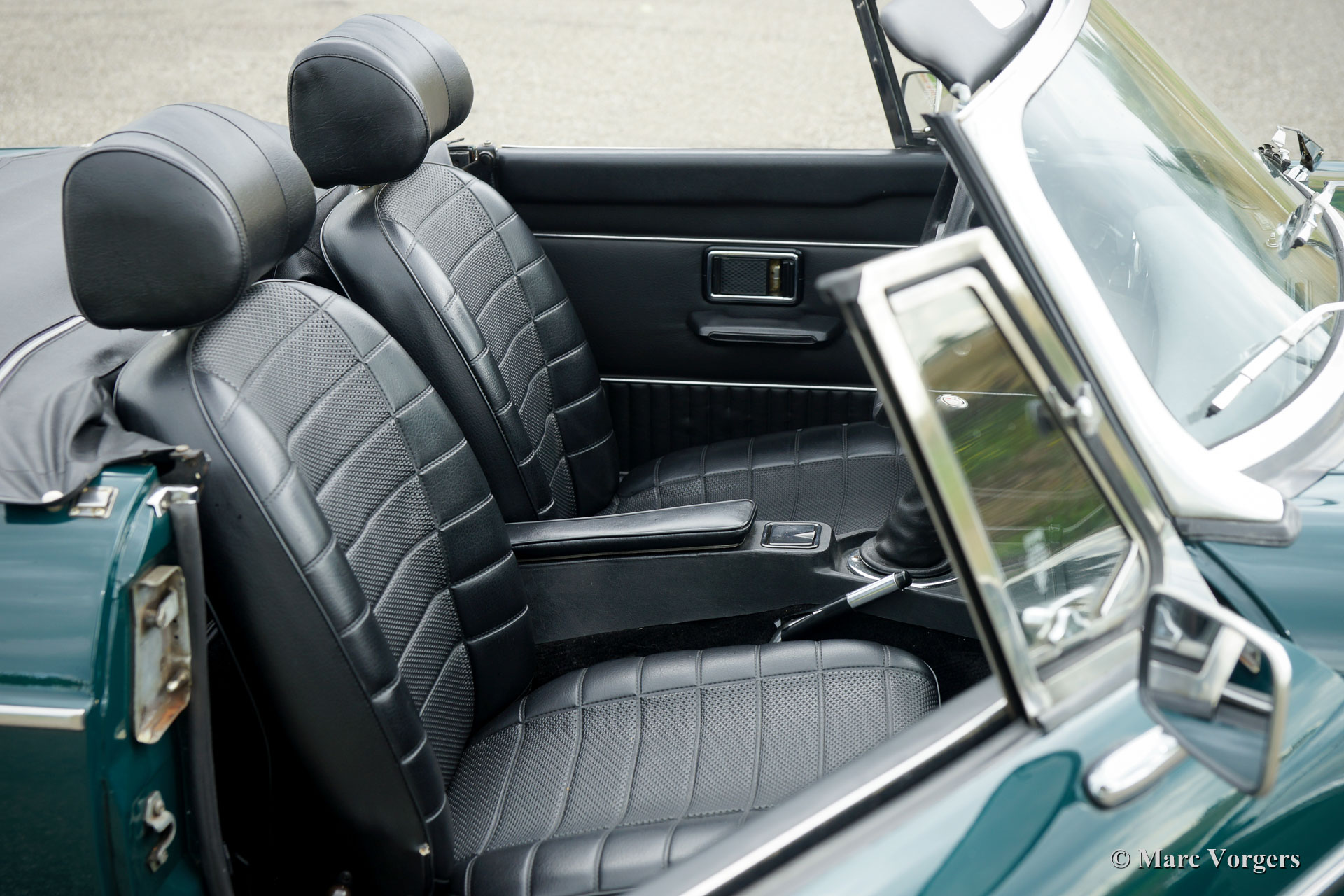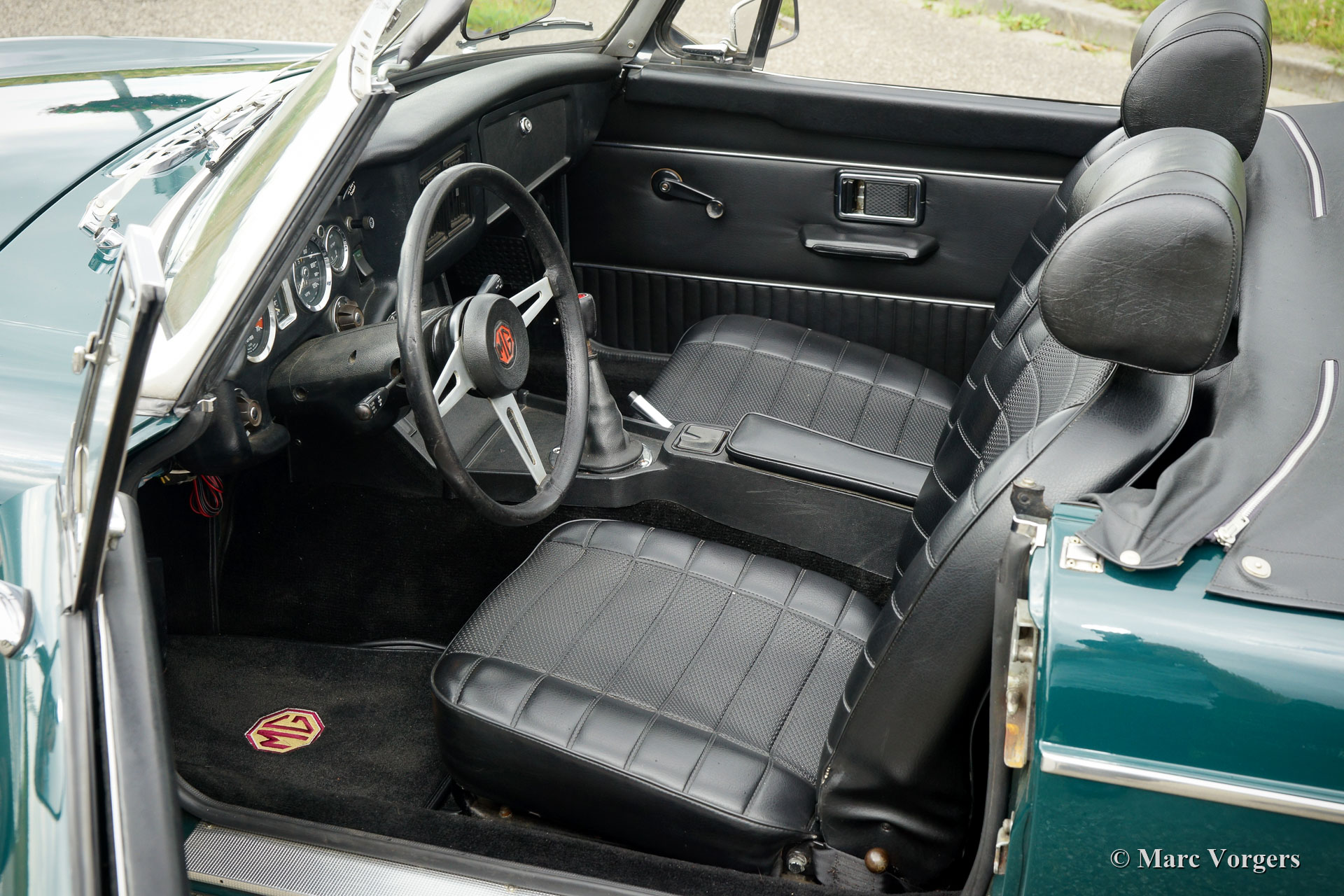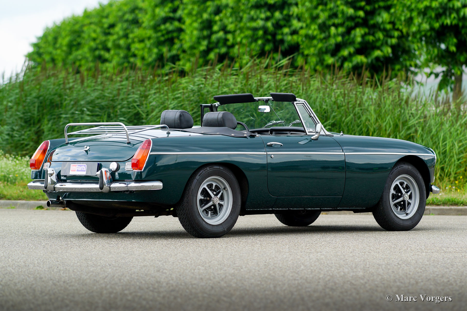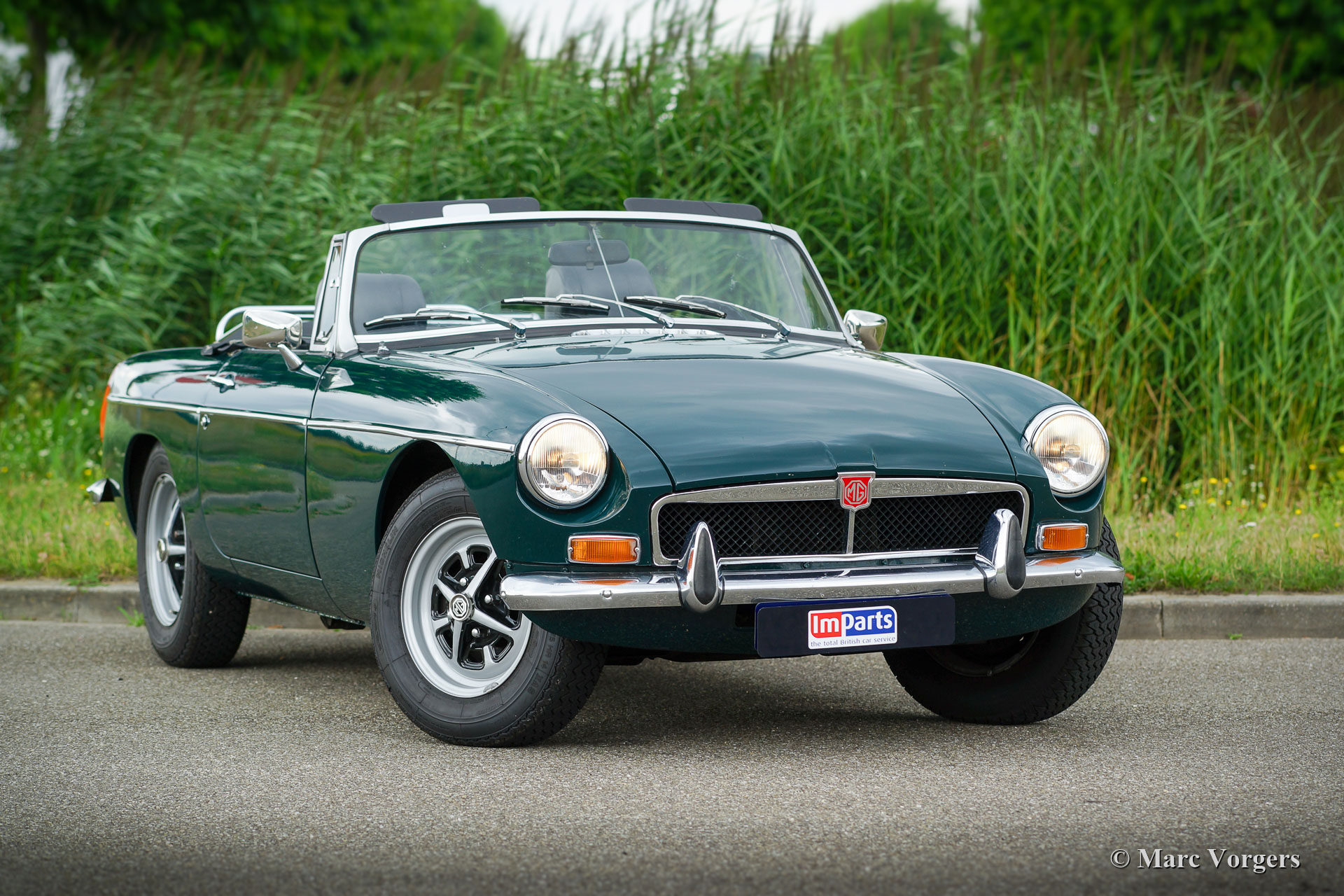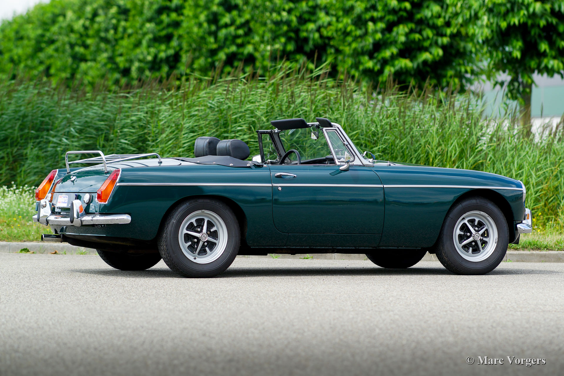 MG MGB Roadster, Jahr 1973. Farbe British Racing Green kombiniert mit einem schwarzen Kunstleder Interieur und schwarzem Teppich. Schwarzes Verdeck und Verdeck Abdeckung. Dieser schöne MG MGB Roadster wurde in der Vergangenheit umfassend nach originalen Spezifikationen restauriert. Das Auto ist in einem sehr guten Zustand und das Auto fährt herrlich! Dieser feine MGB-Roadster verfügt über die originalen Rostyle-Stahlräder, eine verchromte Gepäckablage, zwei an die Türen angebrachte Rückspiegel, eine Persenning und Sicherheitsgurte. Dieser MGB ist bereit für jedes Abenteuer in den Händen eines neuen Besitzers!