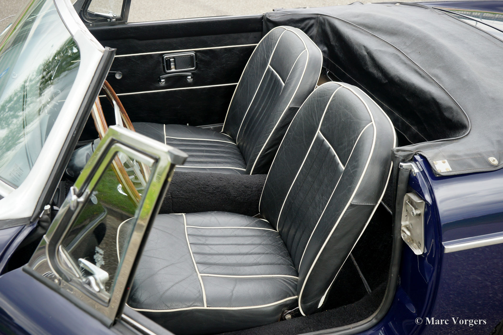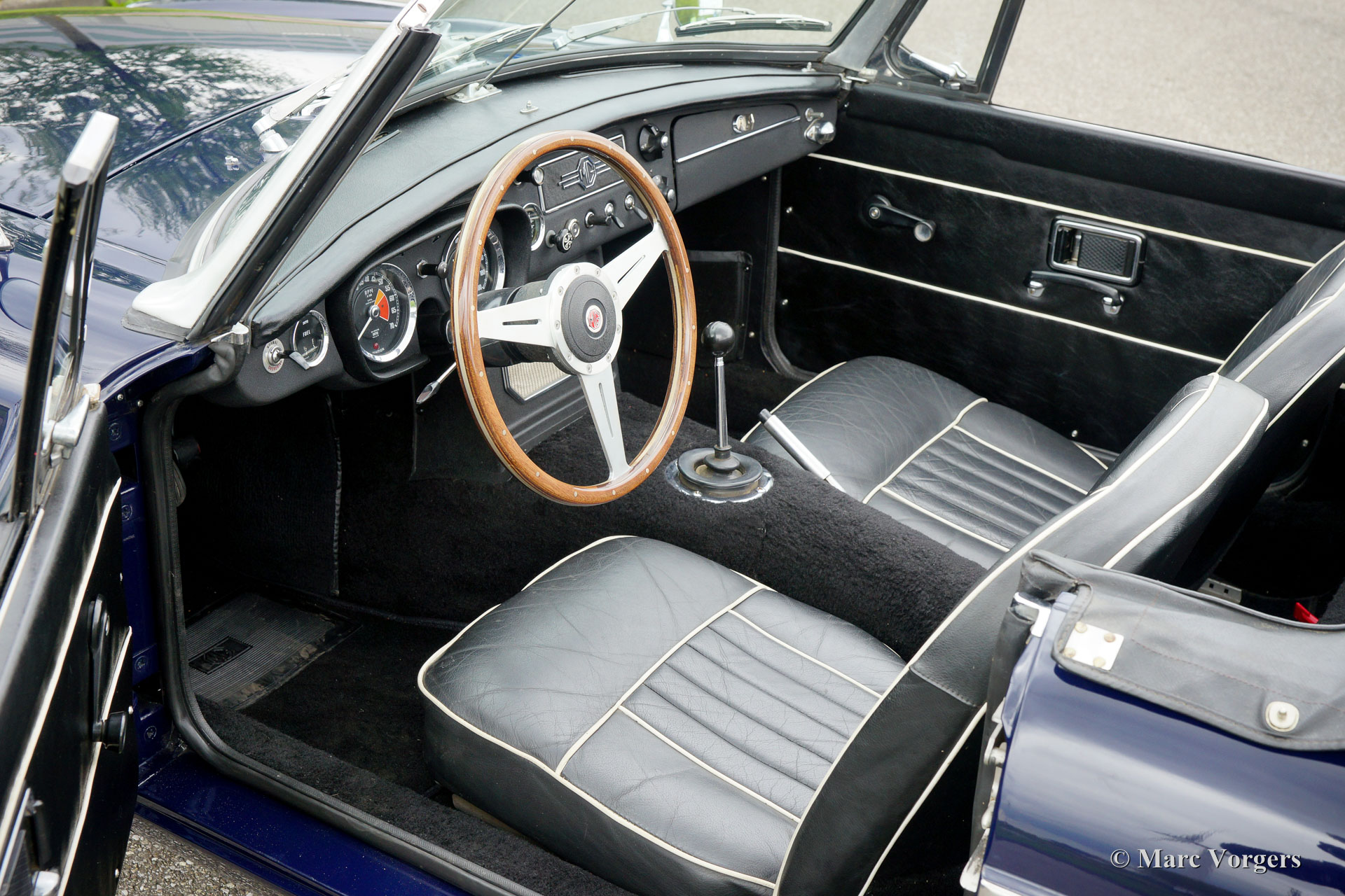 MG MGC Roadster, Jahr 1969. Farbe dunkelblau (Midnight Blue) mit einem schwarzen Leder Interieur und schwarzem Teppich. Schwarzes Mohair-Soft-Top und schwarzer Vinyl-Verdeck-Abdeckung. Dies ist ein relativ seltener MG MGC Roadster mit einem Sechszylinder-Motor. Das Auto ist in einem sehr guten Zustand und der Wagen fährt sehr gut! Dies ist ein europäischer LHD (links-lenker) MGC mit einer dokumentierten Servicegeschichte. Dieser wunderschöne Roadster verfügt über Overdrive, neue Chrom-Speichen-Räder, einen neuen Edelstahl-Auspuff, eine neue Kupplung, überholte Lenkung, neue Blattfedern und Spax-Stoßdämpfer rundum.
