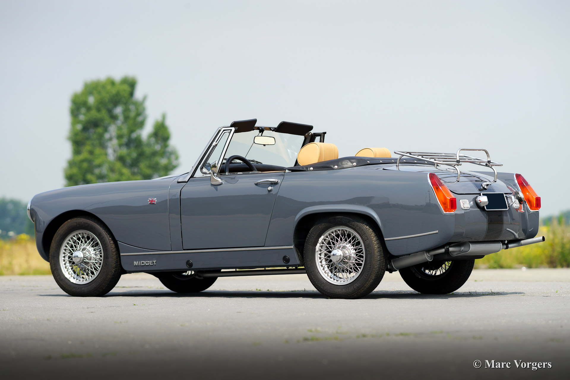 MG Midget 1500, Jahr 1978, Farbe Grau mit einem beige Vinyl Interieur. Dieses herrliche Midget der letzten Generation wurde vor kurzem weitgehend restauriert, das Auto hat seitdem nur wenige Kilometer gelaufen. Das Auto ist in einem hervorragenden Zustand. Die Stoßfänger wurden gelöscht und das Auto wurde eine sportliche Optik gegeben durch zusätzliche Scheinwerfer und schwarzen Striping. Der Maschinenraum und das Innere in jedem Detail fertig. Das Auto ist mit Speichen Räder, Chrom-Gepäckträger und ein Sportlenkrad mit Lederrand versehen.