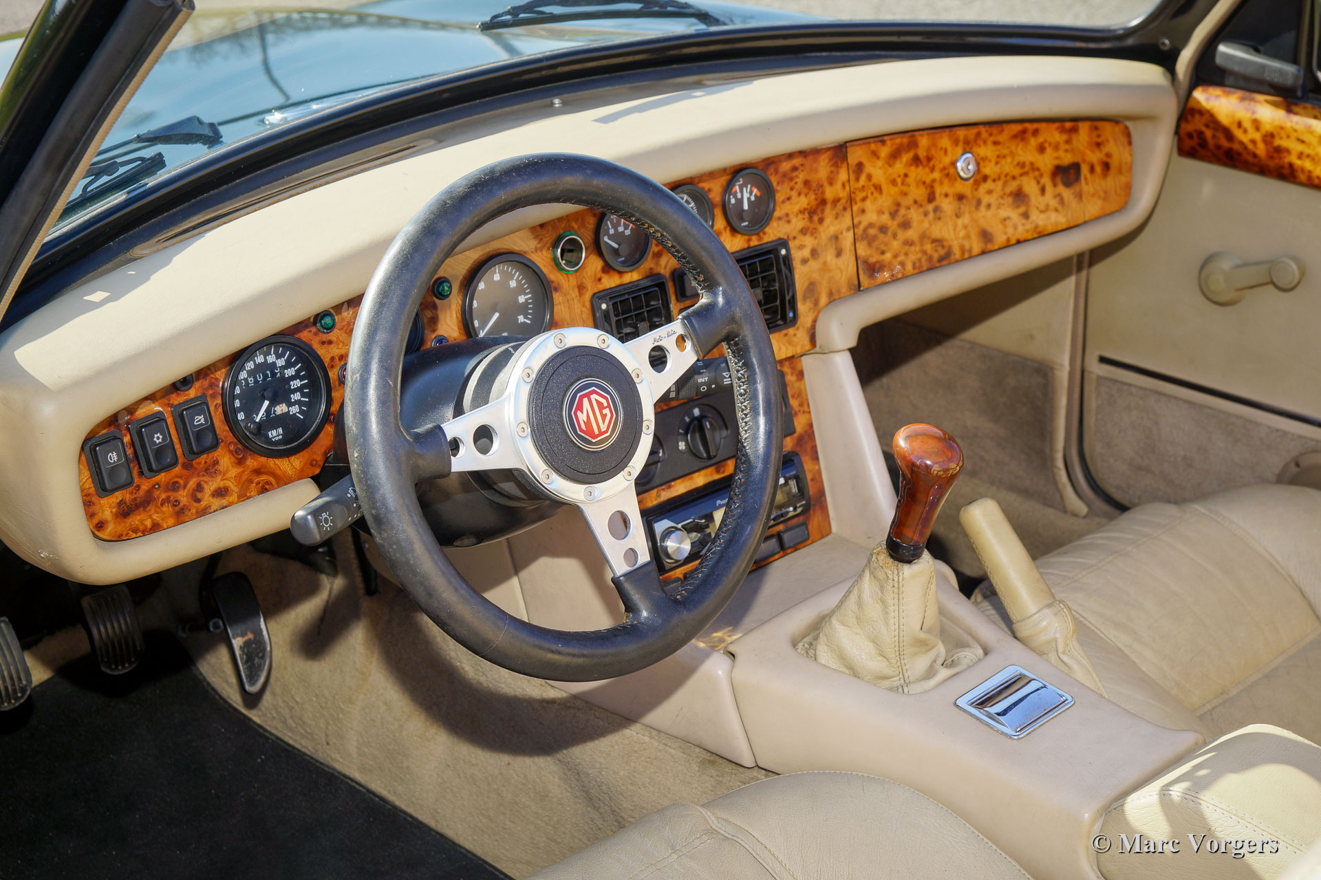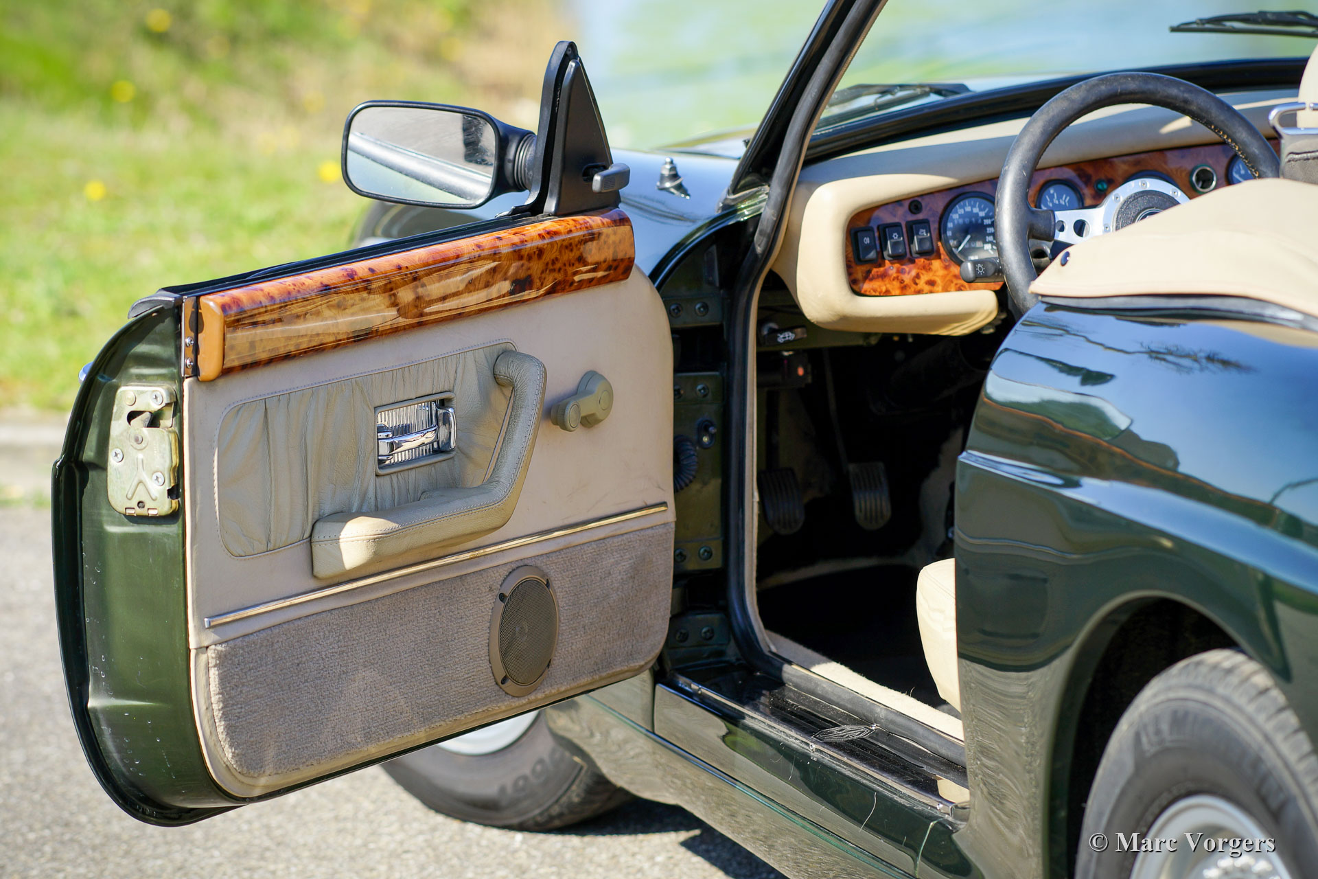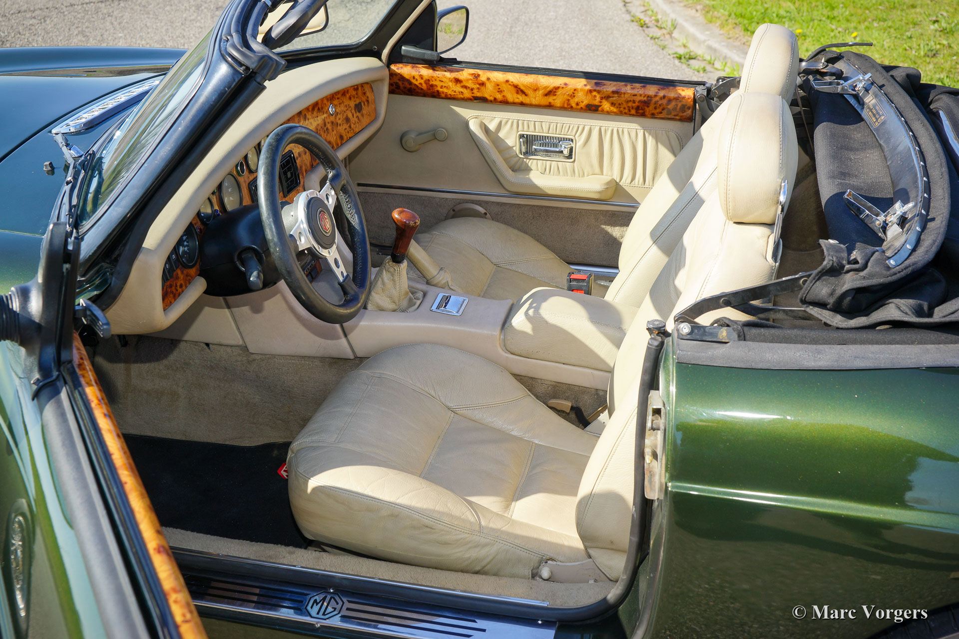 MG RV 8, Jahr 1996. Farbe grün metallic (Woodcote Green) kombiniert mit einer beigen Lederausstattung, einem beigen Teppich und schwarzen Schutzmatten. Schwarzes Mohair-Verdeck und beige Vinyl-Persenning. Dieser sehr schöne MG RV 8 wurde 2015 aus Japan in die Niederlande importiert. Dann wurde das Auto auf Linkslenker (LHD) mit Servolenkung umgestellt, was eine komplexe und kostspielige Operation war. Dabei wurde die Klimaanlage entfernt. Dieser MG RV 8 befindet sich in einem sehr guten Zustand! Der MG RV 8 ist mit dem legendären und leistungsstarken Rover V8-Motor ausgestattet. Das Auto verfügt über ein luxuriöses Interieur mit Lederpolstern und einem Armaturenbrett aus Walnussholz. Der Innenraum weist leichte Gebrauchsspuren auf. Der MG RV 8 ist ein seltenes Auto, nur 1983 Exemplare wurden hergestellt (alle Rechtslenker) und 1579 Autos nach Japan verkauft. Dieser begehrenswerte MG RV 8 fährt perfekt, der Motor ist sehr leistungsstark und es klingt fantastisch!